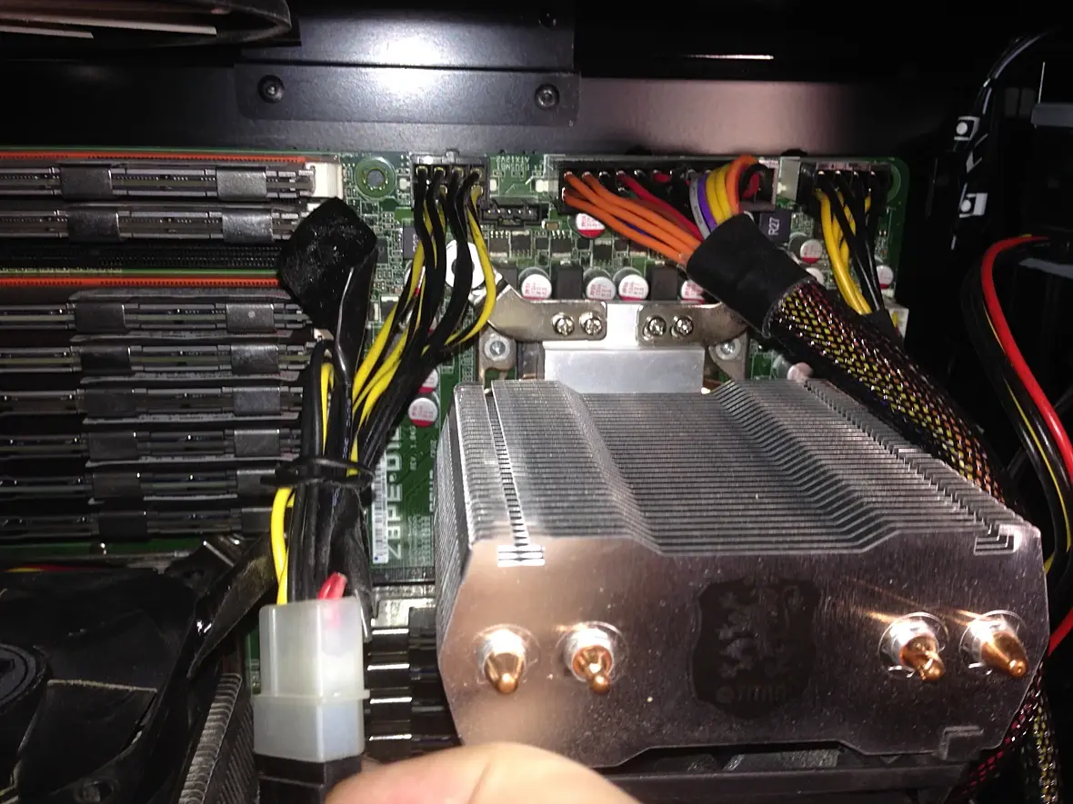 объясню на пальцах проблему с БП, у вас один проц запитан через молекс, молекс рассчитан на максимальный ток в 11А(ампер), что означает 132 ватта мощности, у вашего проца тдп 95 ватт, плюс VRM имеет не 100% кпд, значит мощности нужно больше. В 8пиновом разъеме стоят контакты по 8 ампер, то есть суммарная пропускная способность на 4 линии по 12 вольт 32 ампера то есть 384 ватта, как вы думаете, если производитель заложил эту мощность то зачем? Вполне возможно , что у вас уже начали подгорать контакты. Если навешать тройников на розетку и подключить слишком высокую мощность, то у вас вышибет пробки, или случится пожар. Проверять ОЗУ и все остальное пока не замените БП бессмысленно. Кстати эти платы начали выпускать 10 лет назад, и я бы действительно проверил термопасту под радиаторами мостов.