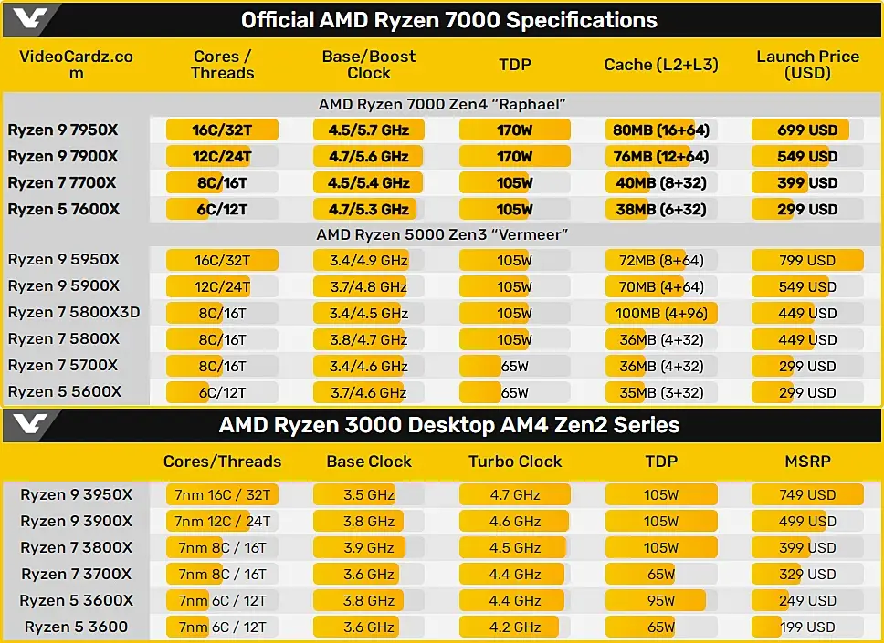 А вот цены слишком рано обсуждать. Слишком много спекуляций на основе плейсхолдер ценников. Видел уже и в 2000$ и в 1500$ и в 900$ и в 600$ за 7950X, гадание на кофейной гуще Так же и с материнскими платами. Так же было и с 3000 и с 5000 Райзенами. Сложно угадать и предсказать. 1usmus говорит что к этому всему еще добавиться более жесткий дефицит топовых чиплетов под 7900X/7950Х, жеще чем во времена релиза 5950Х. Отчасти думаю потому они сразу и собираются выпустить 7700X с дохлыми чиплетами а 7800Х выйдут позже скорее всего. Не хотят усугублять ситуацию. Предположение.