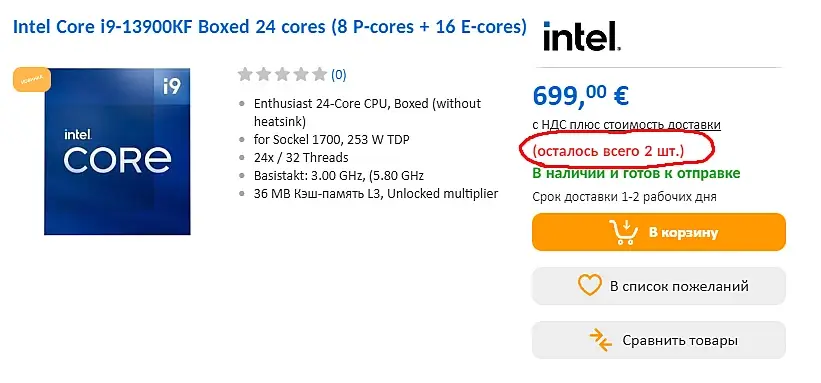 Вообще я смотрю похоже Raptor Lake будут в жесточайшем дефиците. На Нью-Эгге, Амазоне. Да везде вообще. Их в ноль скупили все. Нету нифига их. Как бы не повторилась ситуация как была с 9900К. Когда в первый день его продавали по 550 баксов а через пару дней цена выросла до 1200$. И только через месяца 4 его можно было более менее спокойно купить.