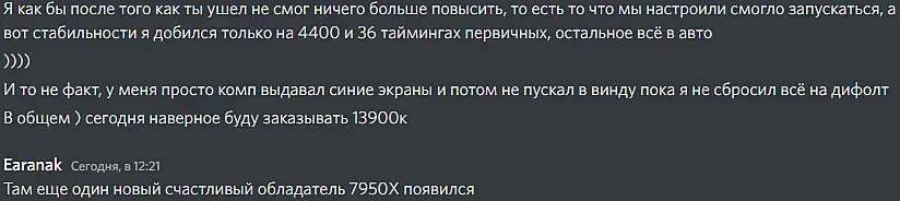 Вчера имел дело с настройкой 128гб DDR5 памяти на 7950X и MSI B650 Mortar, это катастрофа Чем то напомнило времена Ryzen 1000 на релизе. GearDown не настроить, CR1 не выбрать. Тренинг таймингов ужасный, запуск платы на каждом этапе идет от 2 до 5 минут (даже если включить запоминание натрененных таймингов). Память выше 4800Mhz с авто не заводится, вообще. Авто тайминги - посмешище. В Авто память стартует на 3600Mhz выдавая 50гб ПСП и 95ns Latency Я другана отговариваю пока выкидывать в помойку 7950Х, хотя он прям хочет уже выкинуть его, посидели немного... Руками смогли кое как с горем пополам дождать 4800Mhz/CL30, tRFC снизить. Вольтажи руками подкрутить. Последний раз что вышло - 62GB ПСП и 75ns Latency. Ну что-ж... Почти догнали по задержкам 3200Mhz DDR4 у 5950X.