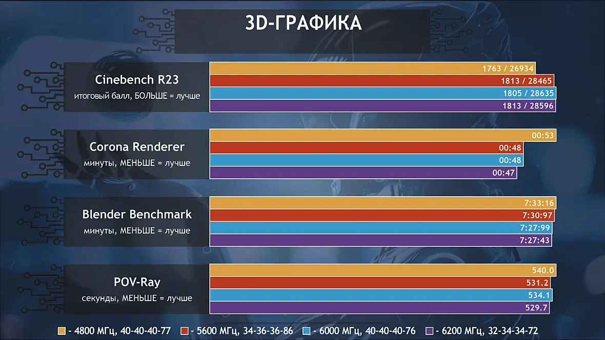 рендеринг хорошо кешируется, поэтому там особо разгон памяти не влияет. Разгон влияет на операции моделирования, где могут быть очень не очевидные структуры данных, не расположенные локально, и сложно кешируемые.