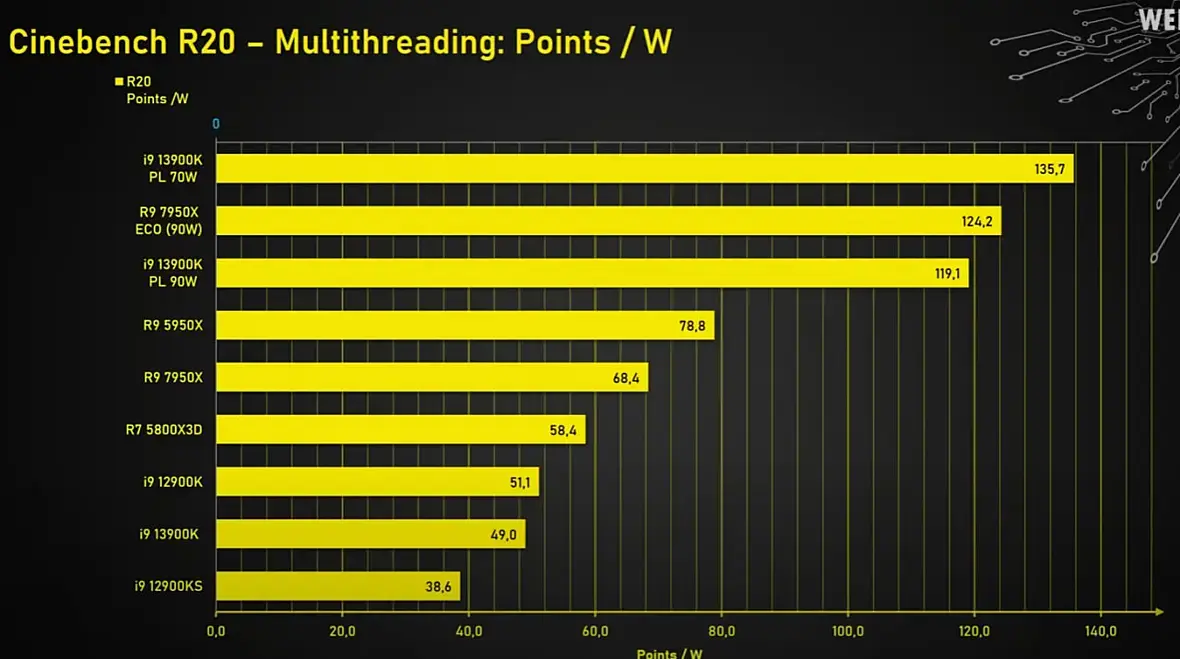 А вообще круто что походу 13900KF выходит энергоэффективнее чем 7950Х при 70вт и быстрее чем 5950Х в разгоне небольшом. По крайней мере судя по видосу Дербауэра, сам то я еще не пробовал. Да и в смешанных нагрузках (играх) он вообще при 70вт шпарит по кайфу - https://youtu.be/H4Bm0Wr6OEQ?t=884