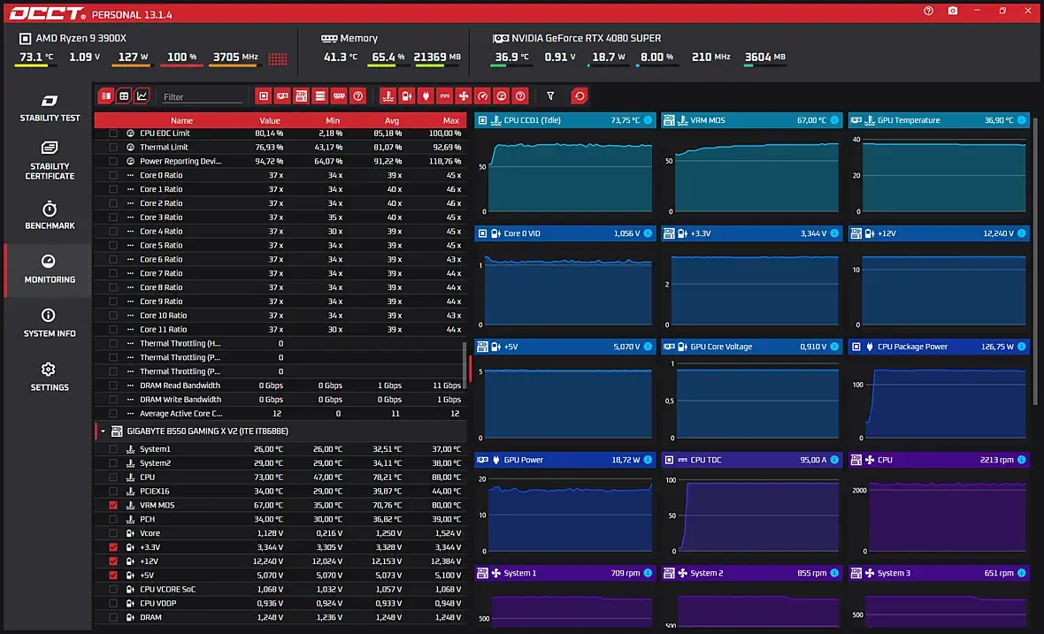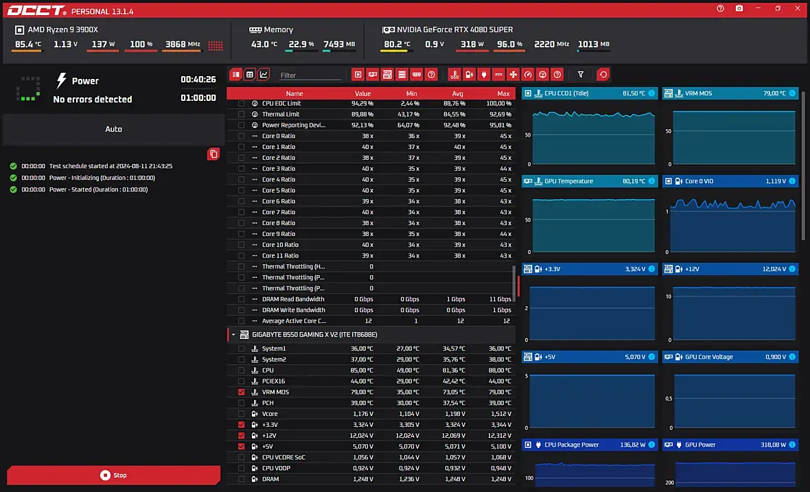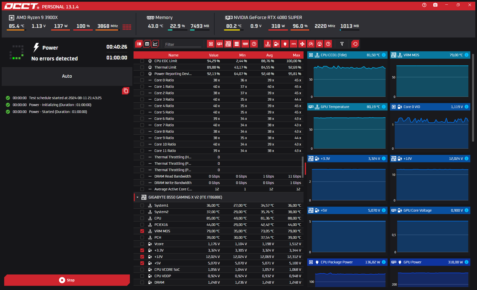 Тест OCCT Power выдержал 38минут. Дальше лень было тестировать - сбоев нет! VRM: 79 градусов CPU: 83 гр. GPU: 81 гр Метеринка: Gigabyte B550 Gaming X V2 Корпус jonsbo d41 mesh без верхней крышки. Охлаждение: 1. NZXT Kraken Z63 2*140mm радиатор сверху, вентиляторы на выдув вверх. 2. 120мм сзади на выдув 3. 2*140 снизу на подсос снизу - дуют по сути на 4080ti