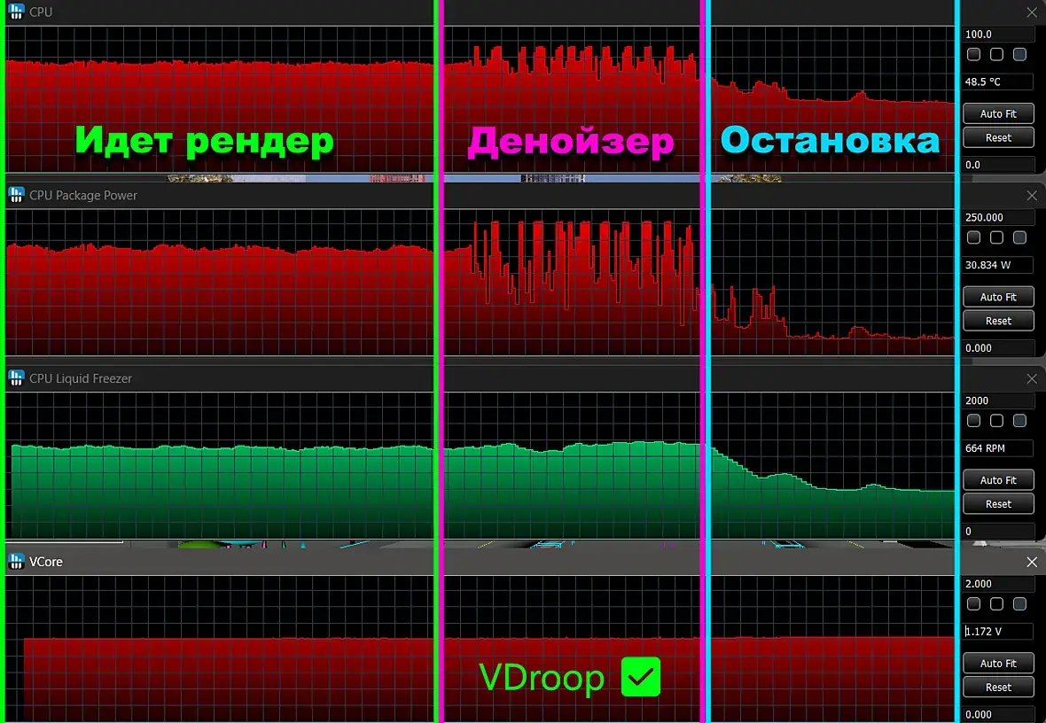 ) и не держит стабильно такую нагрузку, значит надо либо чуть снизить частоту либо чуть повысить вольтаж. Если это LLC виновато то скорее всего дело в VDroop-е или Овершуте, эти два момента прям ярковыражены во время Денойза. Тут уж не знаю как и что у вас, но тут надо быть аккуратным, сначала понять как ведет себя LLC, потом понемногу его настраивать так что бы во время Денойза был меньше VDroop, главное не переборщить. Ну или просто можно поднять частоту VRM до максимума. Если это плата позволяет конечно. Это сгладит VDroop/Овершуты и может стабилизировать проц.