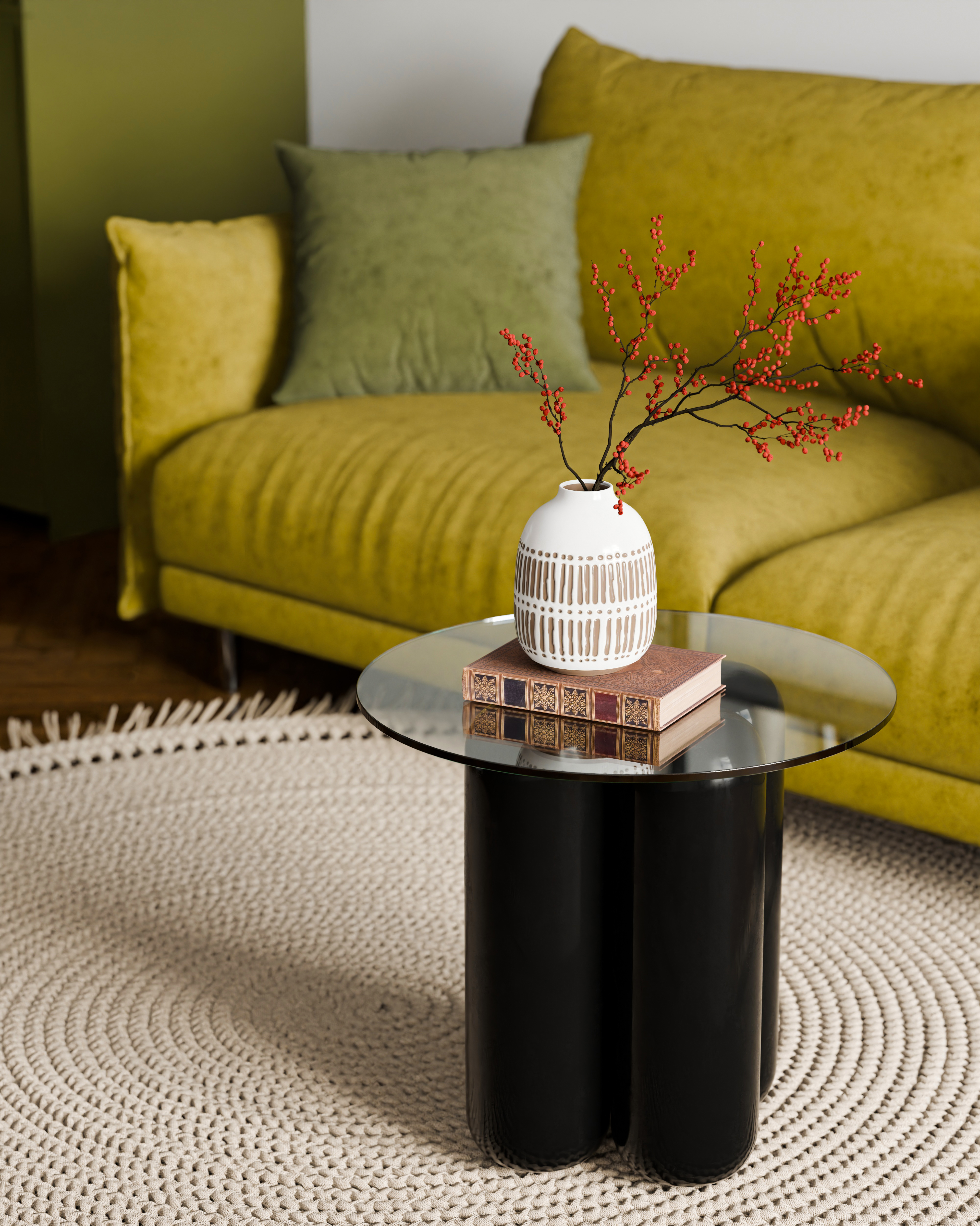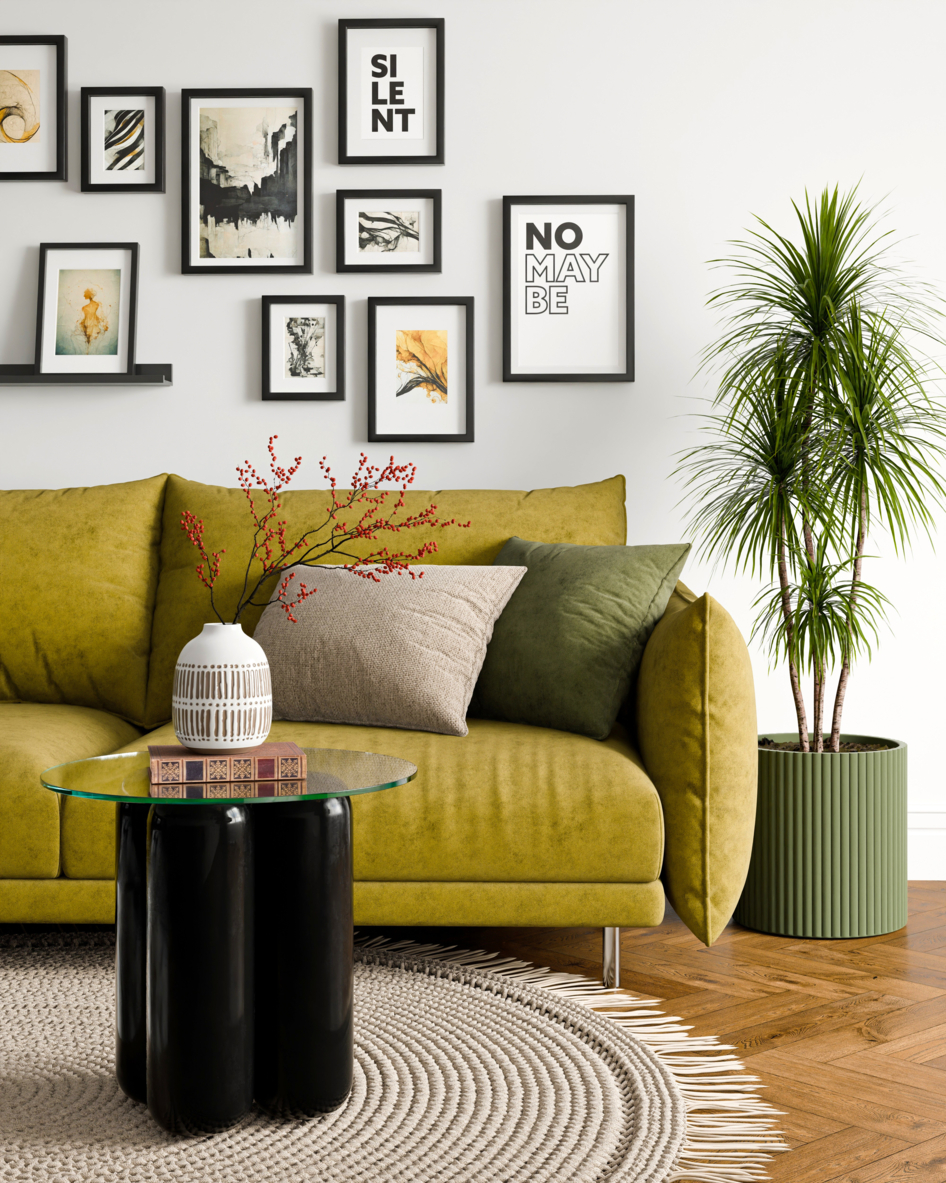 Эстетика простоты: горчичный диван, стеклянный столик и зелёные акценты создают атмосферу умиротворения. Здесь каждая деталь на своём месте. Soft: Blender, Cycles