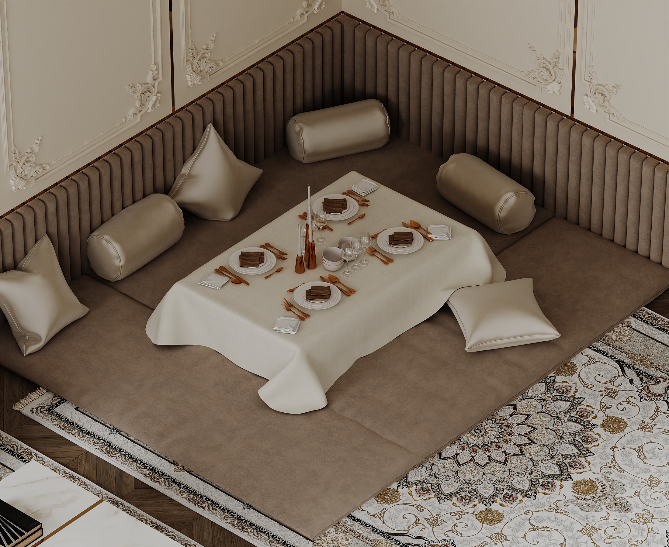 This cozy apartment interior is designed in a neoclassical style that brings together timeless elegance and modern comfort. The wall mouldings, luxurious chandelier, and soft textures combine perfectly with contemporary furniture and a warm color palette. The floor seating dining area adds a unique cultural touch, making the space both functional and soulful.