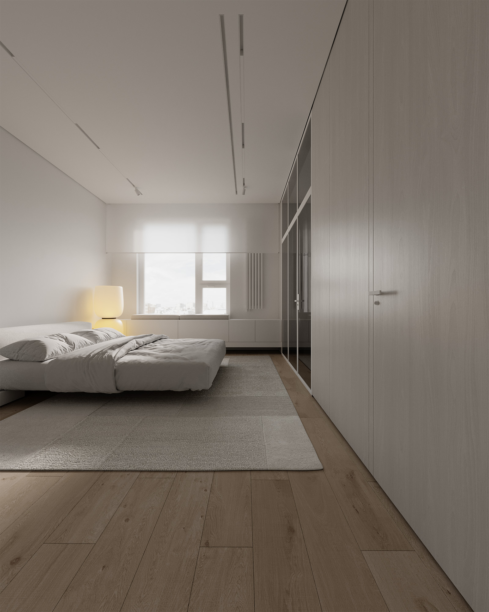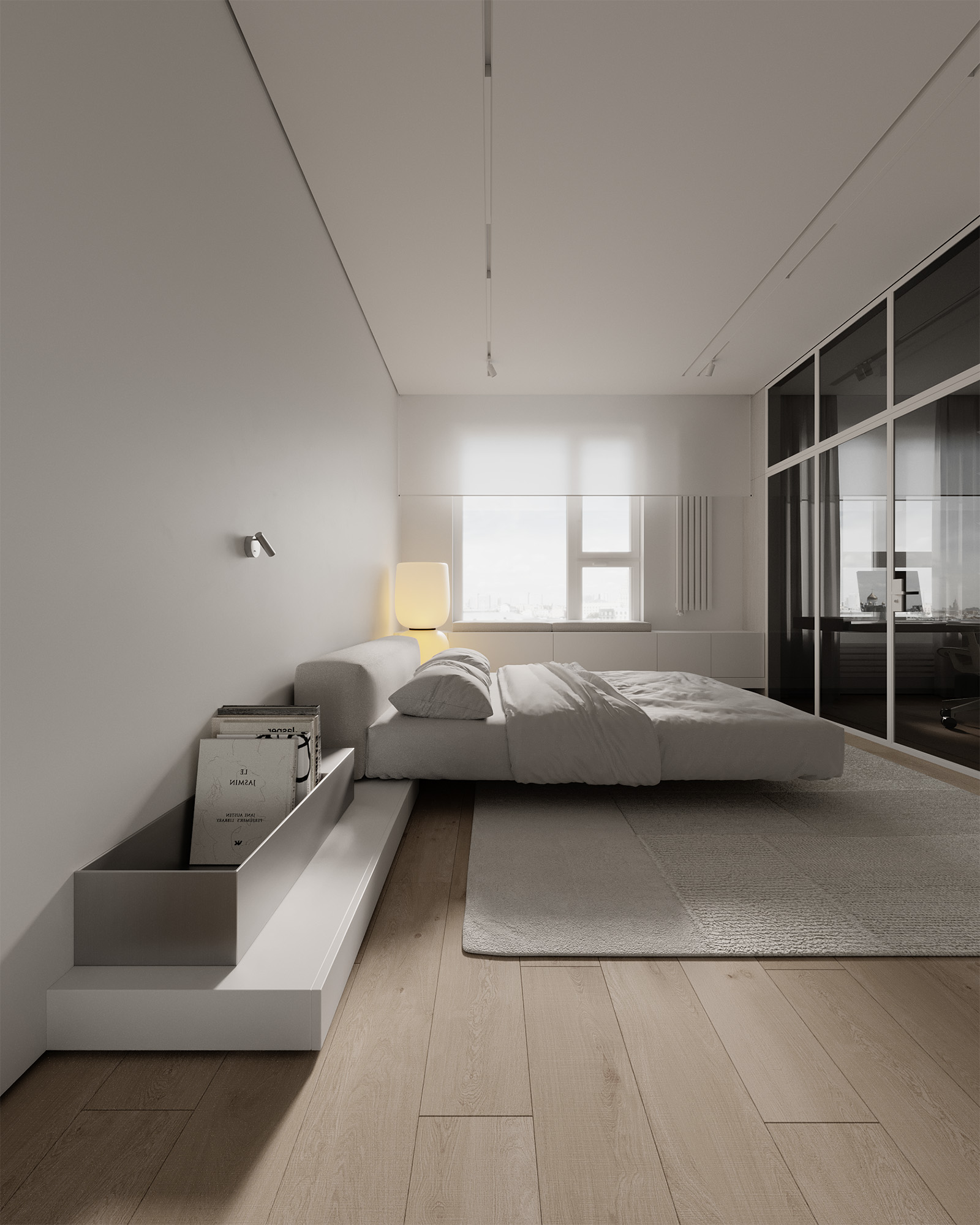 Мастер спальня в 3-х комнатной квартире. За стеклянной перегородкой - кабинет. А вход в Мастер санузел скрыт в одной из мебельных панелей. Кровать: Boca AIRBLADE