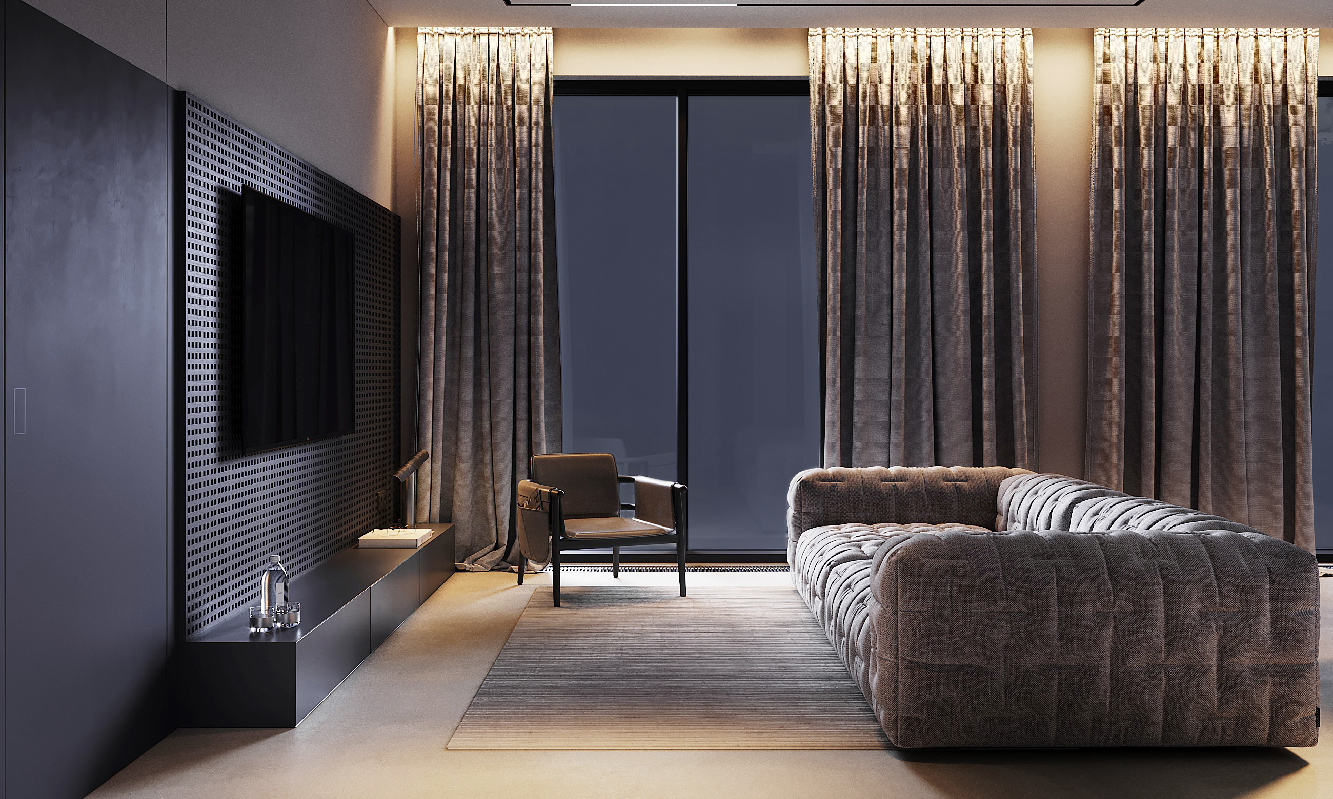 Дизайн: TS Studio design Визуализация: Анастасия Оверина Проект квартиры в ЖК Рихард, Москва Диван BOCA FOO-FIVE Кровать BOCA AIRBLADE