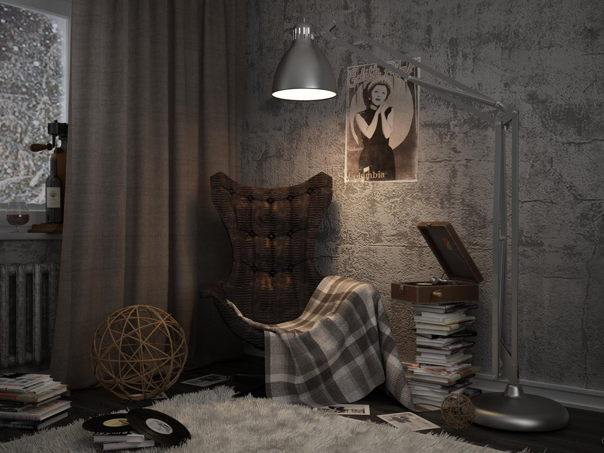 Мрачновато как-то. В кресле мат немного непонятен. Лампа кажется умышленно увеличенной копией настольной и в ней светится холодный свет, а отдает она теплый.