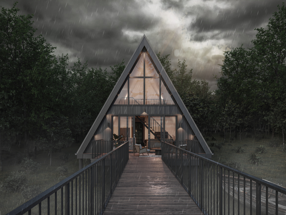 Этот потрясающий А-образный каркасный дом представляет собой идеальное сочетание уютного и современного дизайна. Благодаря просторному и открытому интерьеру, это идеальное место для тех, кто хочет сбежать от шума и суеты повседневной жизни. Раздвижные двери открывают захватывающий дух вид на дождливый день снаружи, создавая мирную и безмятежную атмосферу.