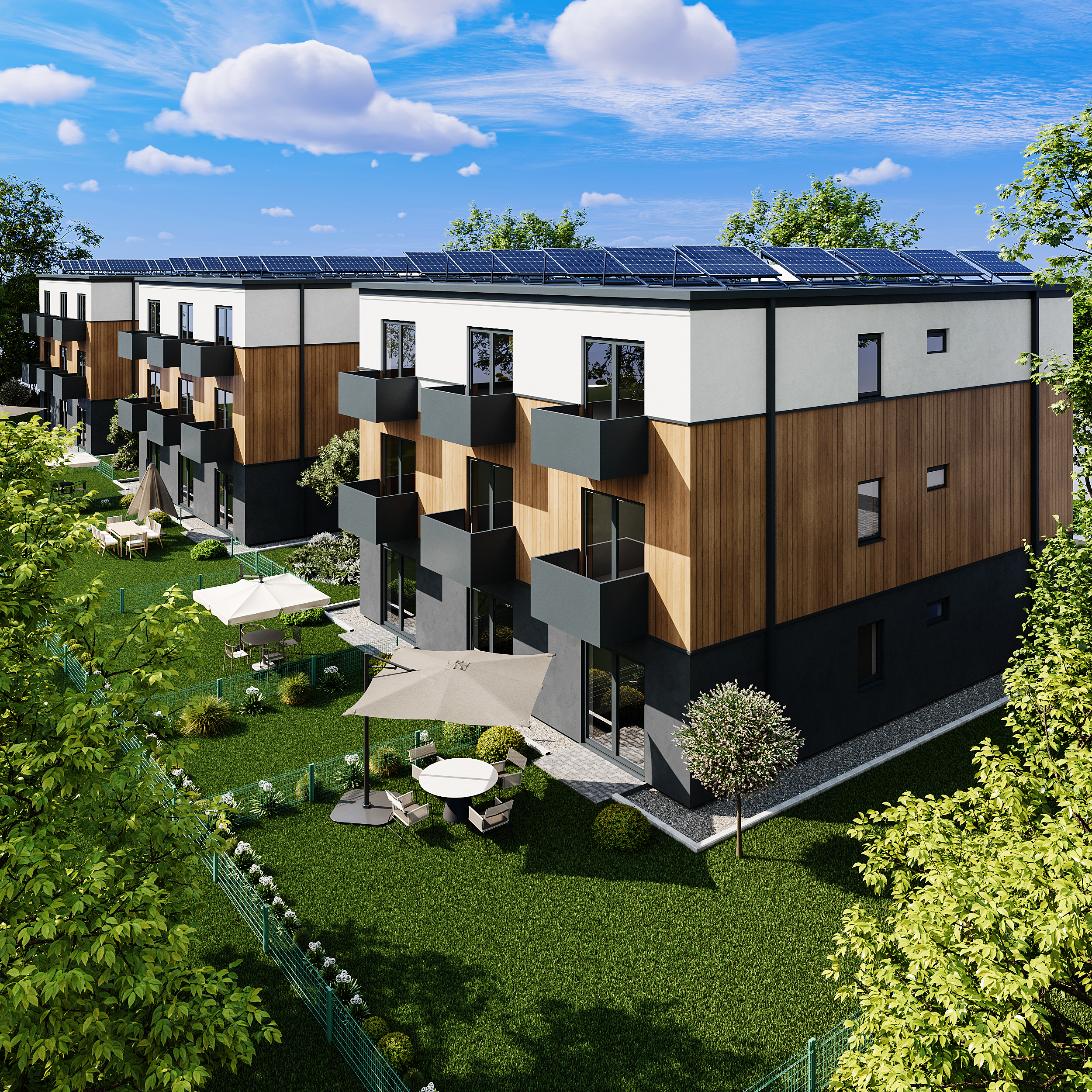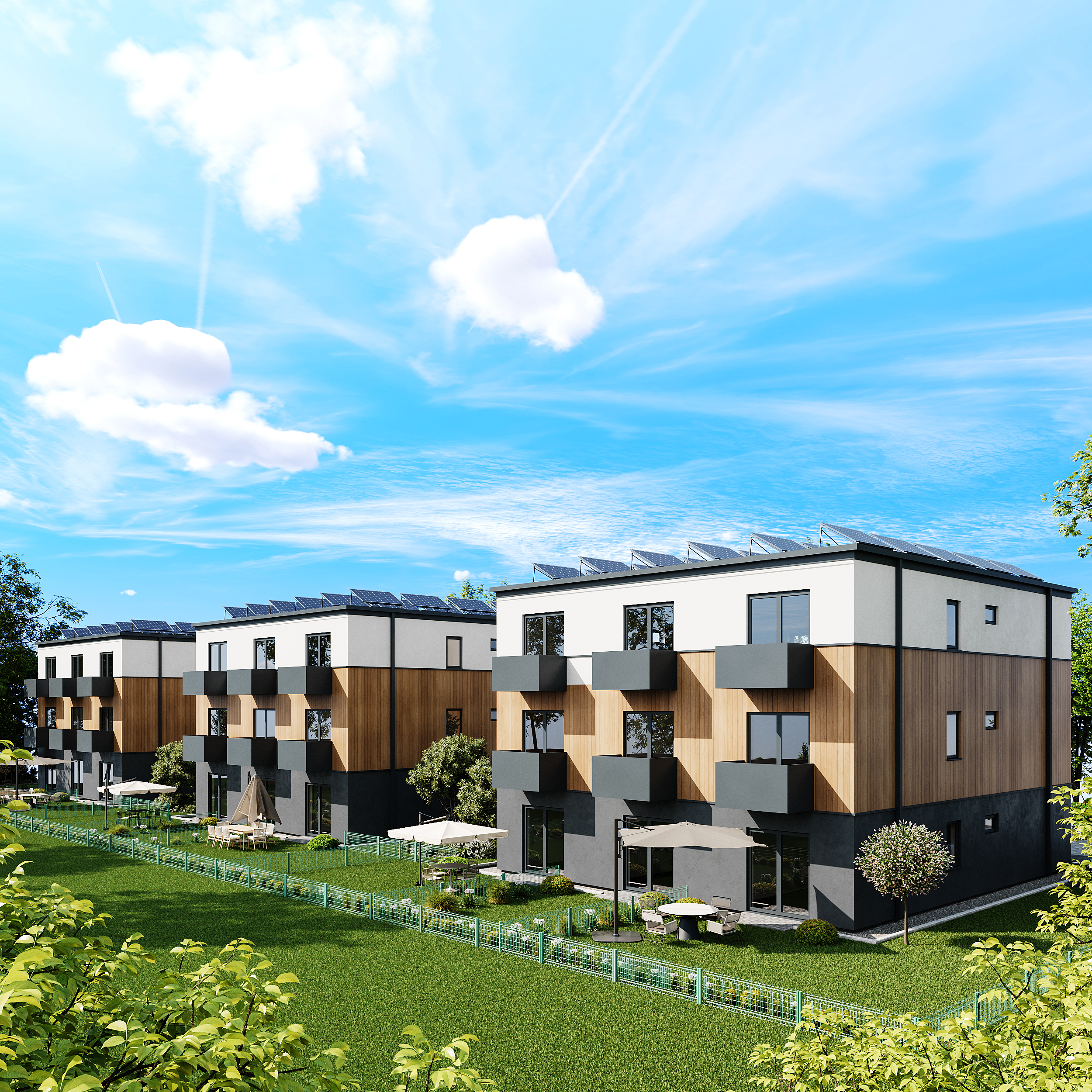 This visualization of a three-story communal residential building designed for 9 households was created for villages in Germany. The main goal of the project is to create a modern and comfortable living environment. Natural materials were used in the facade, harmonizing the building with the surrounding landscape.