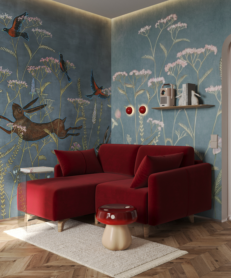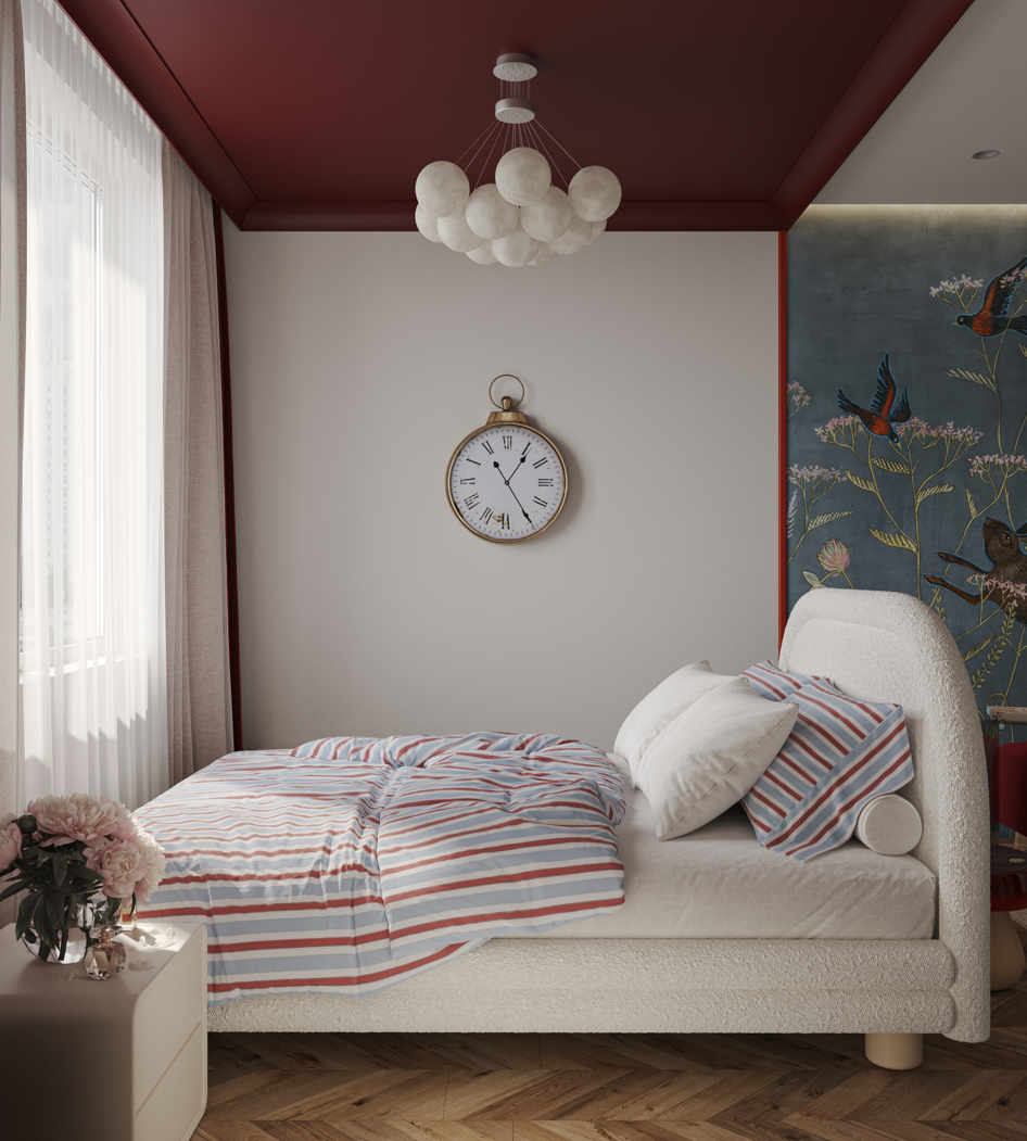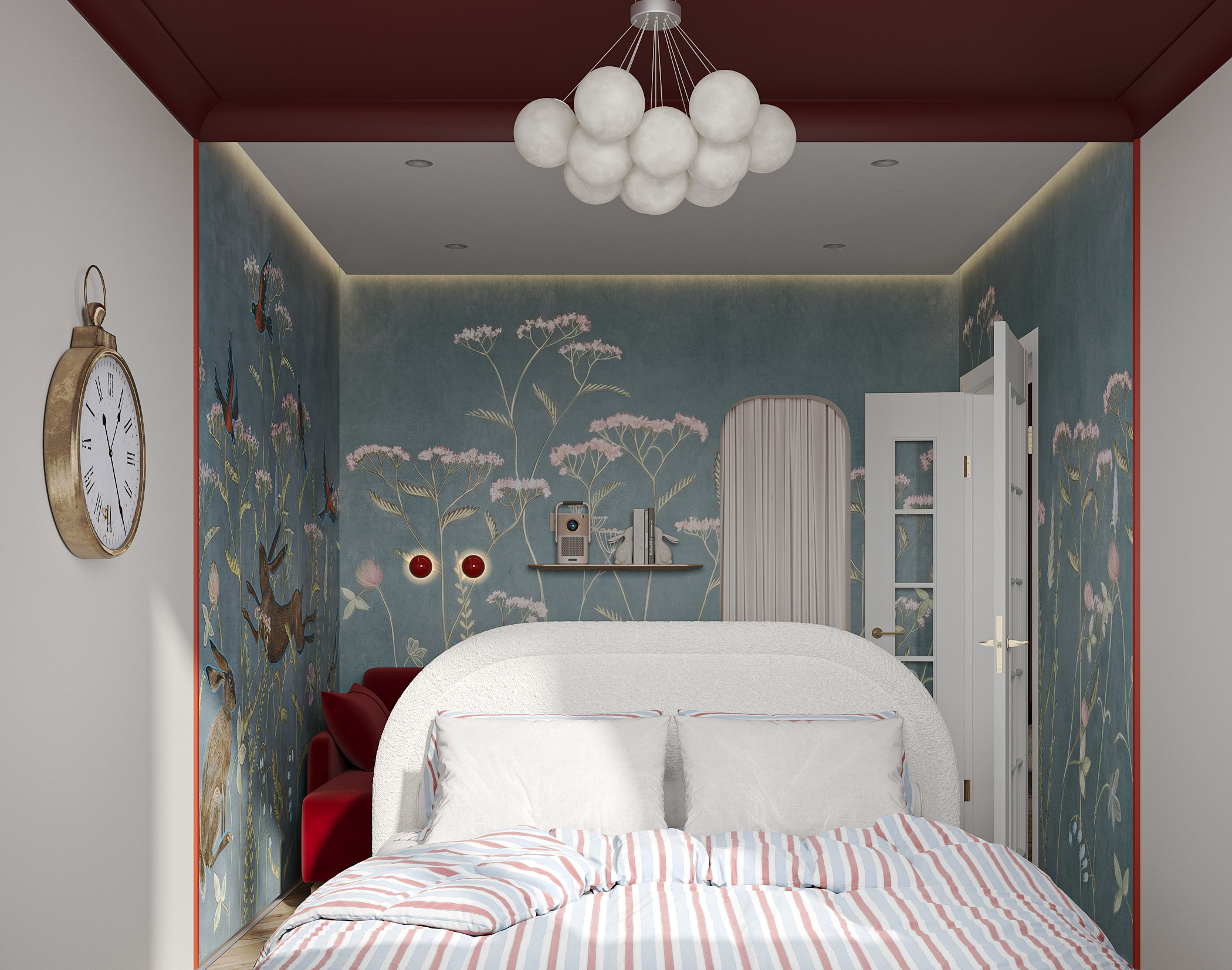 Выслушав ее пожелания, у дизайнера интерьера родилась концепция по мотивам сказки "Алиса в стране чудес", поэтому в комнате можно найти элементы, перекликающиеся с этой историей.