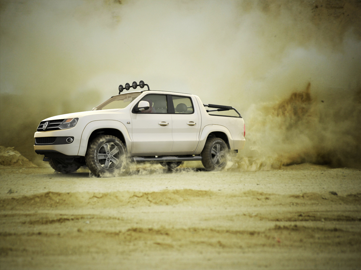 Ну на фотогрфии, на которую я ровнялся, мало пыли, так она ездит может несколько часов по пескам, а тут просто вывезли на прицепе чистый Амарок и пустили по песку, чтобы снять кадр)