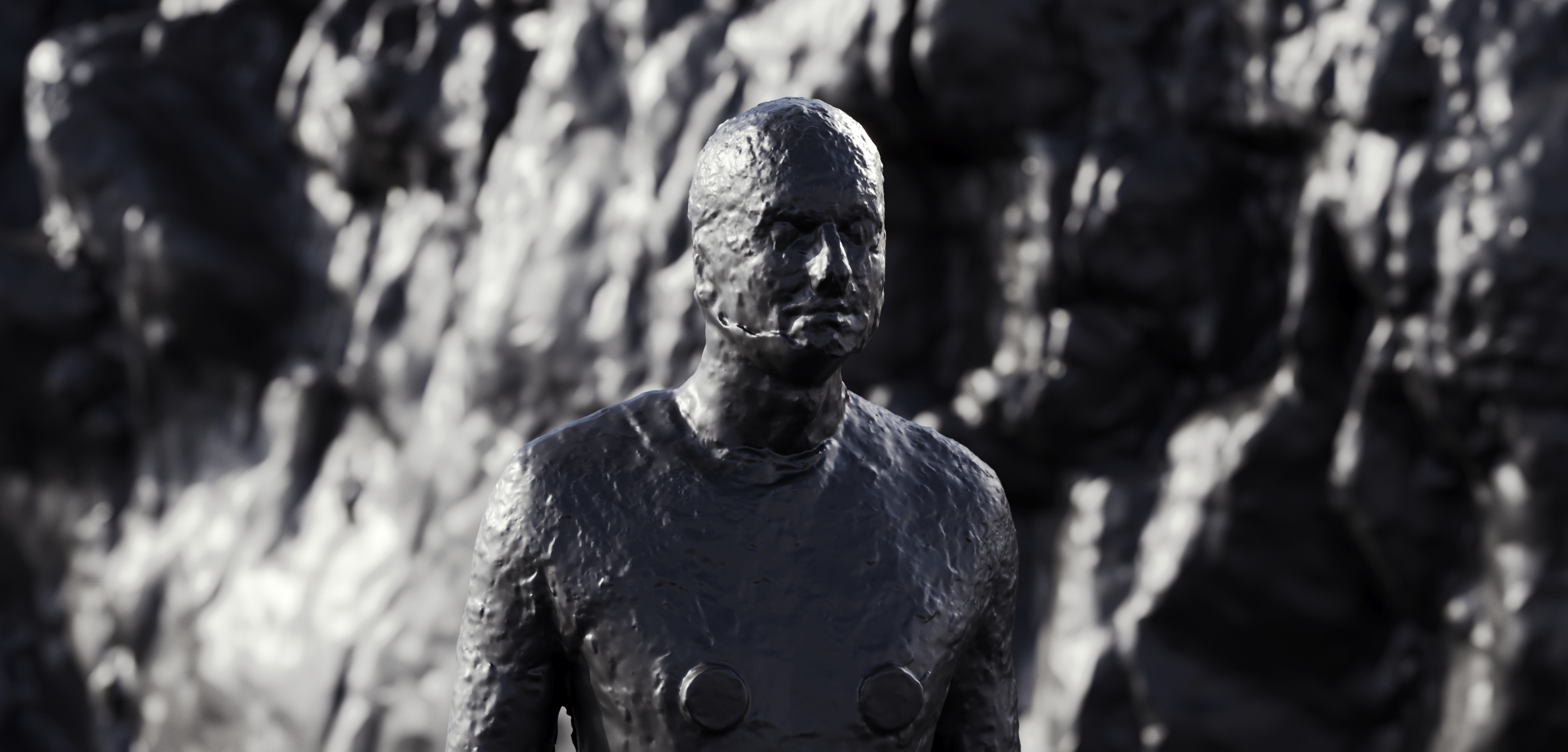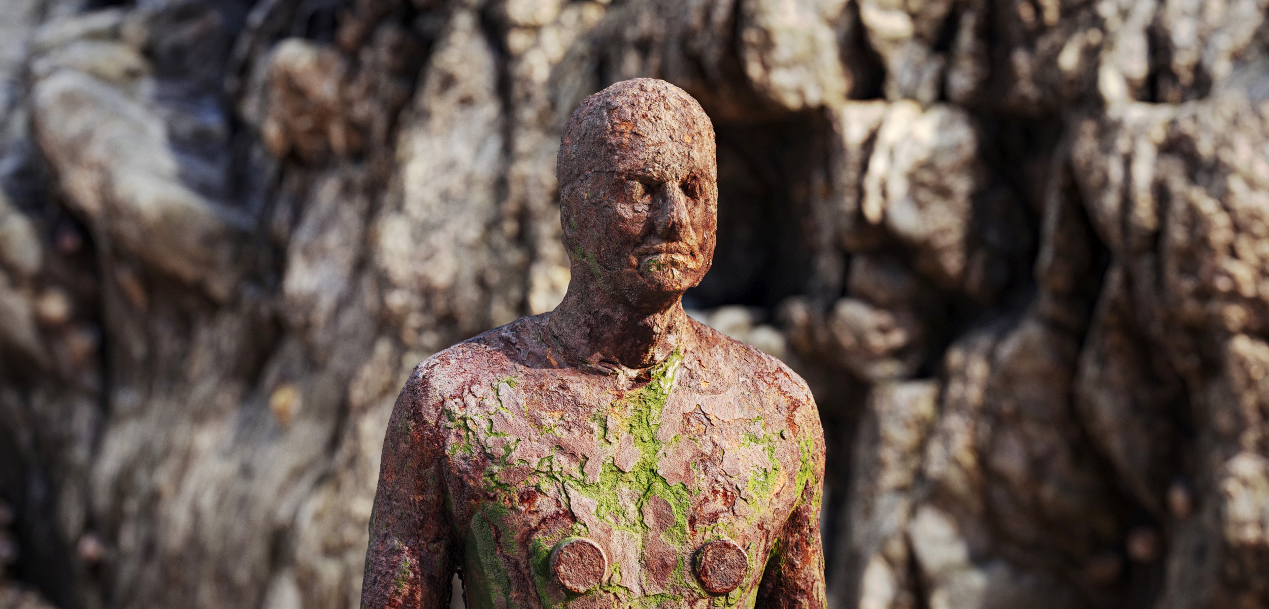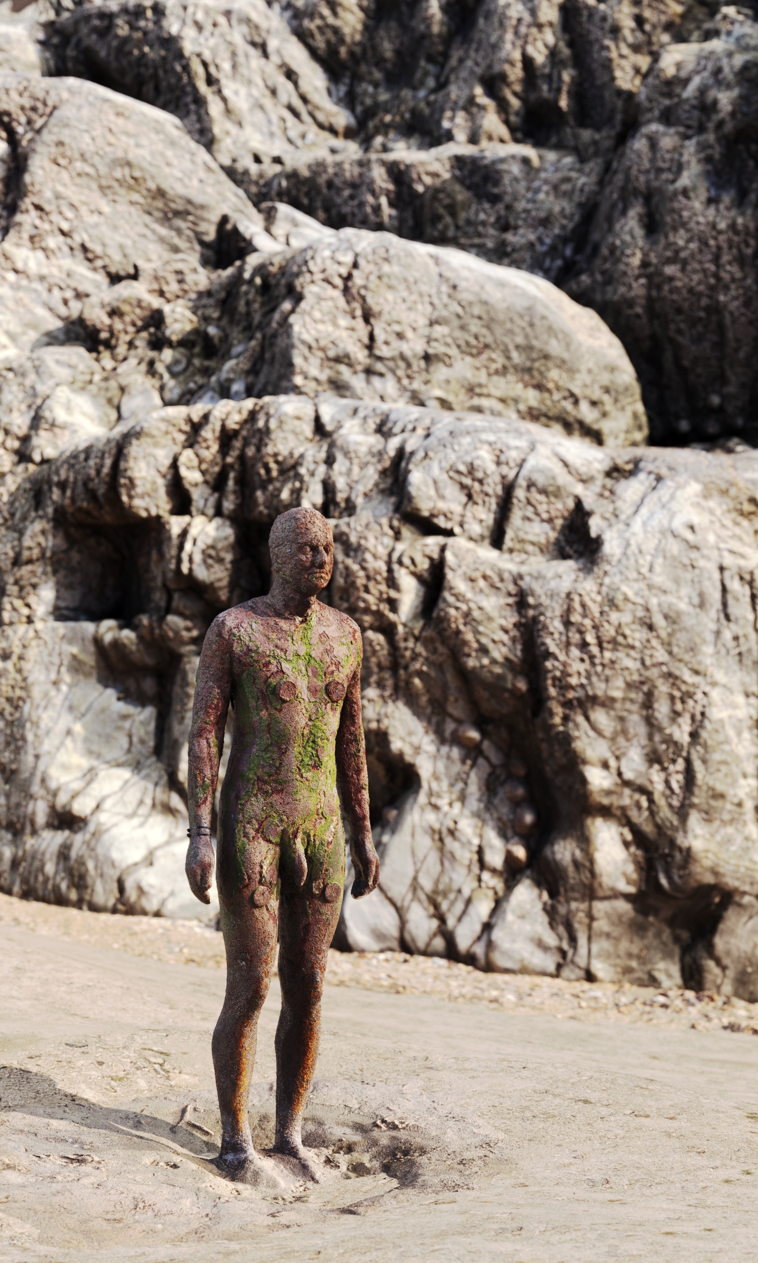 Вырезка из википедии "Художник фокусирует свой взгляд на человеческом теле, исследуя его взаимоотношения с окружающей средой и архитектурой." Поэтому многие его скульптуры отлиты из металла и могут находиться в лесу, поле, среди бетона и домов, или как в данном случае, на пляже - ржавая и покрытая мхом. Но как Вы уже сказали, что хотели обсудить, то обсудили)