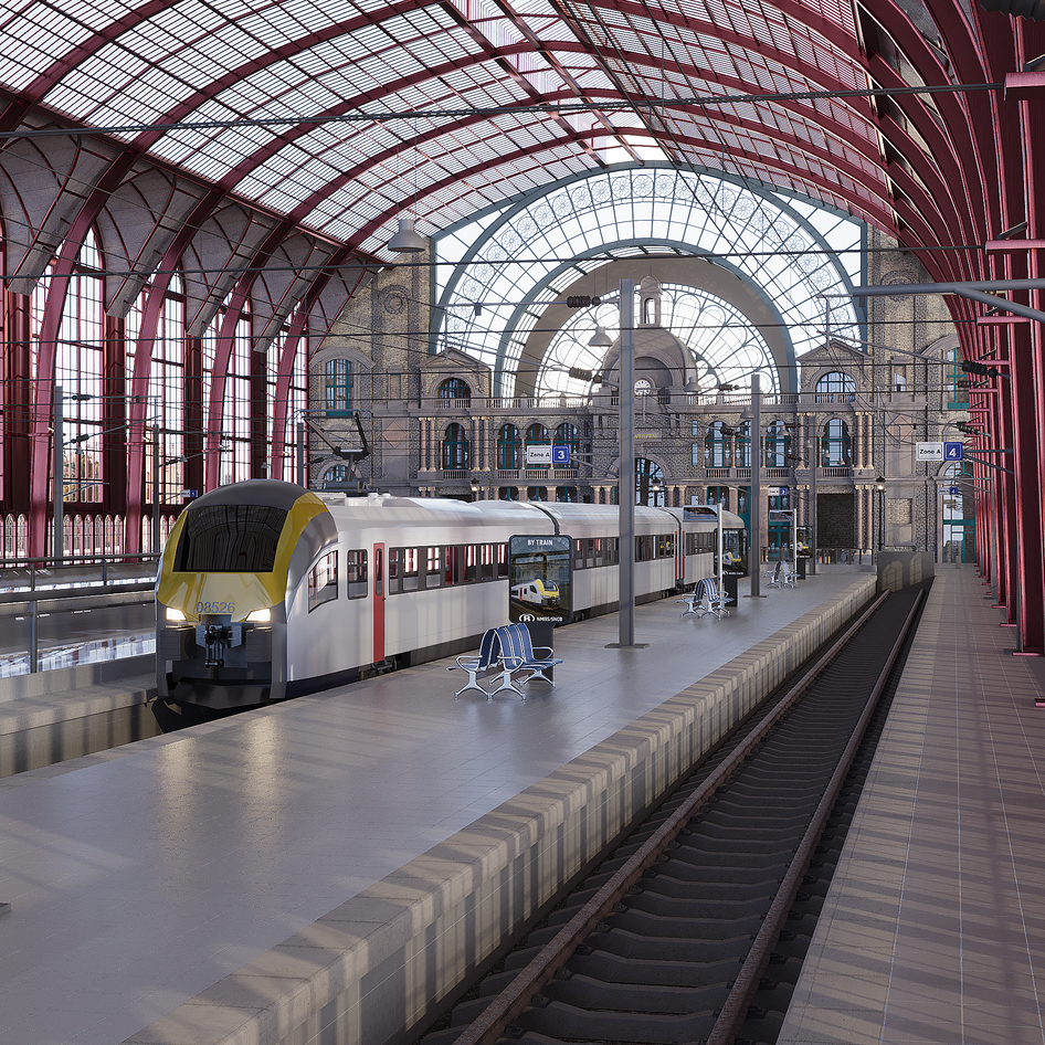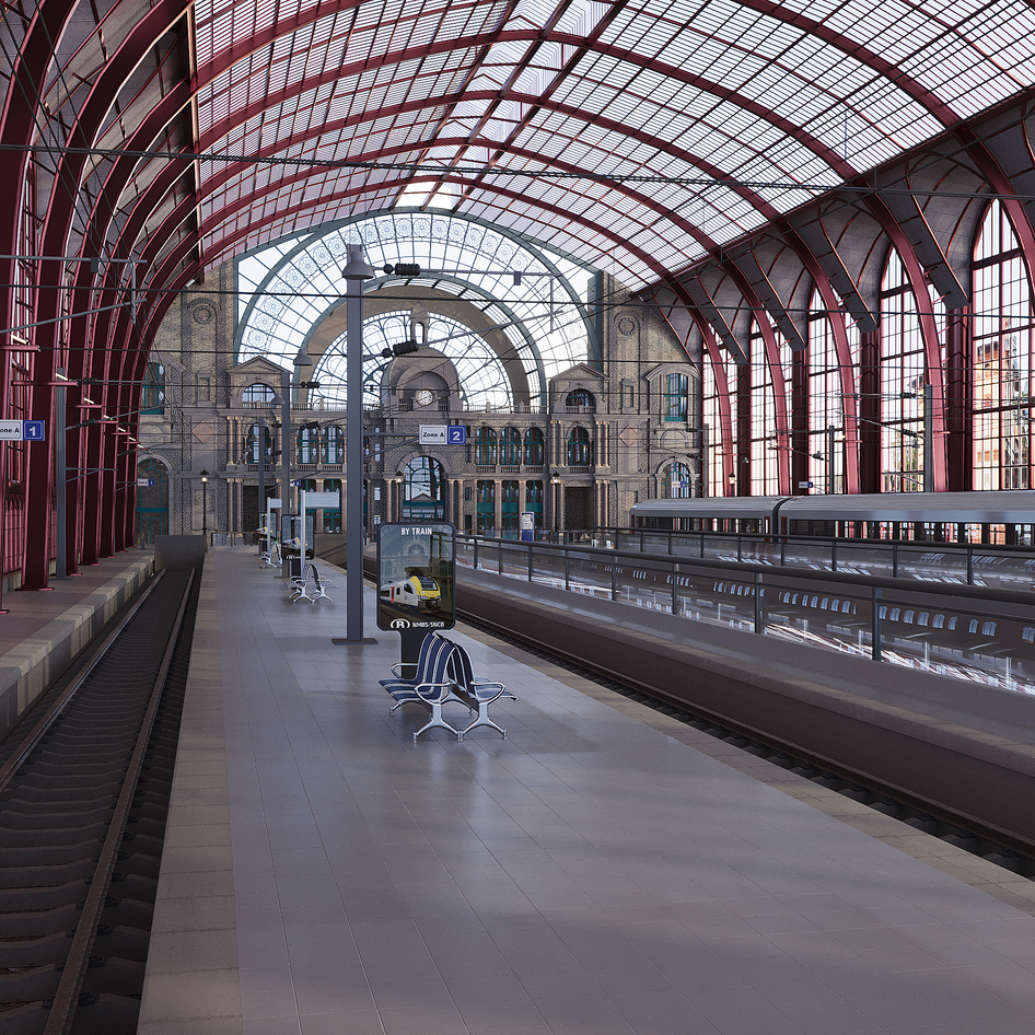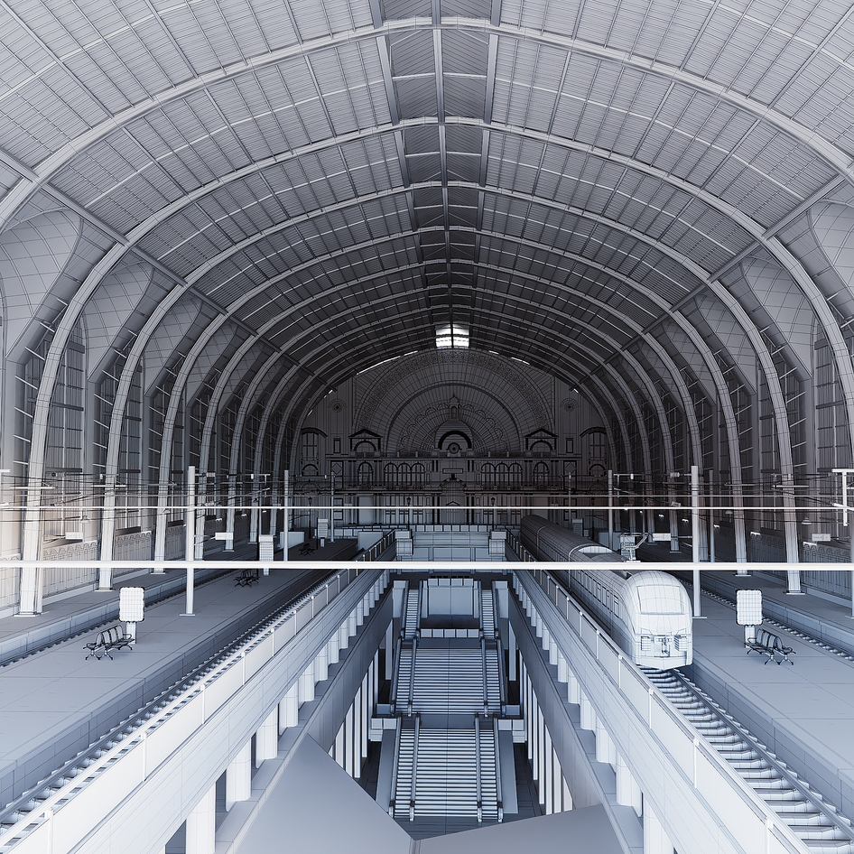 Фотореалистичная 3D-модель вокзала в стиле Антверпен-Сентрал, выполненная с высокой точностью и вниманием к архитектурным деталям. Идеально подходит для визуализаций, анимаций и городских сцен в премиум-уровне проектов.