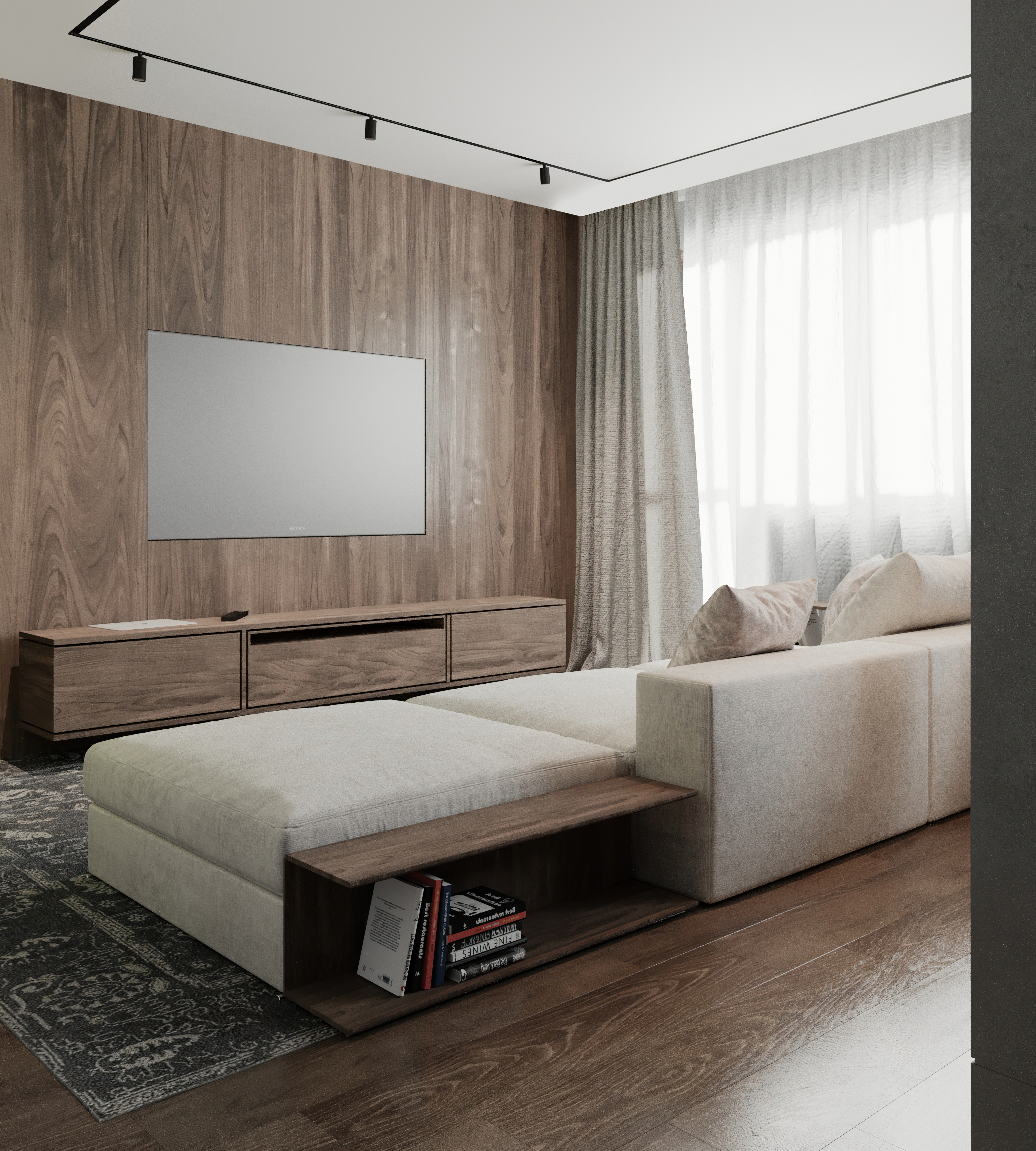 Интерьер кухни-гостиной оформлен в светлых тонах и спокойных фактурах отделки. Теплый оттенок дерева на общем светлом фоне добавляет уют и не перегружает пространство.