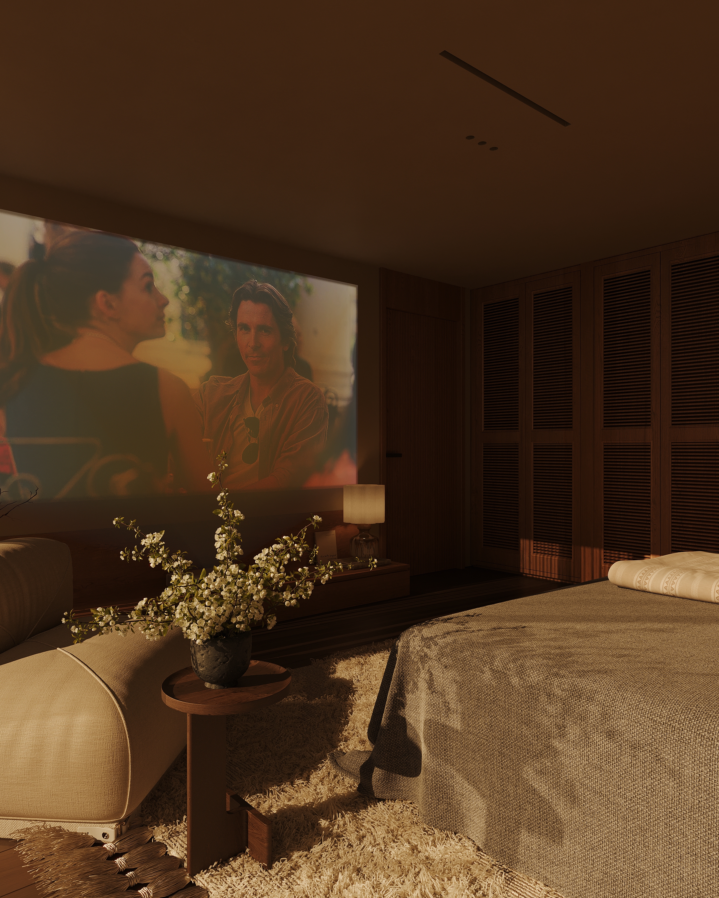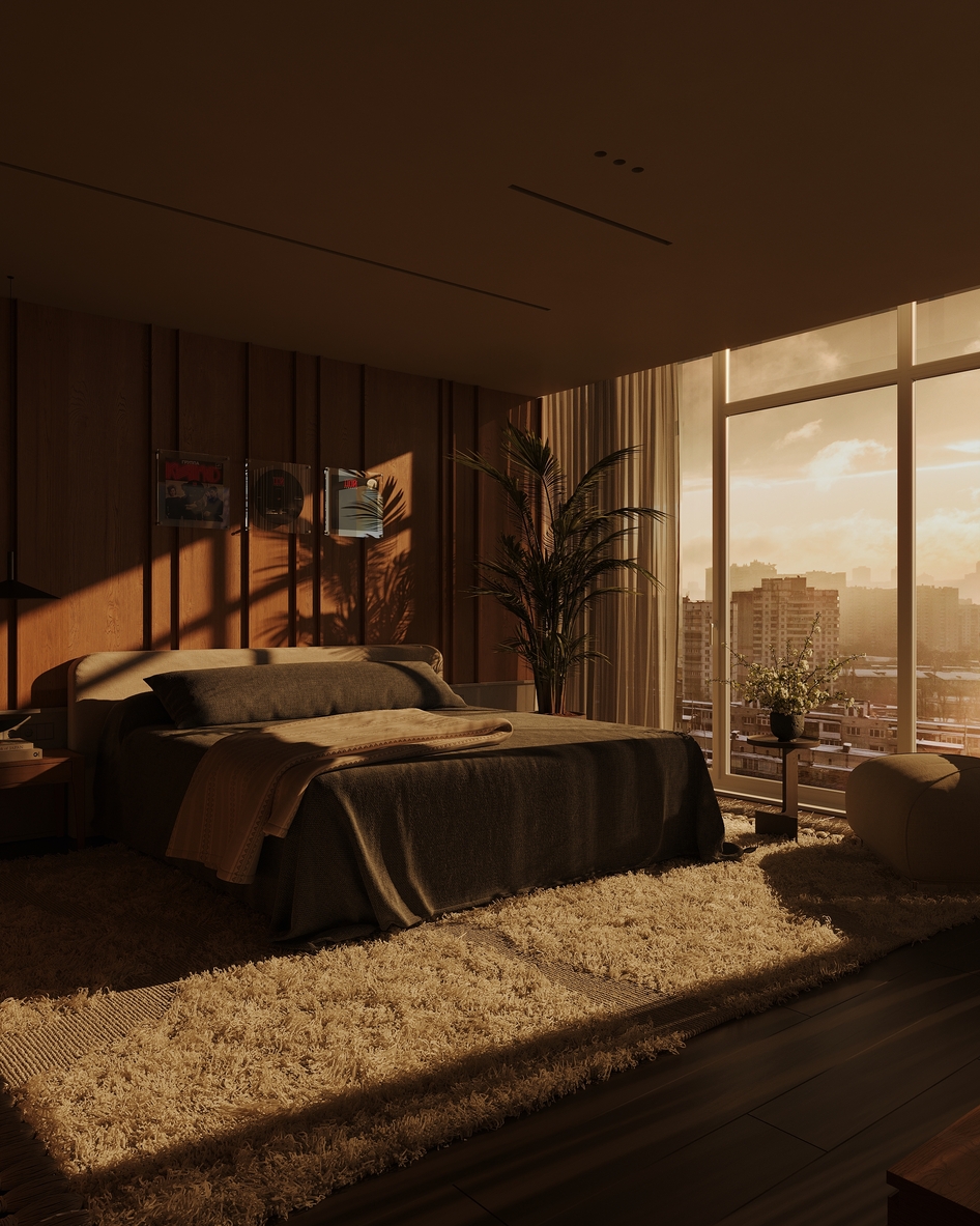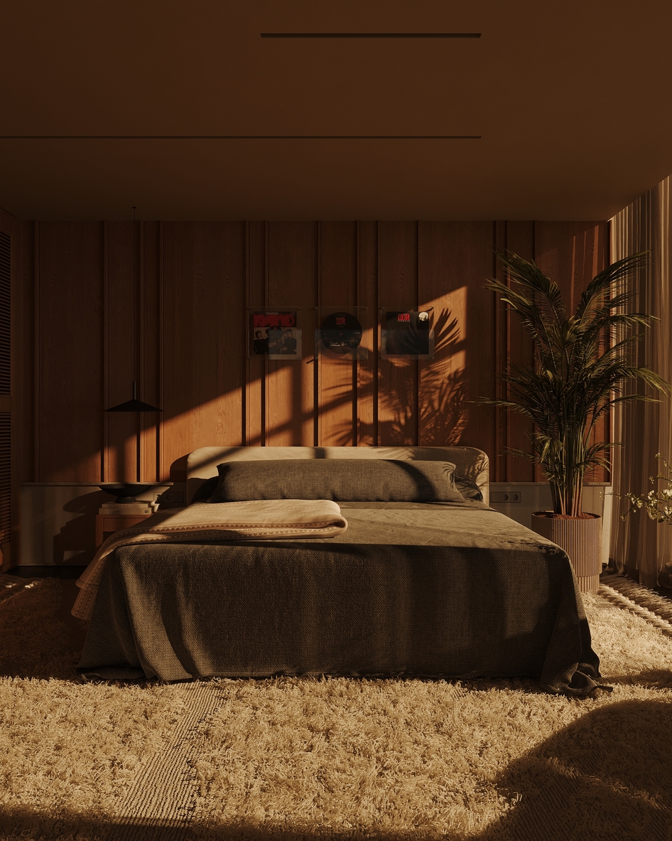 В целом понравилось, уютная спальня. Бахрома на ковре гигантская и пальма так близко к кровати мне бы мешала, толкнуть бы ее к окну, а в остальном - прикольная спальня, душевная работа!