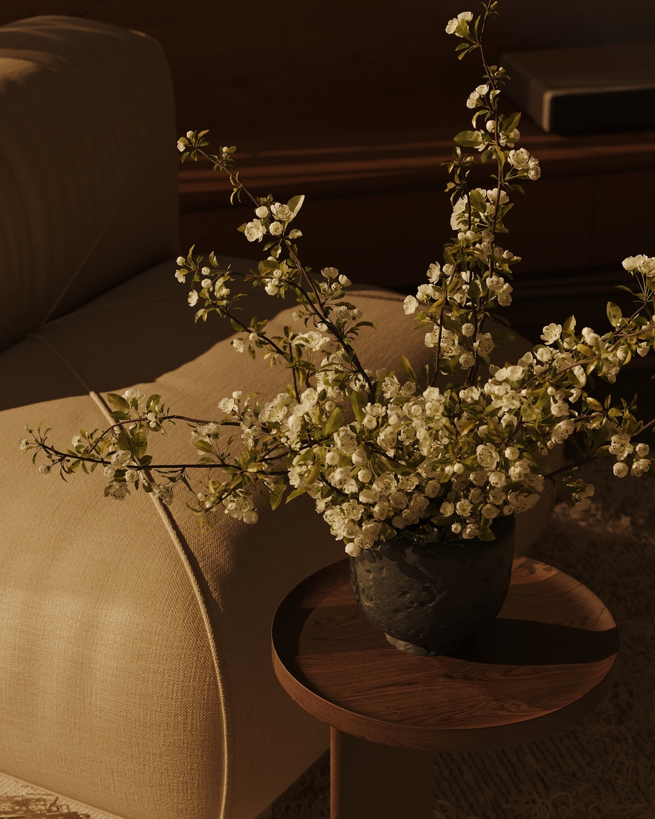 Букет цветущие ветки в глиняной вазе