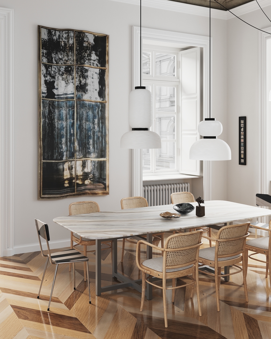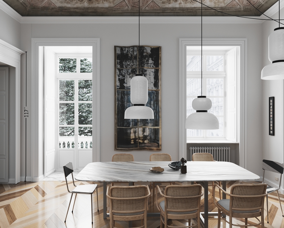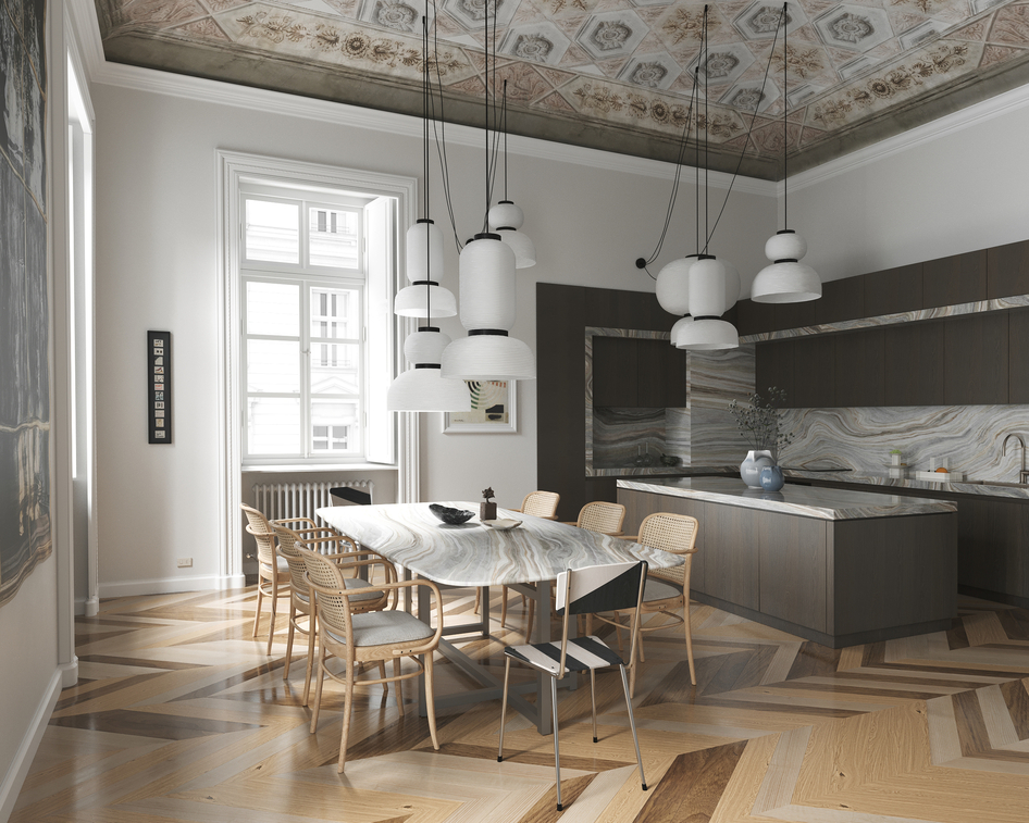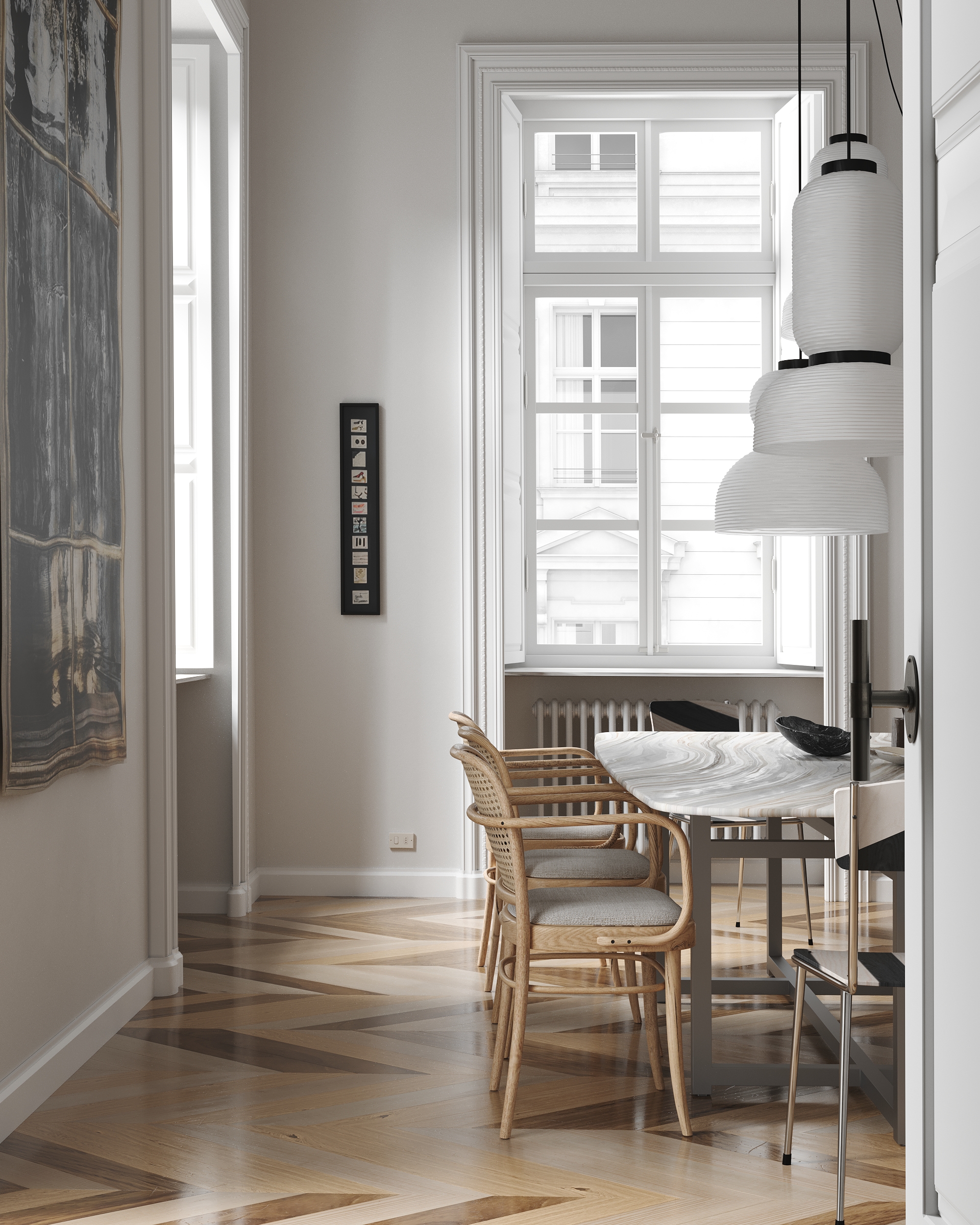Визуализация интерьера кухни, выполненная по фото-референсу из проекта Apartment SL архитектурного бюро BRH+ (Италия). Основной целью было воссоздание атмосферы, материалов и света оригинального пространства, а также моделинг всех ключевых предметов, включая винтажные объекты и стул Tronet.