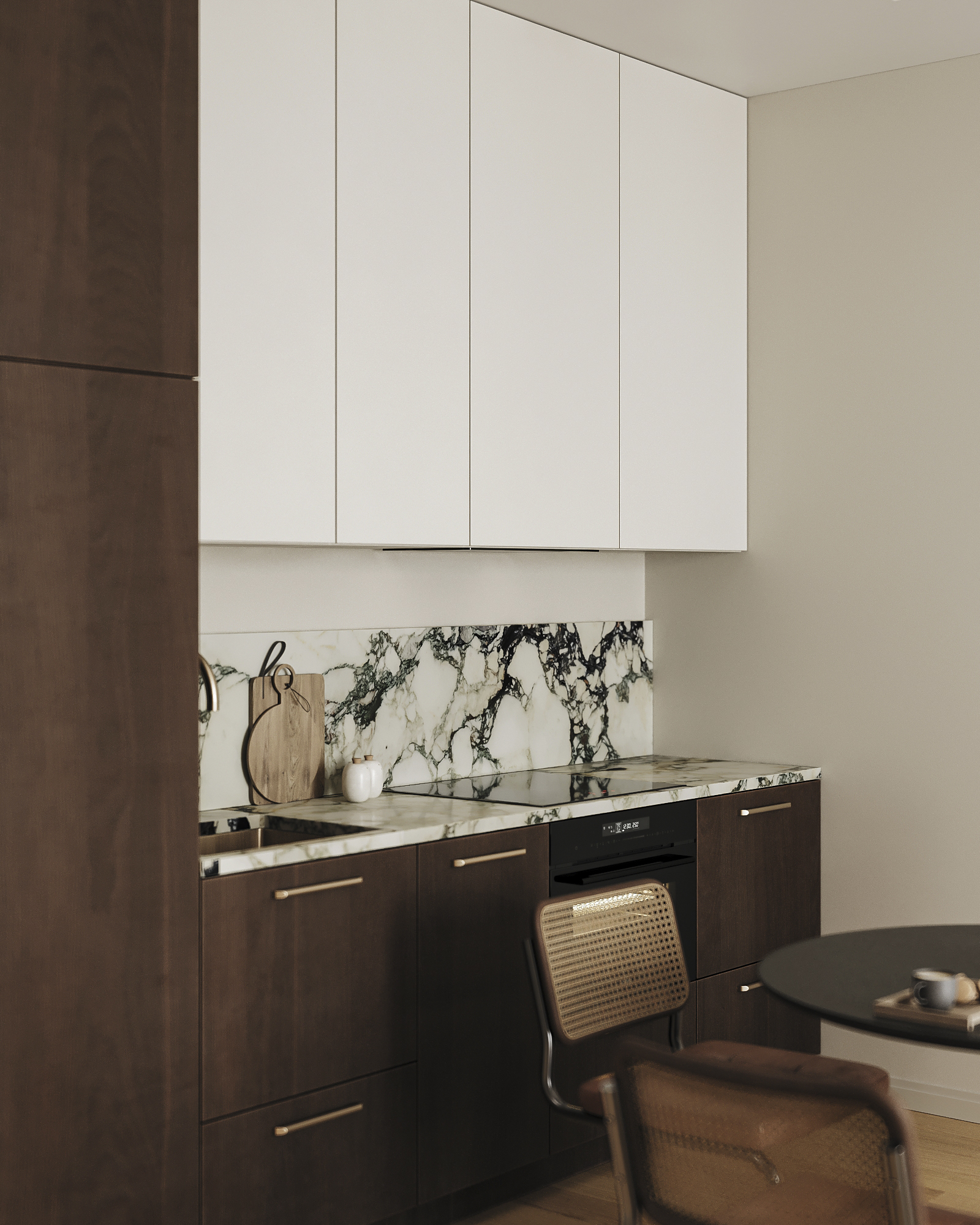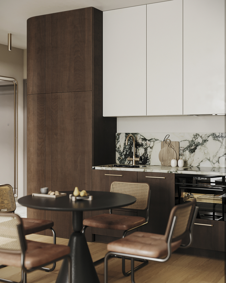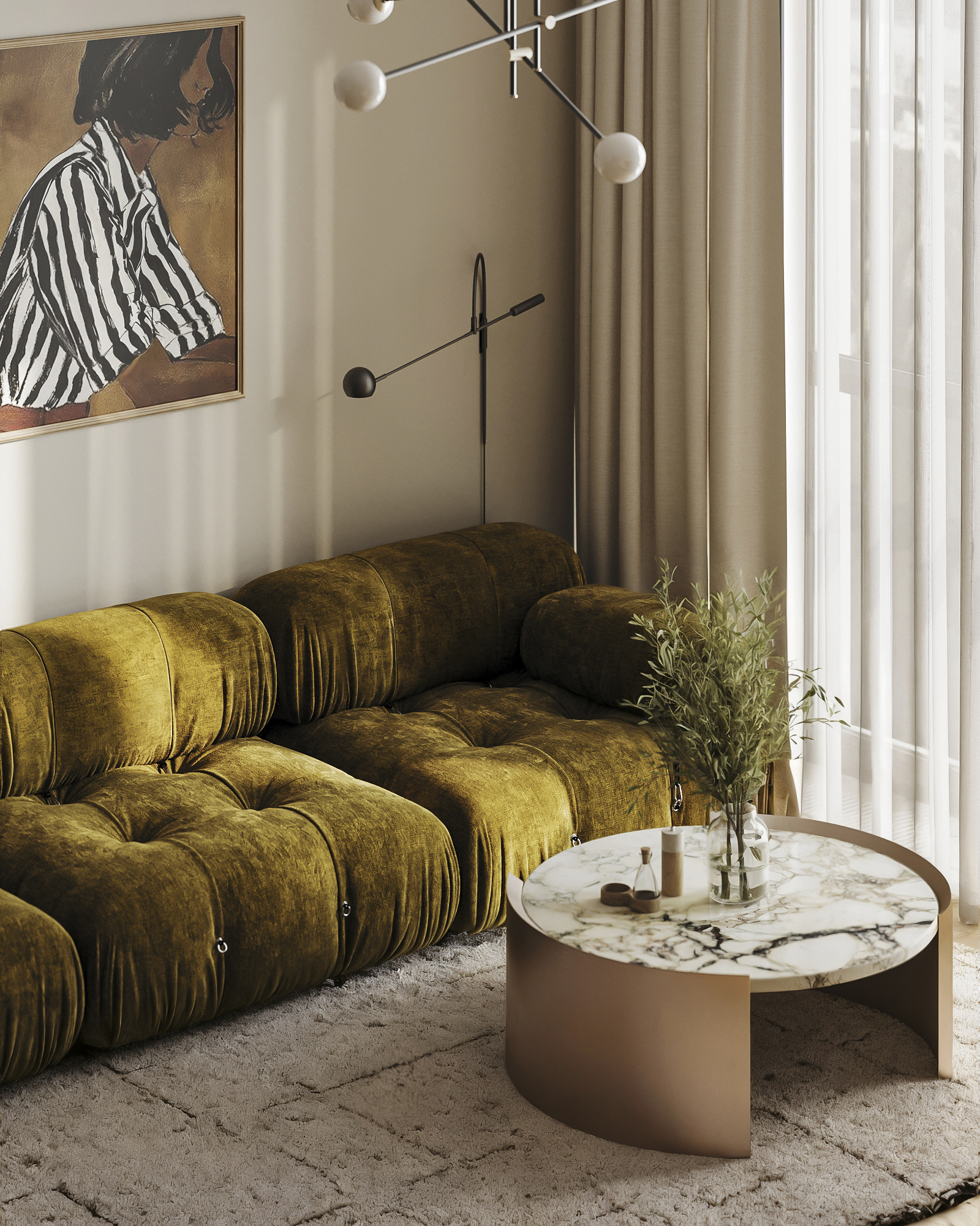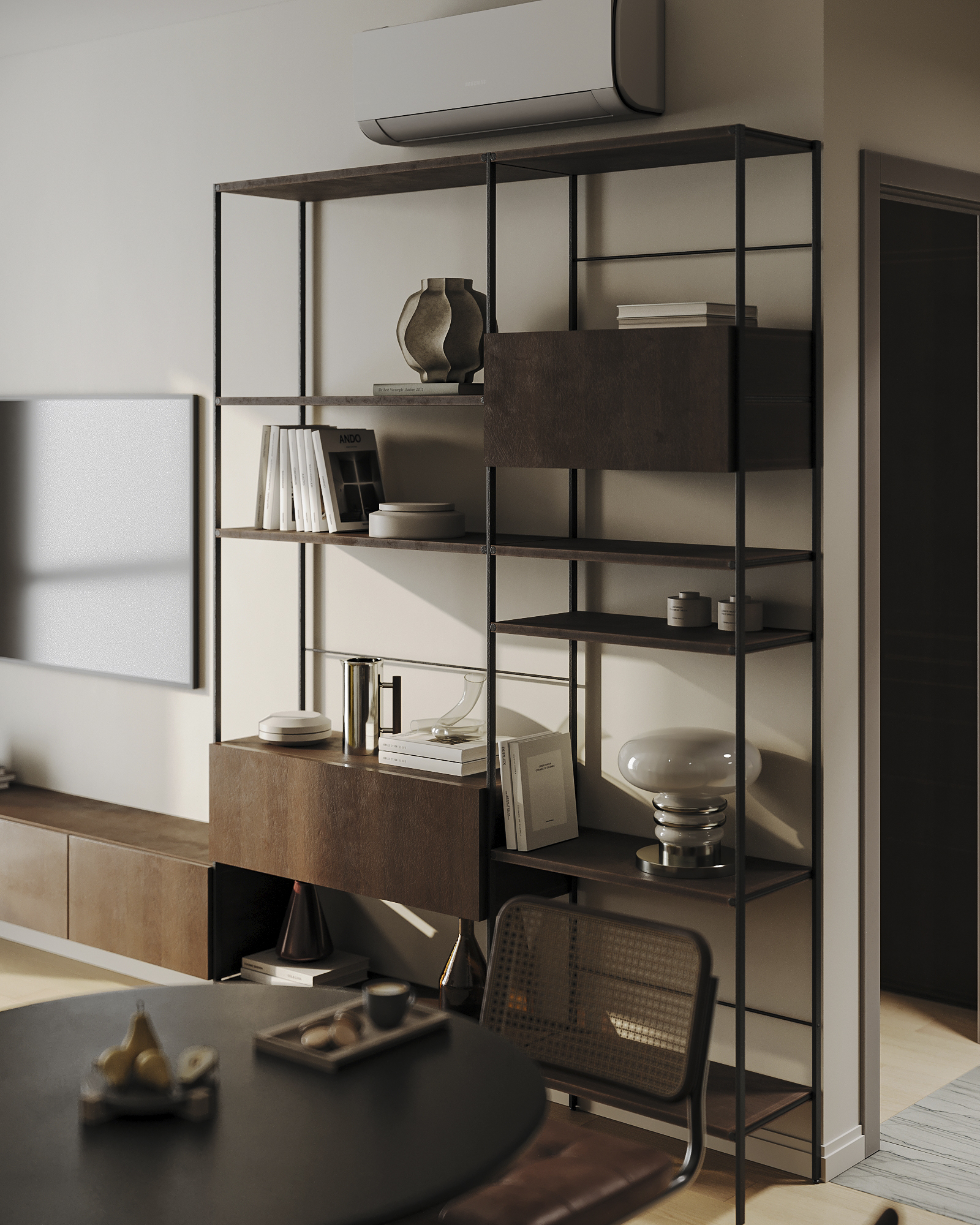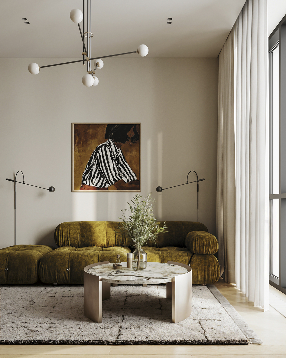 "The interior reflects a warm contemporary aesthetic with a focus on natural materials and soft textures. The combination of wood, textiles, and metal creates a rich yet cozy atmosphere. Sculptural furniture forms and curated art pieces give the space character, while the thoughtfully layered lighting enhances its calm and refined mood"