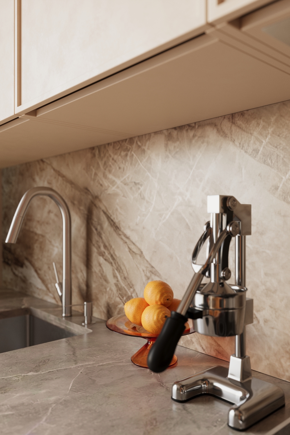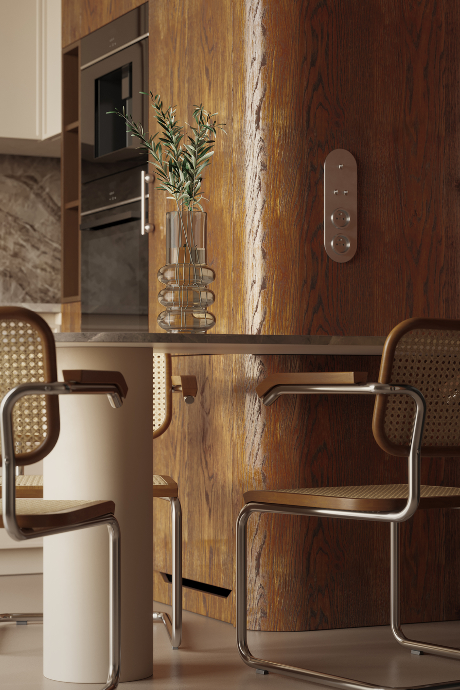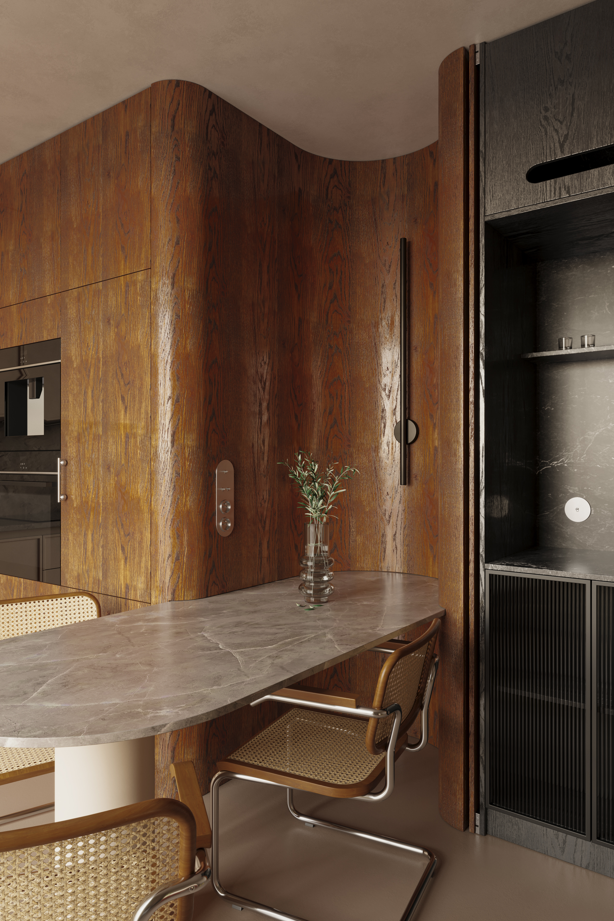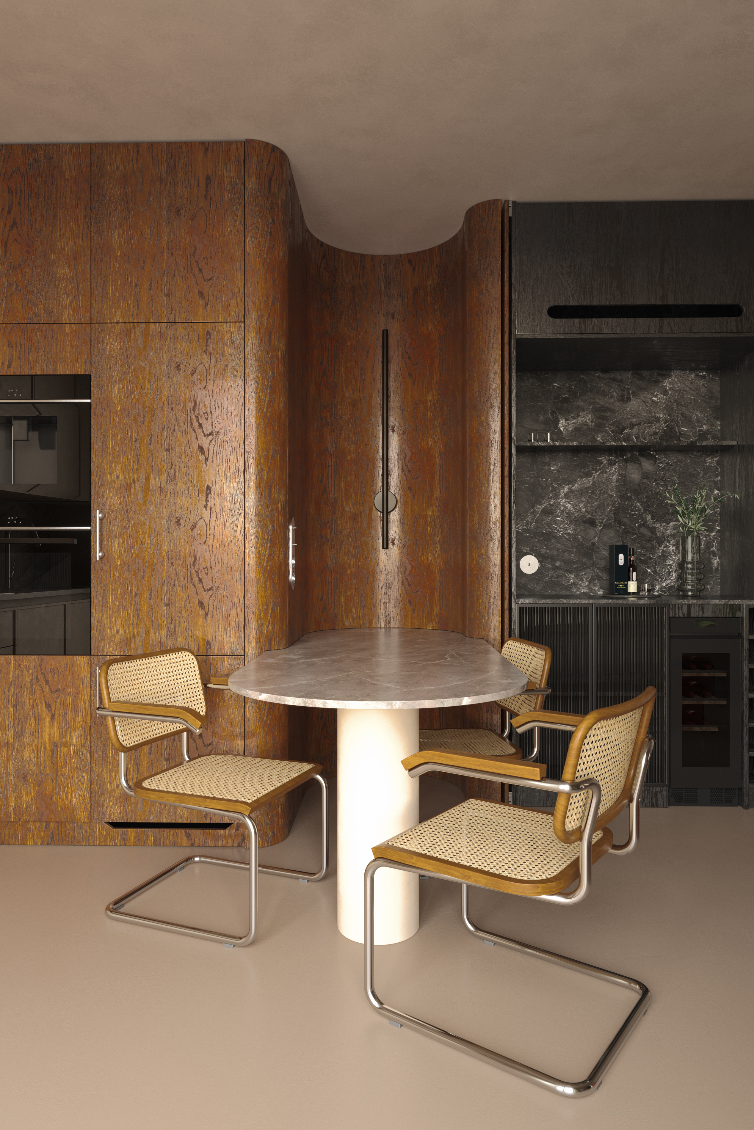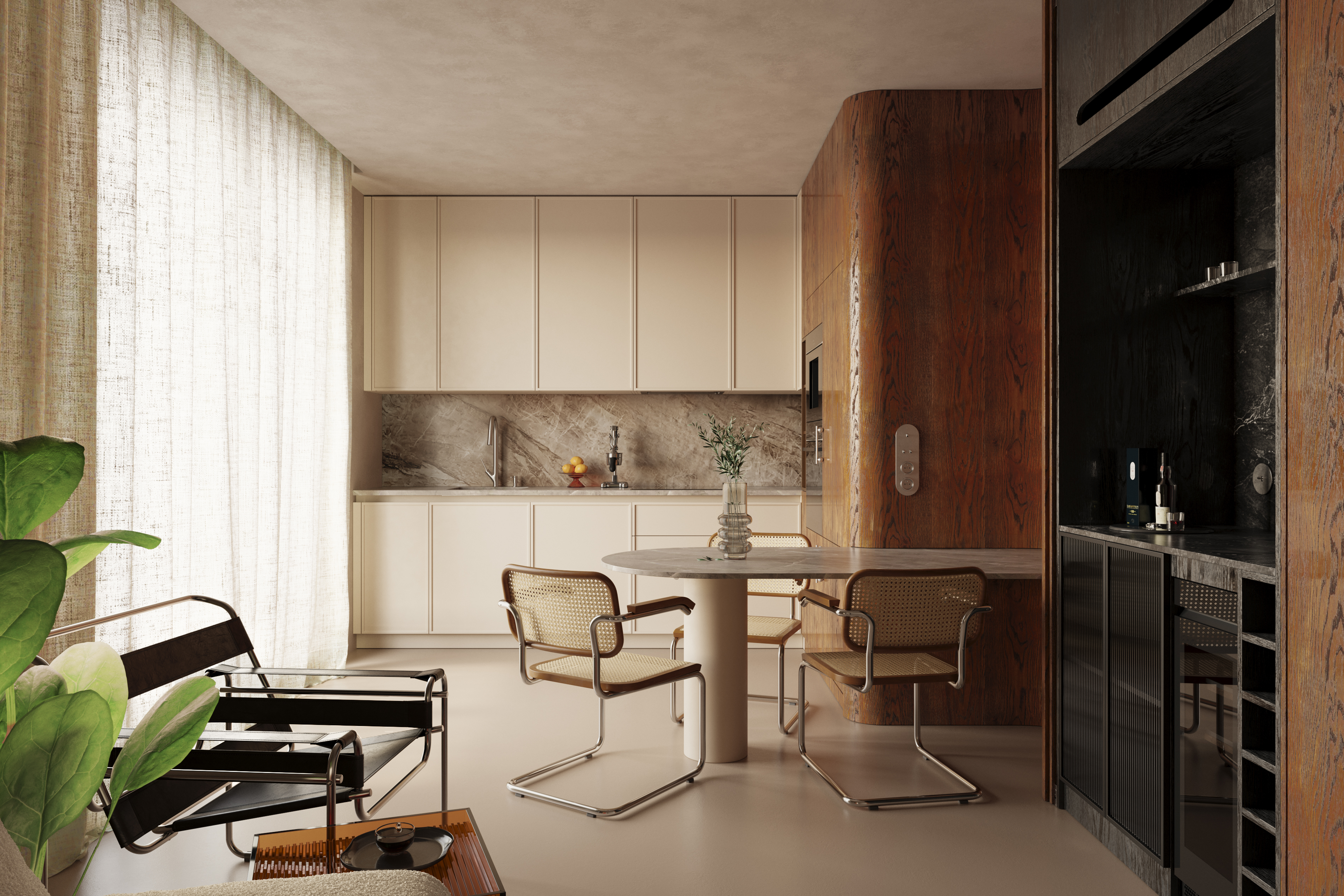Визуализация создана по фотографиям реализованного интерьера квартиры в Кракове. Дизайн-проект разработан польской студией noplusp. Референс:
