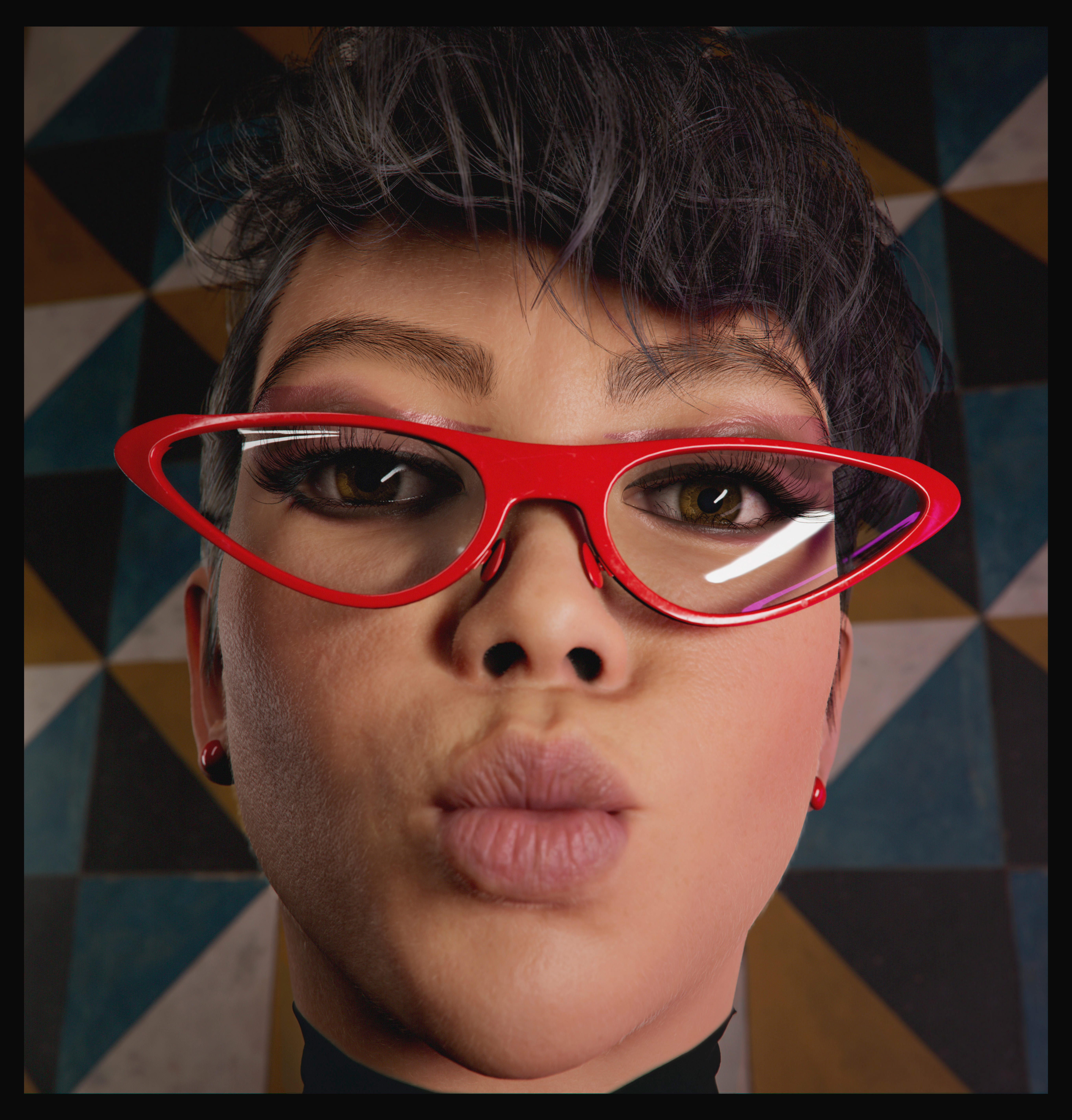 Текстура кожи крупновата, но это мелочи. Эффект резиновый, мертвой долины. Рефракция на очке странная, слишком вывернуто как-то искажение. Но наверное главное-это одежда. Она какая-то слишком однородная, без вмятин выразительных тоже. Как будто модельку залили одним цветом и все. Она еще и поломана в сетке видно. Смуша мало.