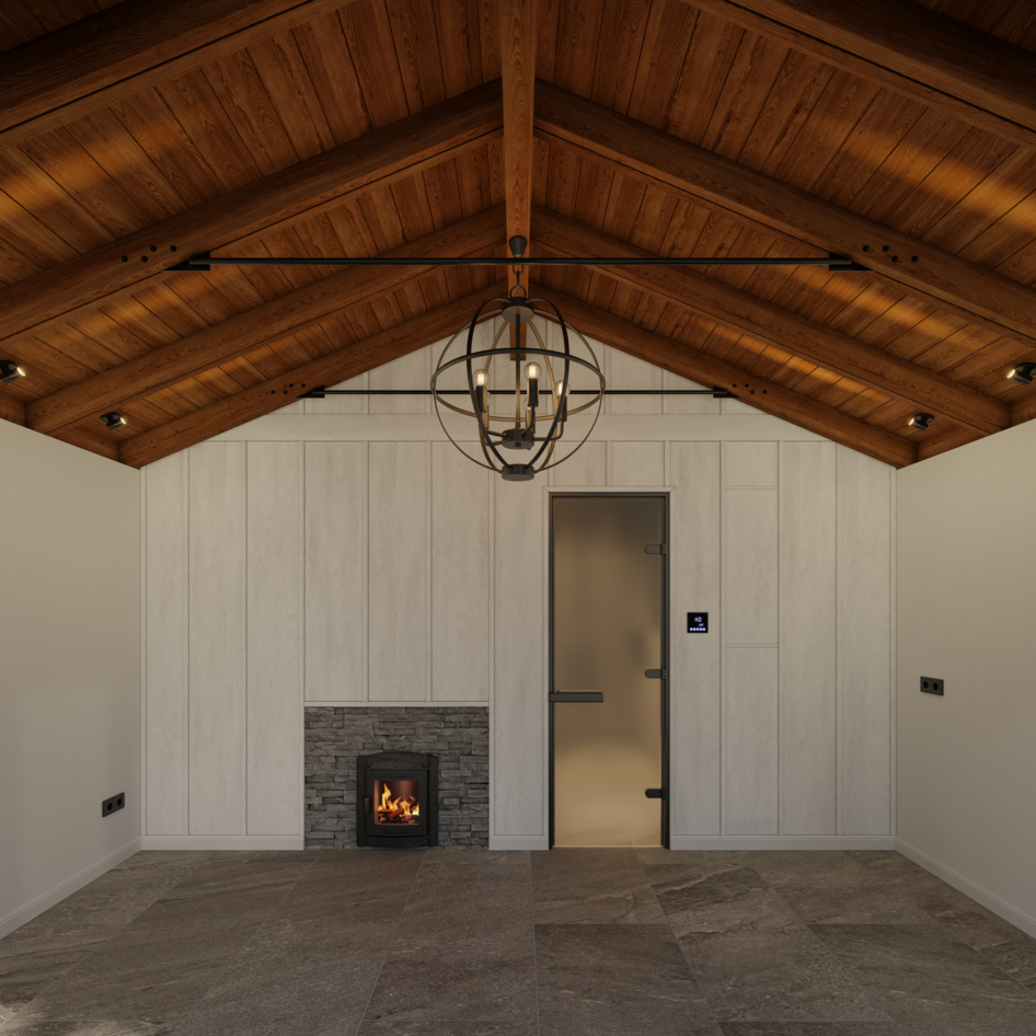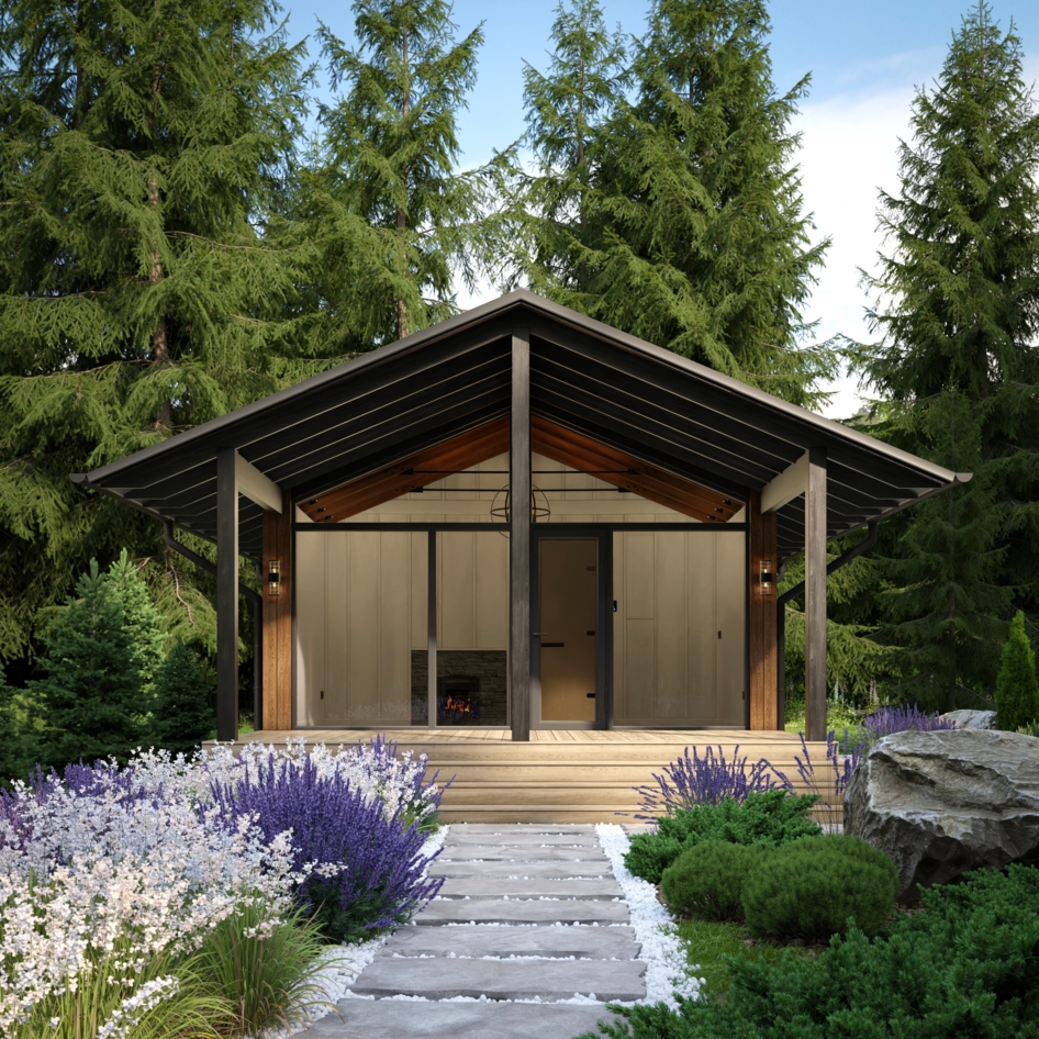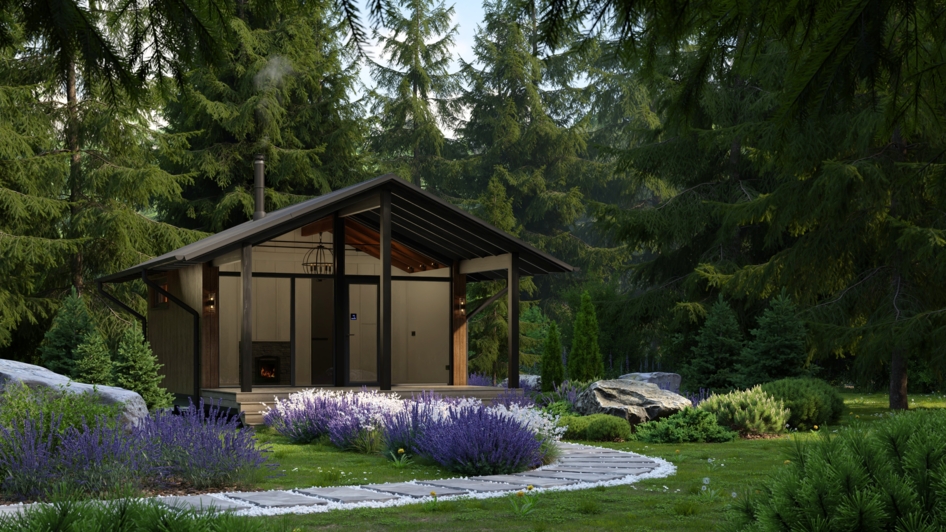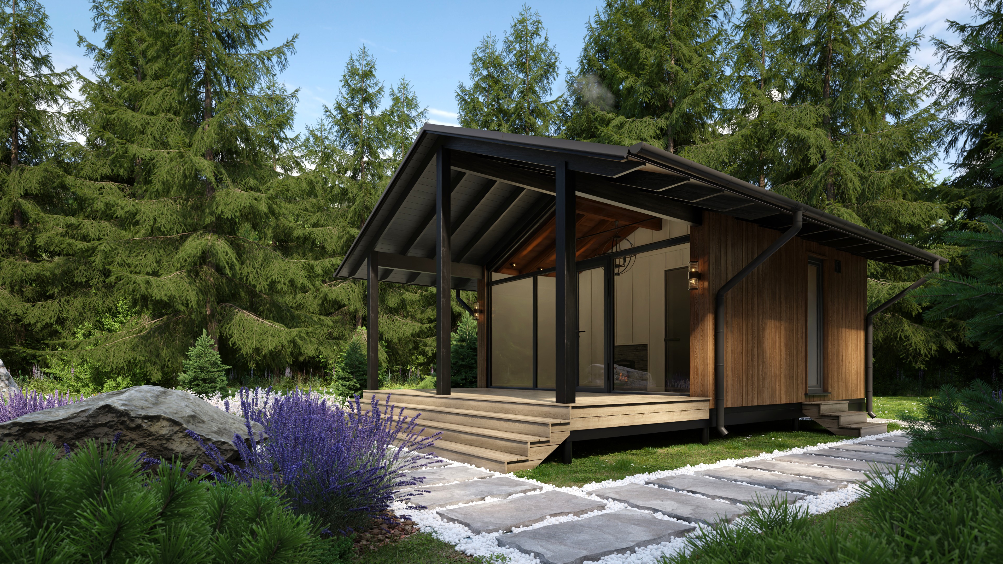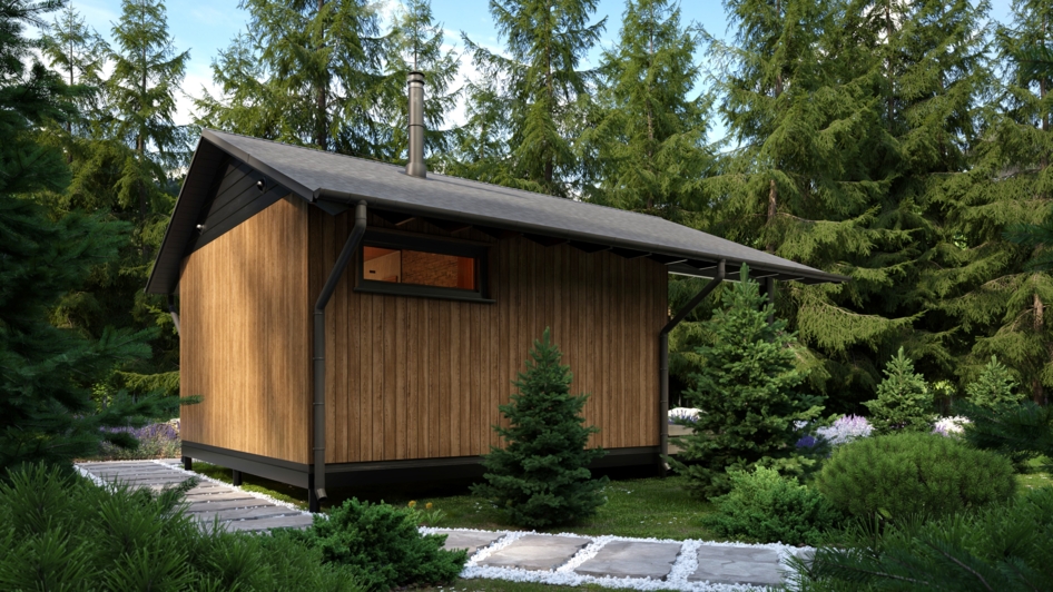 Запрос от клиента - визуализации интерьера и экстерьера бани. Экстерьер бани сделали в двух вариантах: с крытой террасой и без нее. Заказчик просил показать баню в окружении елового леса с ландшафтным оформлением на участке.