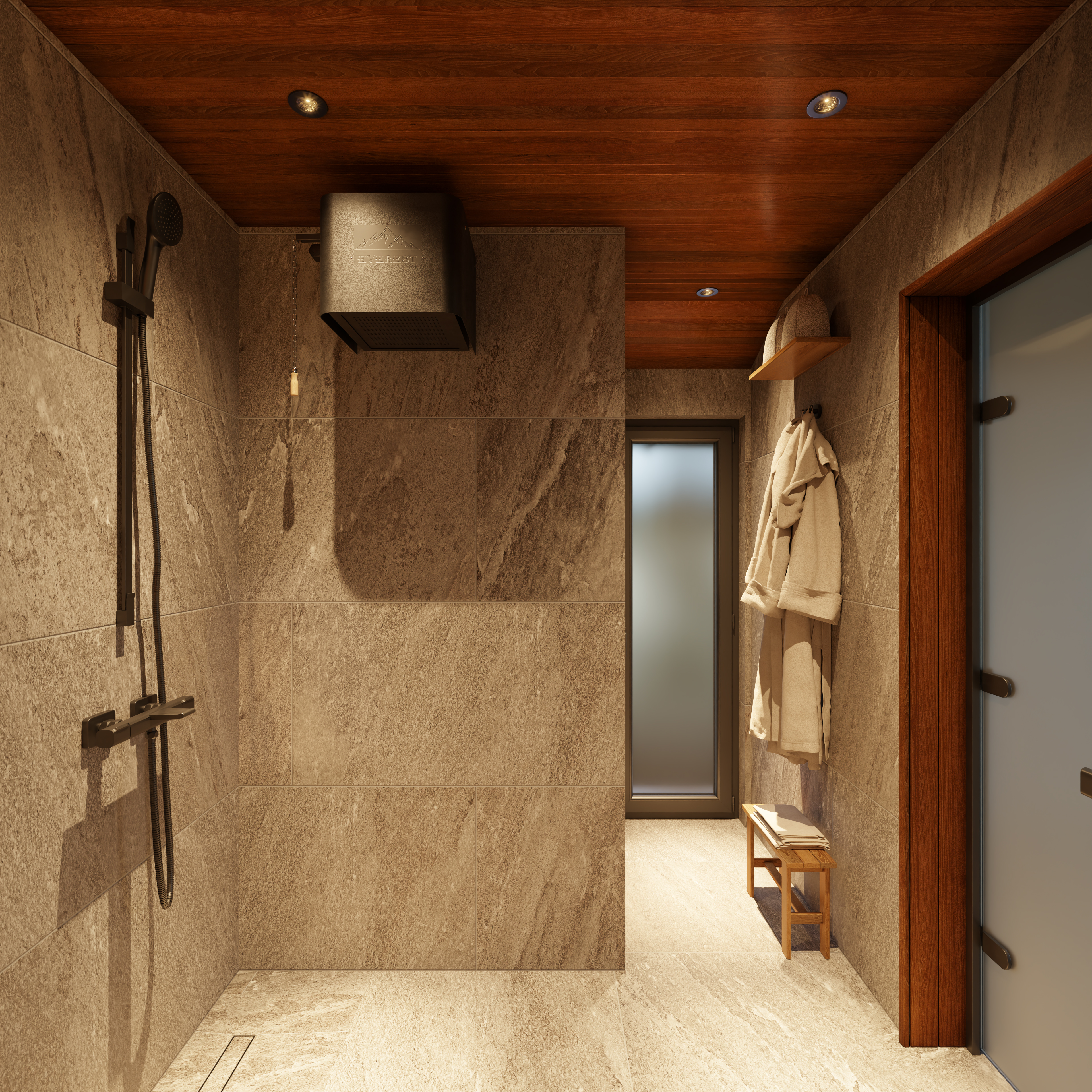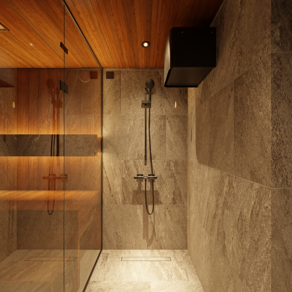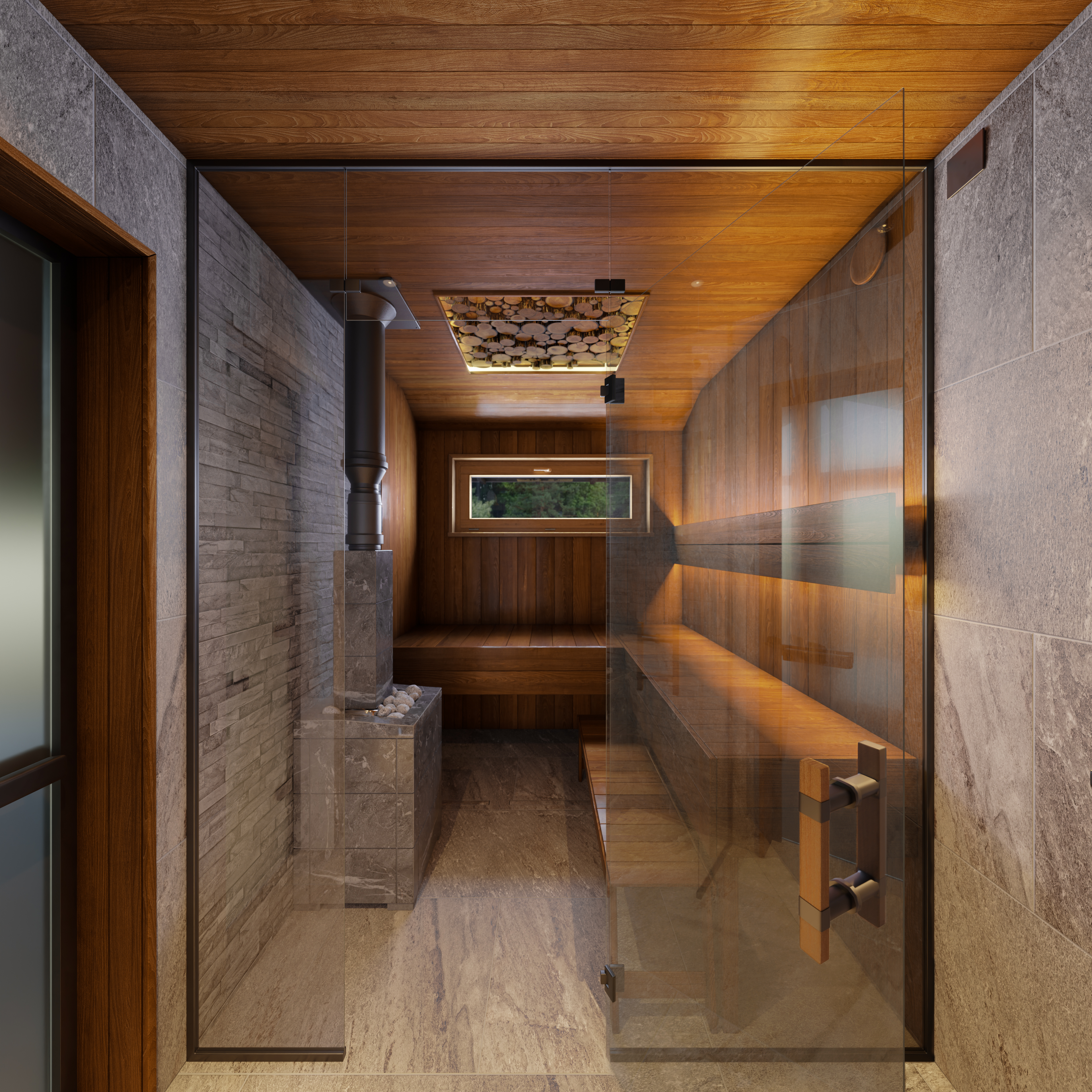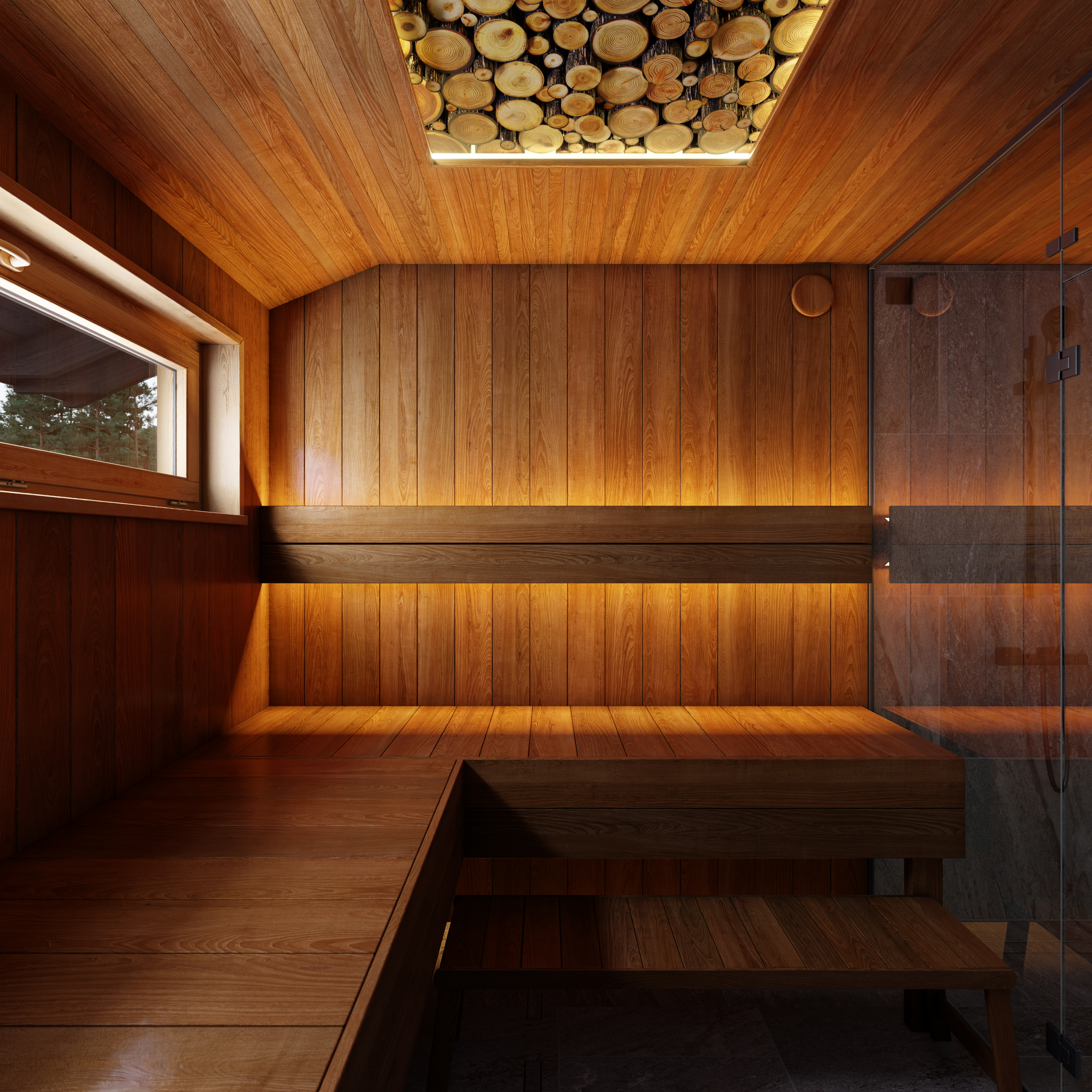 Запрос от клиента - визуализации интерьера и экстерьера бани. Экстерьер бани сделали в двух вариантах: с крытой террасой и без нее. Заказчик просил показать баню в окружении елового леса с ландшафтным оформлением на участке.