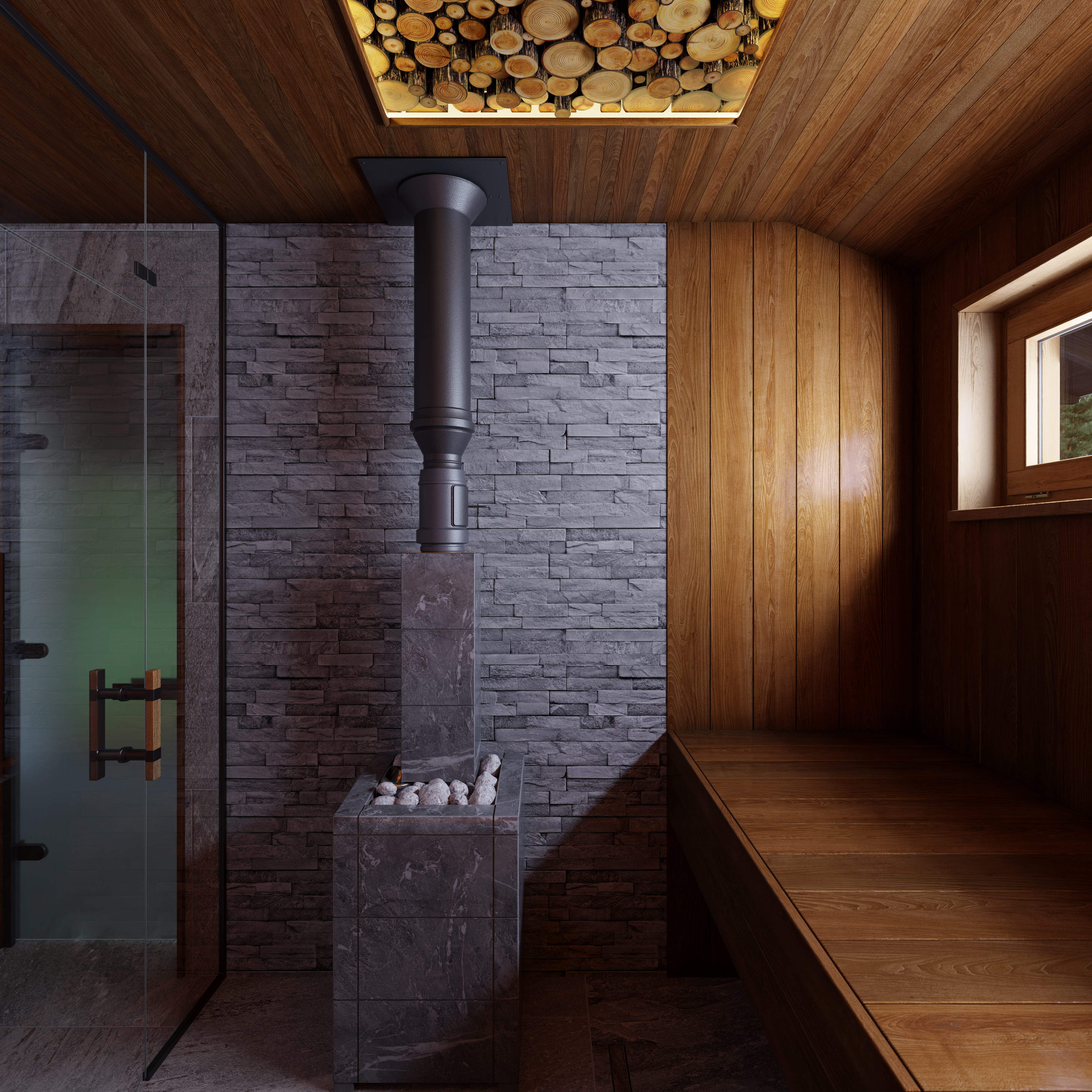 - моделирование бани внутри и снаружи. Кстати, в проектах я часто моделирую не только непосредственно главный объект, но и некоторые предметы экстерьера и интерьера. Например, в этом проекте я моделировала с нуля наружный дымоход, наружные вентиляционные выходы в виде полусферы.
