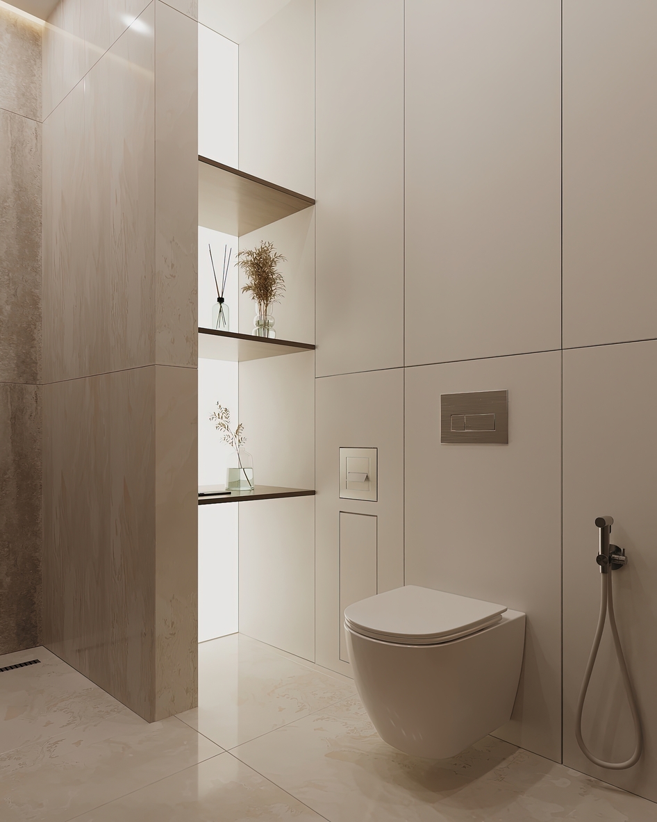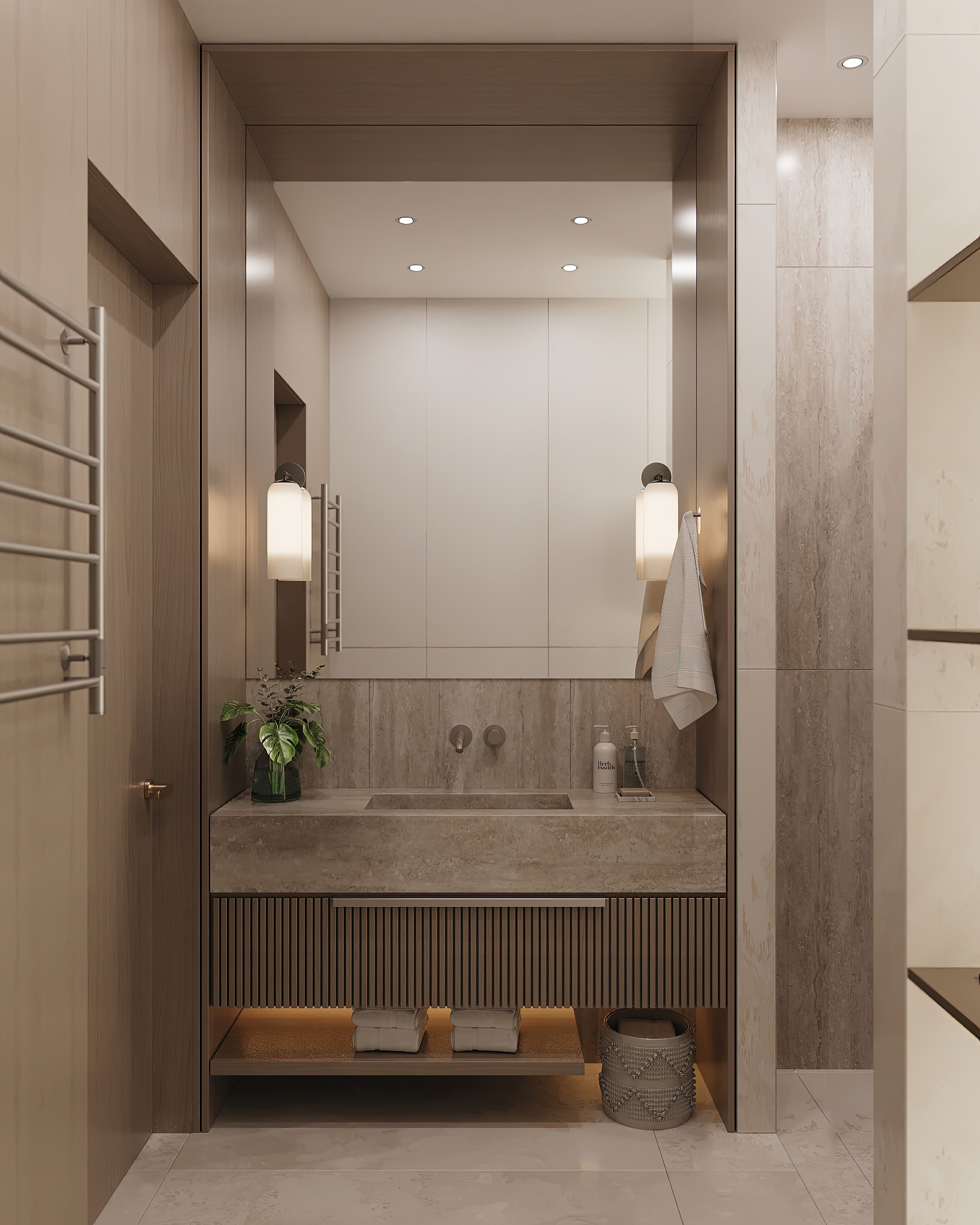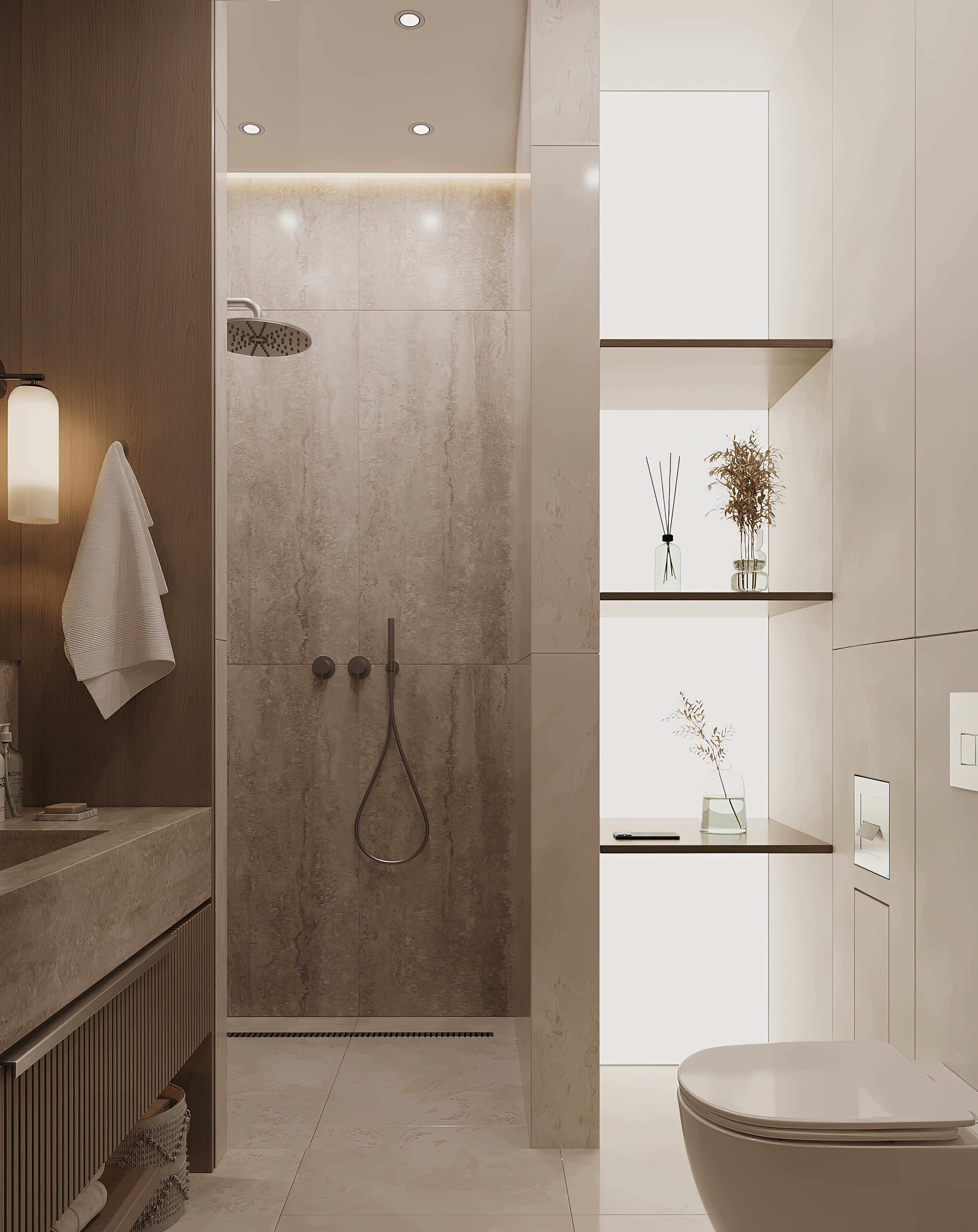 This interior conveys a calm clean and refined vibe through warm minimal tones natural stone and wood textures soft lighting and clean lines creating a spa like atmosphere balanced with modern elegance and quiet comfort.