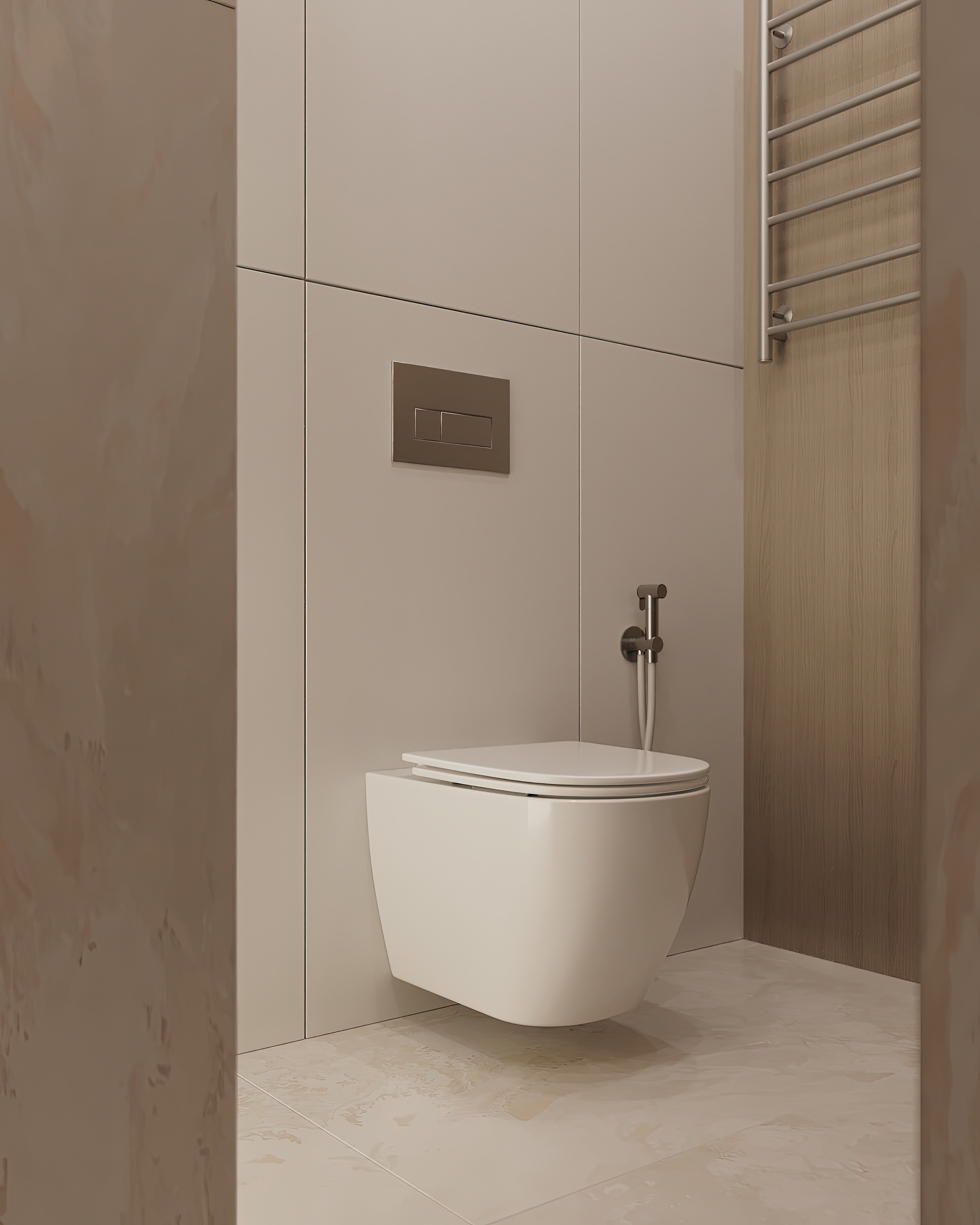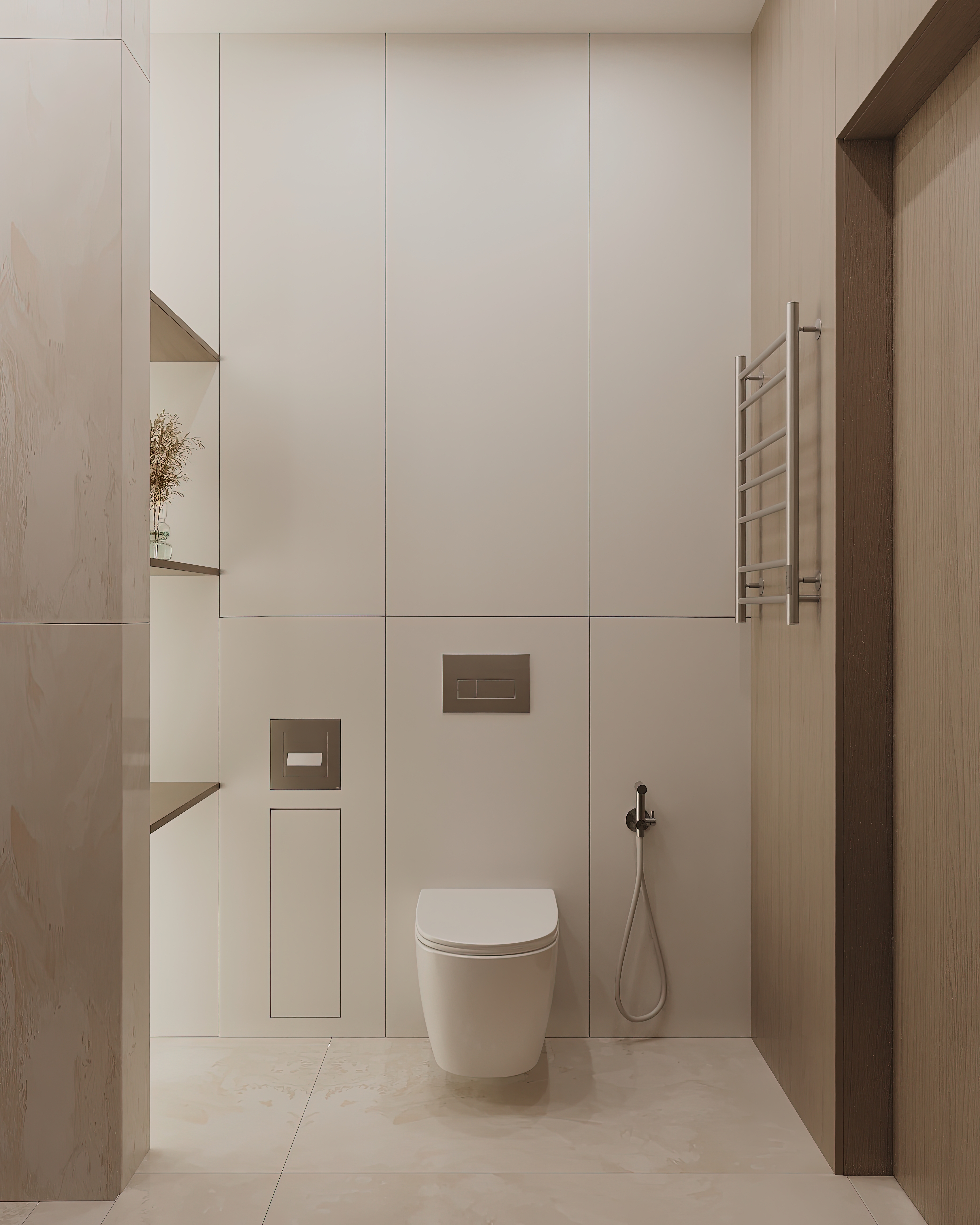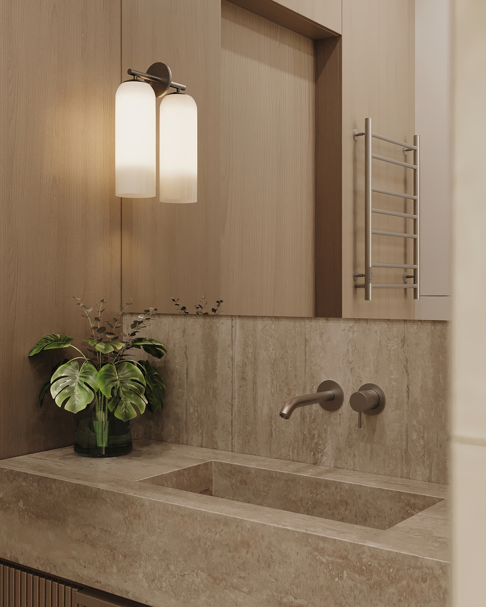 This interior conveys a calm clean and refined vibe through warm minimal tones natural stone and wood textures soft lighting and clean lines creating a spa like atmosphere balanced with modern elegance and quiet comfort.