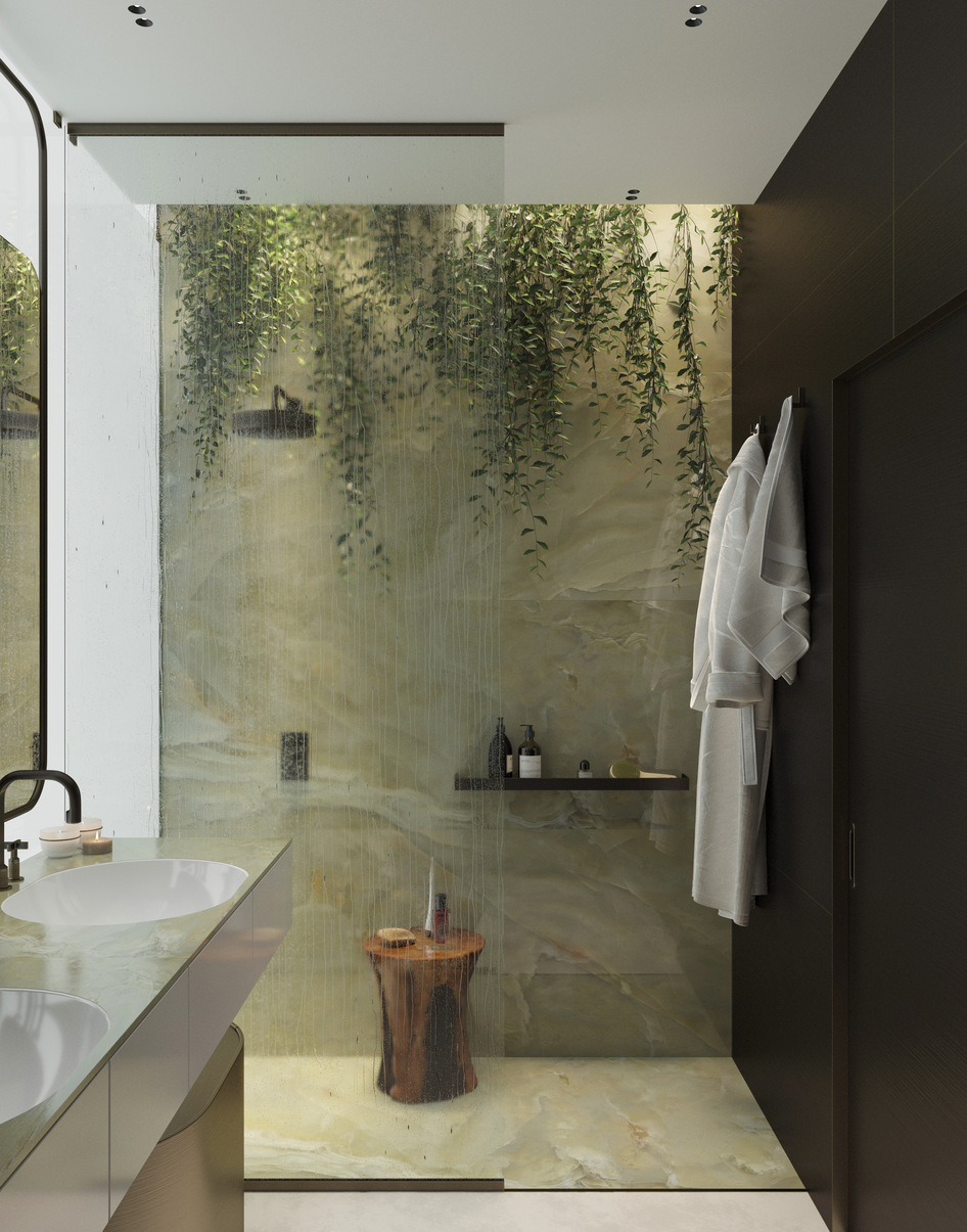 Плитка с зеленюшкой смотрятся гармонично и светящаяся стена тоже интересно. Только если это стекло, должны быть стыки наверное.