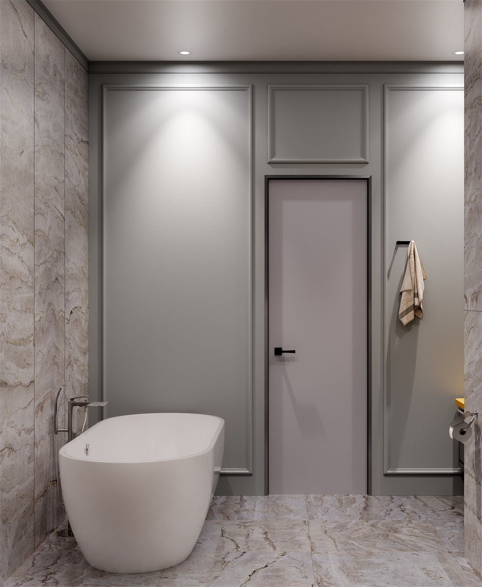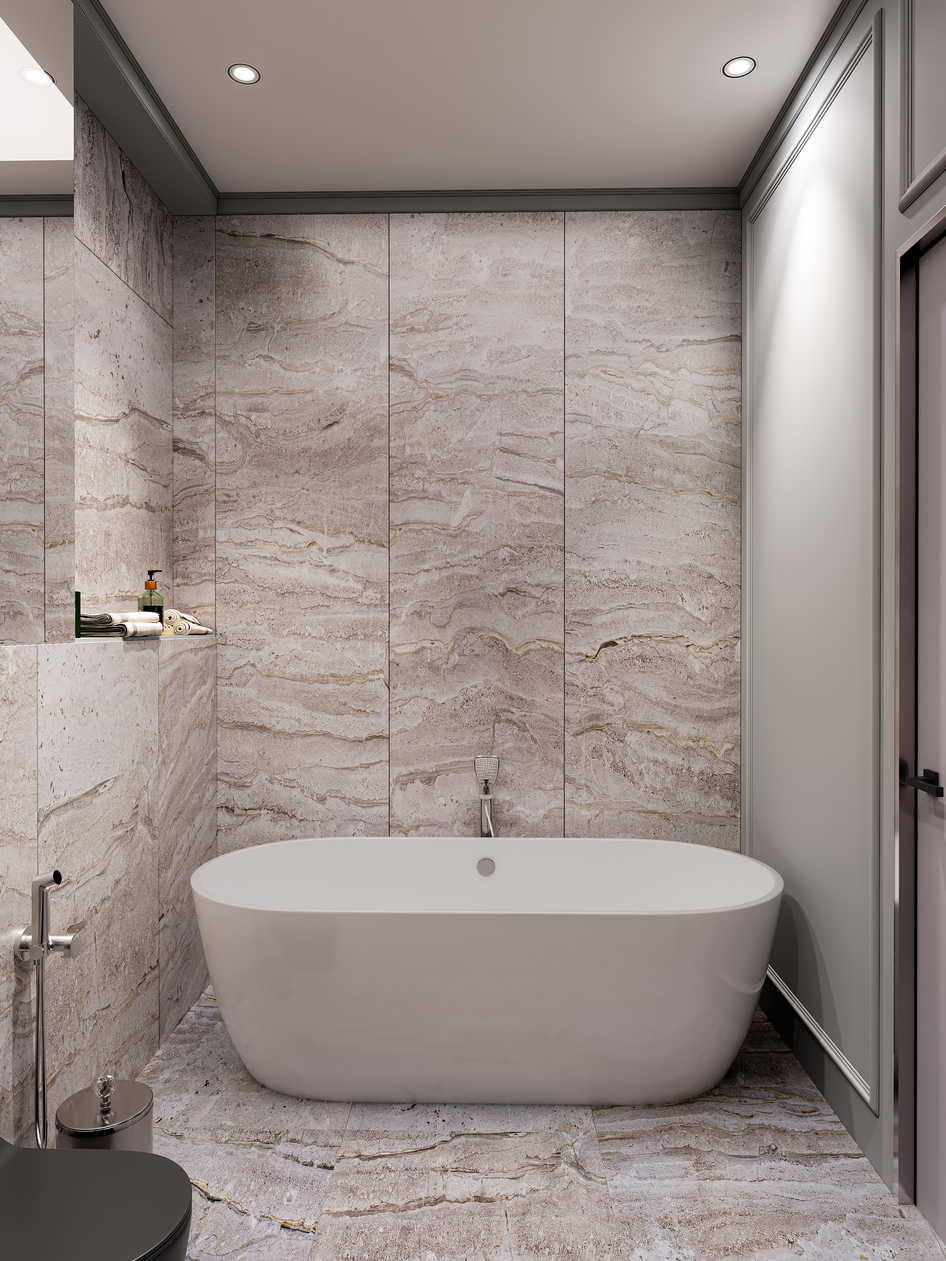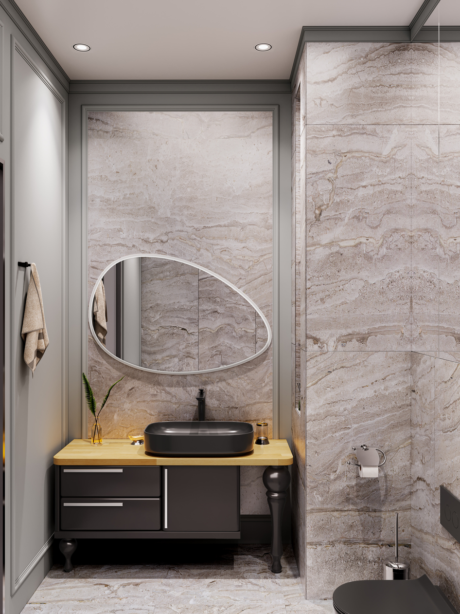 Дизайн санузла выполнен на основе референсов. Почти все элементы интерьера , кроме шампуней и полотенец, смоделированы мной.