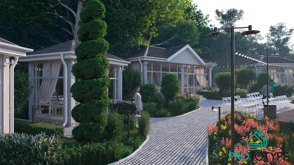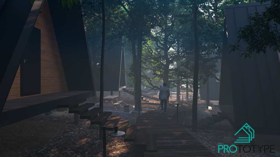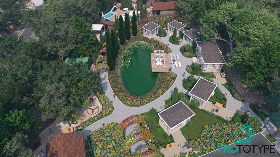 Проект базы отдыха под Новороссийском. В многофункциональной базе размещены беседки, администрация, бассейн, бани и домики A-frame. Весь проект выполнен в Revit, для визуализации передан в 3ds Max, рендер Corona 9. Проект выполнен одной сценой.