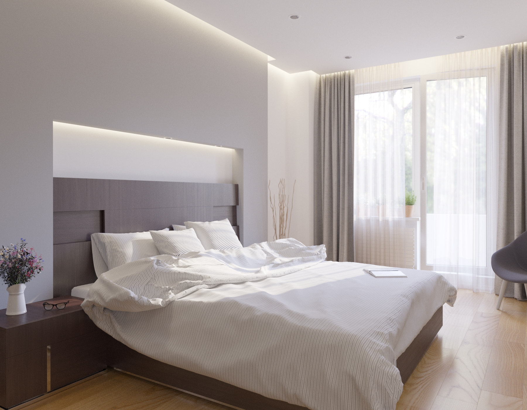 Текстуры наложены на бельё ужасно. Больше так не делайте. Встроенные светильники у изголовья к чему? Там же есть мягкий свет из ниши... Отражение и цвет экрана ТВ- без комментариев, огорчает. Ну я думаю вы уже сами всё поняли к этому времени...