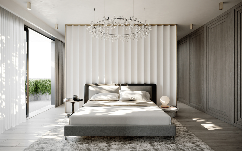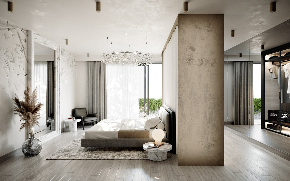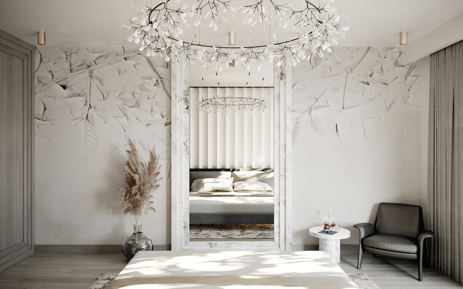 Зачем зеркало напротив кровати, если огромная зеркальная стена за гардеробной, можно было бы задекорировать стену по другому. В целом интерьер хороший.