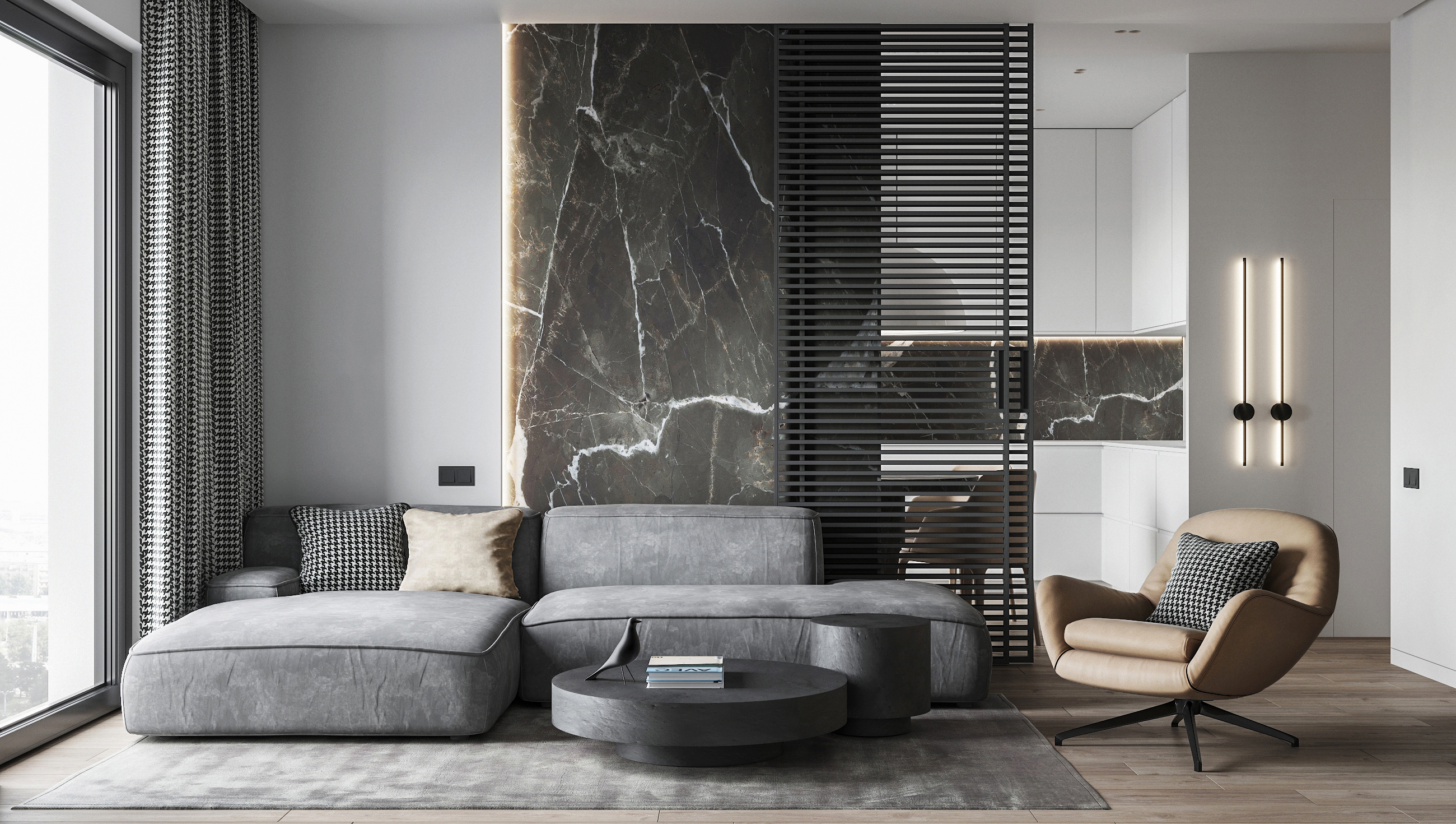 чуточку переборщили со скадками на диване и не совсем понятны материалы на ковре и журнальных столиках