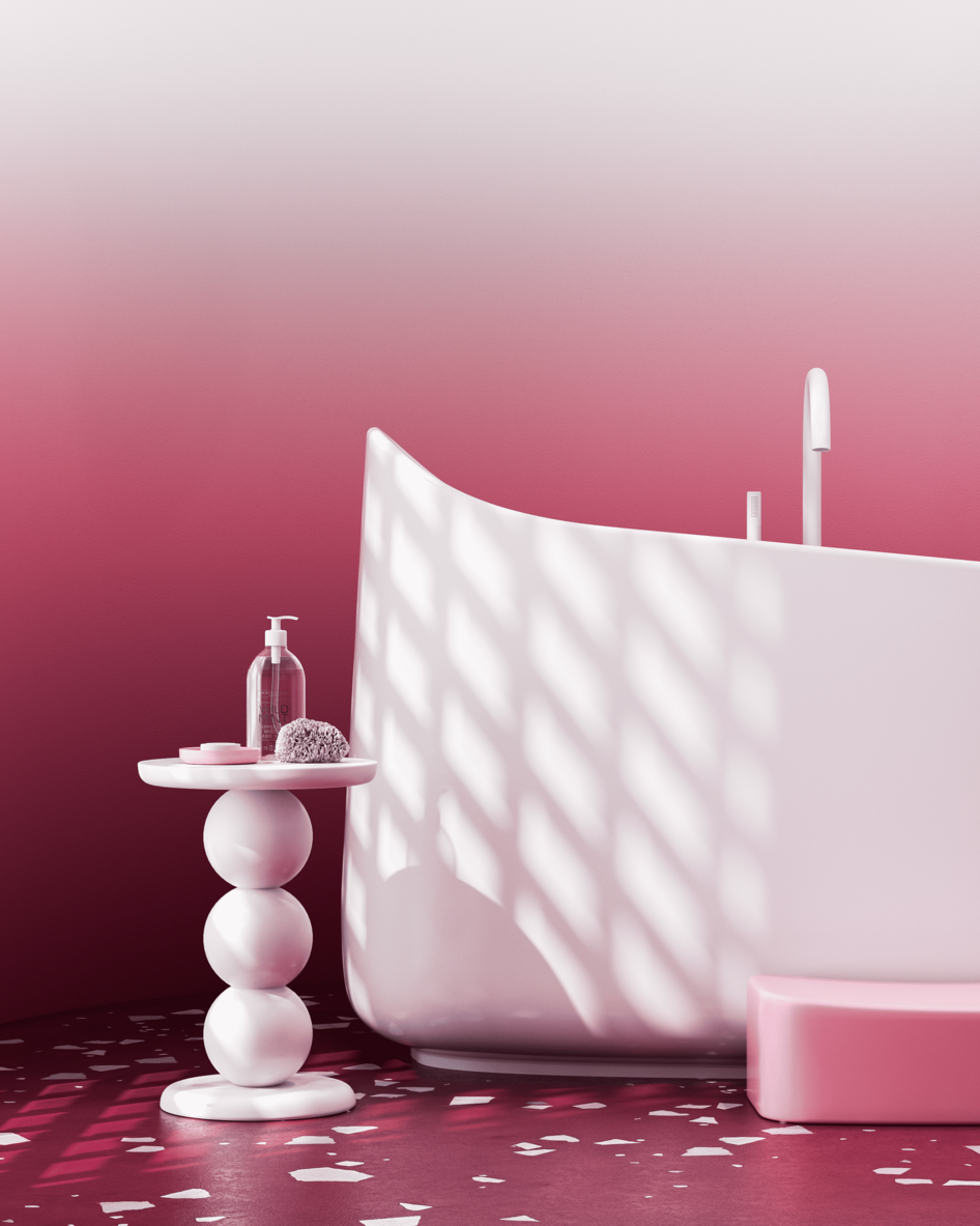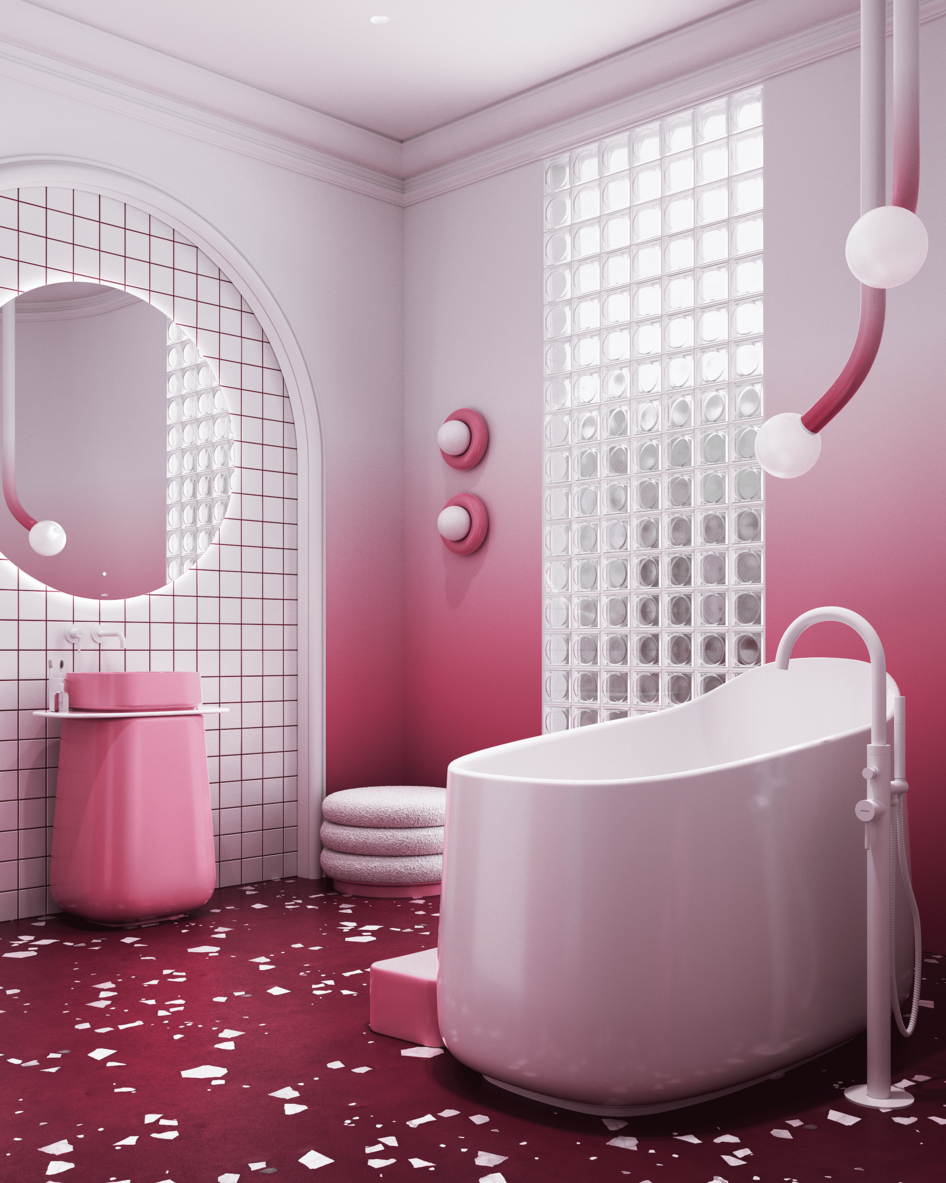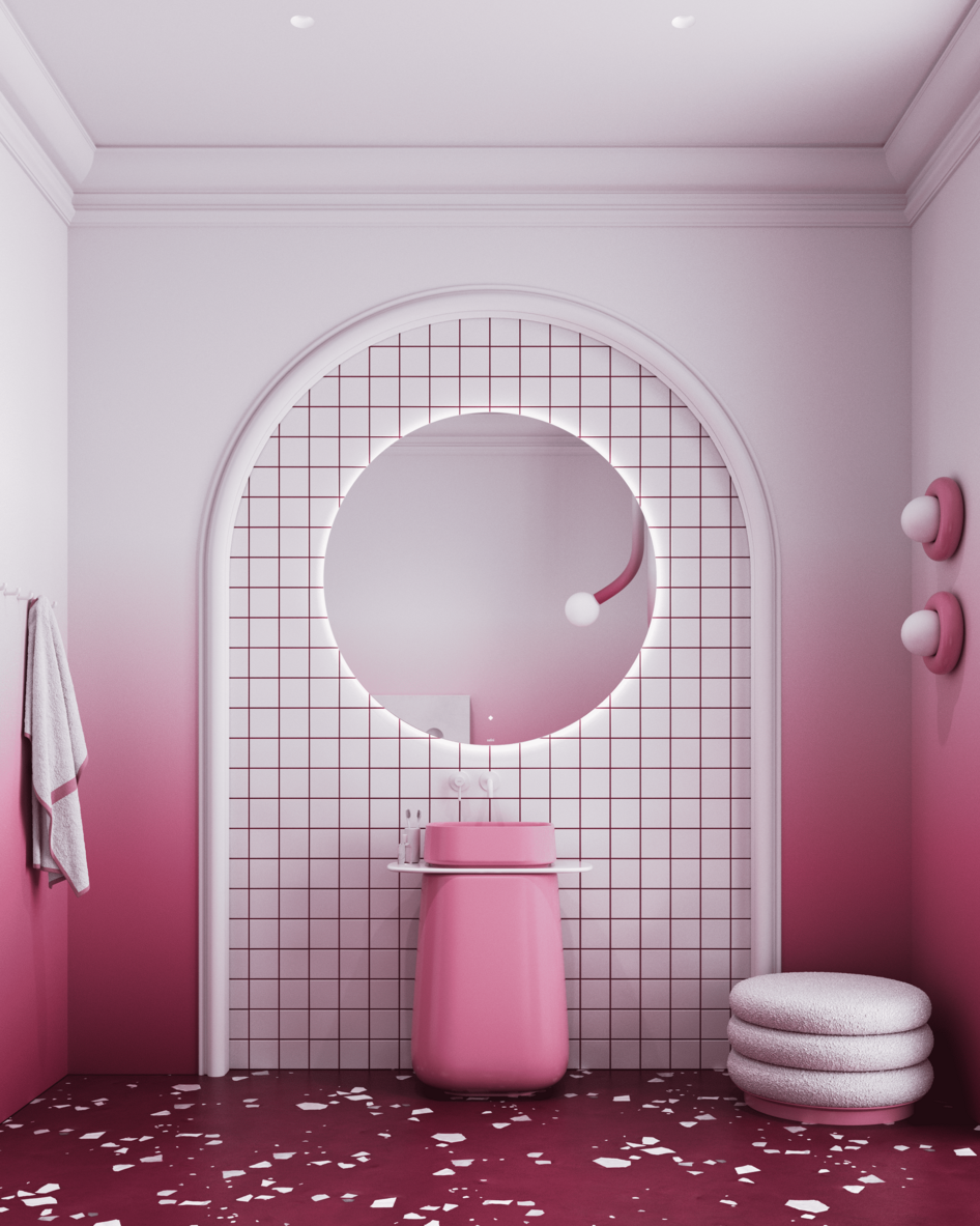 Этот интерьер для конкурса производителя сантехники воплощает образ изысканного ягодного десерта. Пространство построено на мягком градиенте — от насыщенного брусничного пола к воздушно-белым стенам. Центральным элементом выступает скульптурная белая ванна, ассиметричная форма которой напоминает пики взбитых сливок. Её дополняет нежно-розовая раковина, похожая на сочную ягоду в облаке безе.