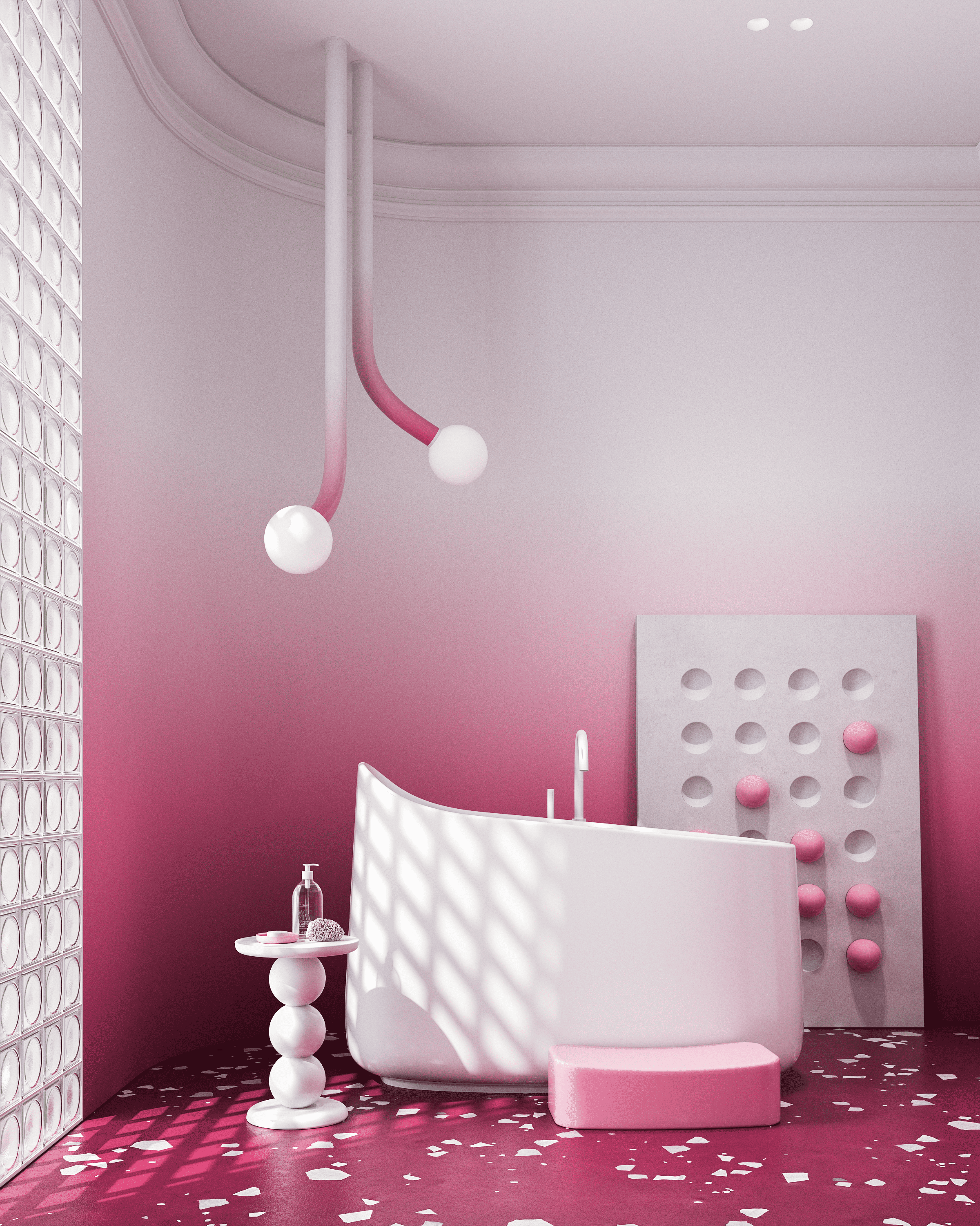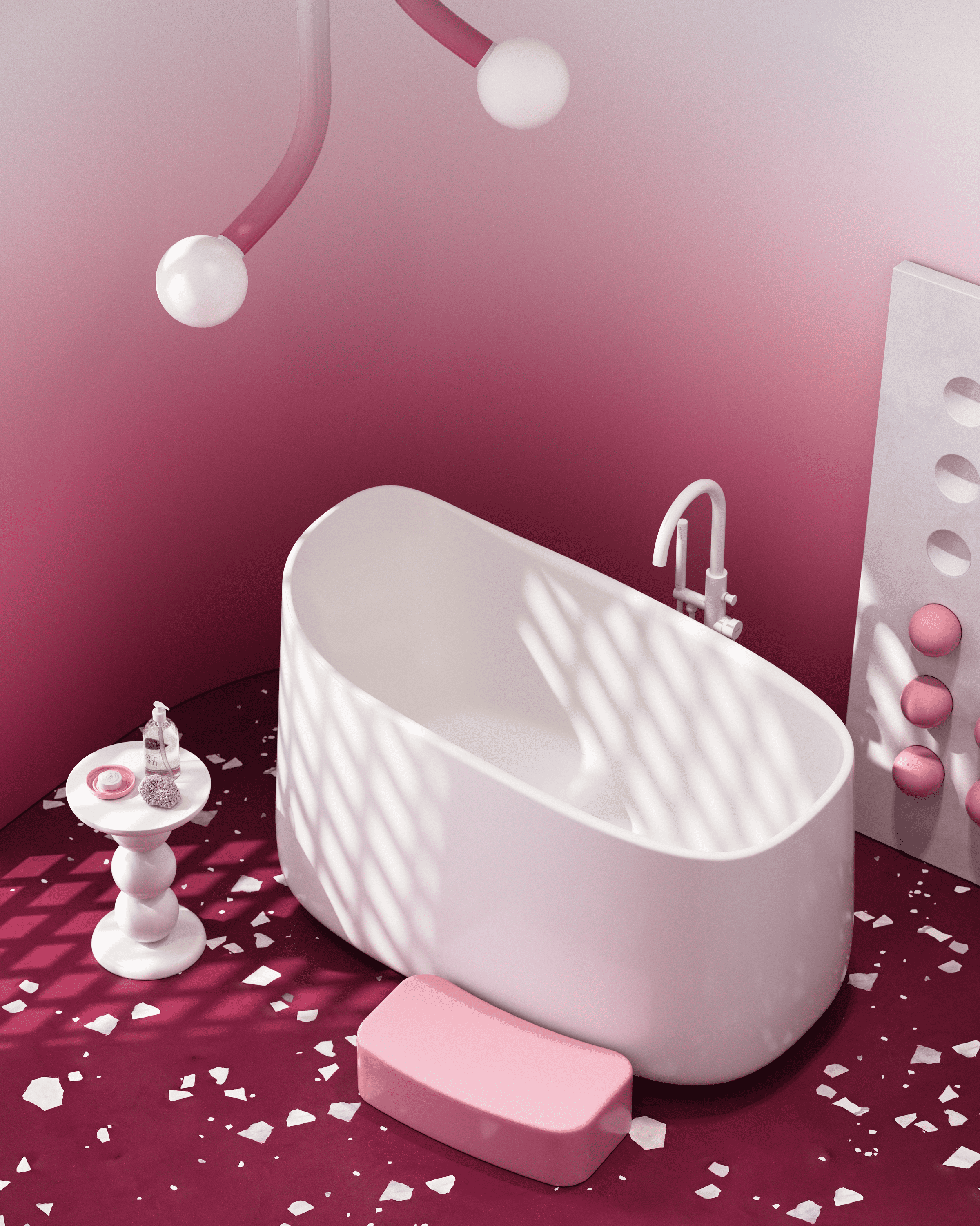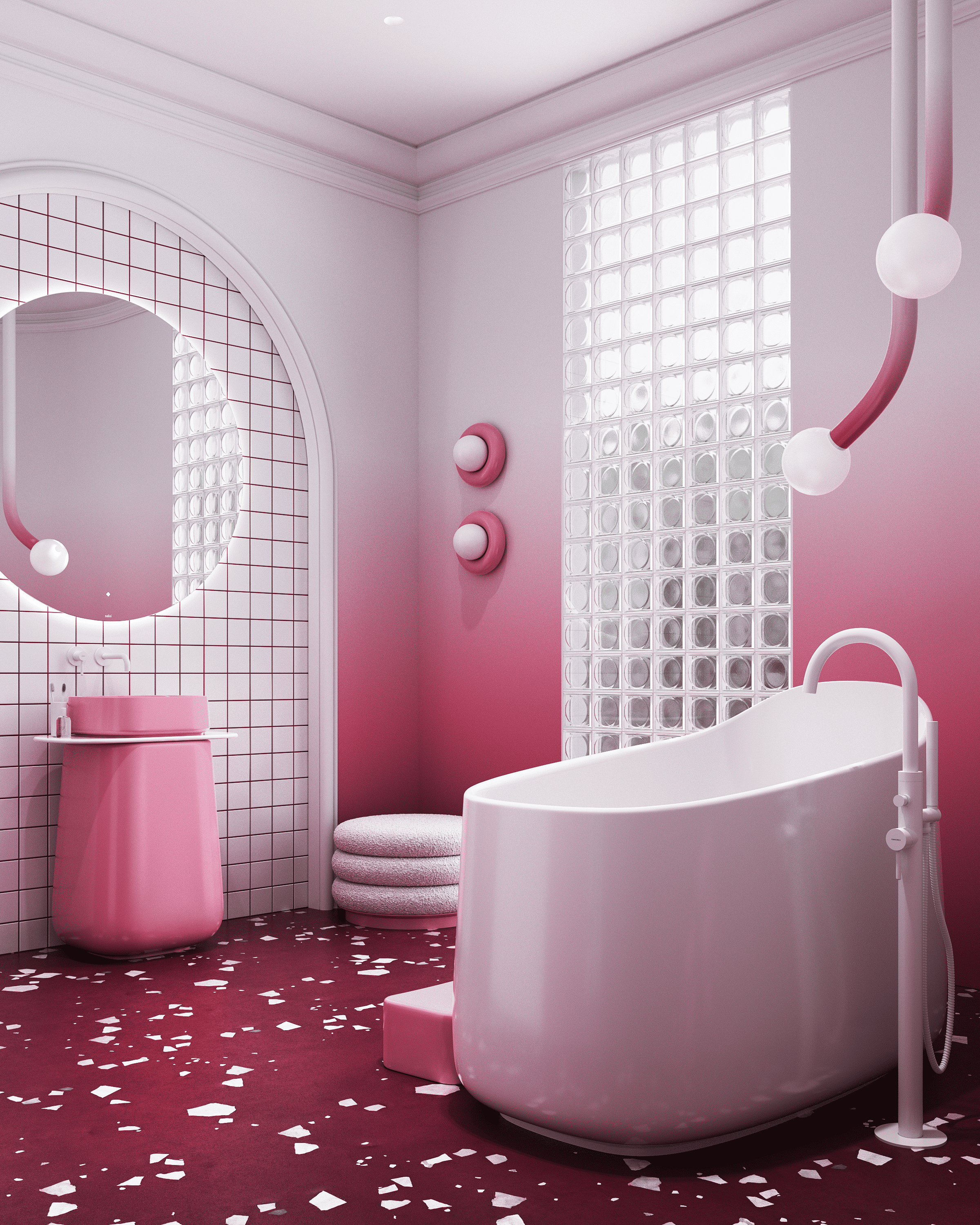 Этот интерьер для конкурса производителя сантехники воплощает образ изысканного ягодного десерта. Пространство построено на мягком градиенте — от насыщенного брусничного пола к воздушно-белым стенам. Центральным элементом выступает скульптурная белая ванна, ассиметричная форма которой напоминает пики взбитых сливок. Её дополняет нежно-розовая раковина, похожая на сочную ягоду в облаке безе.