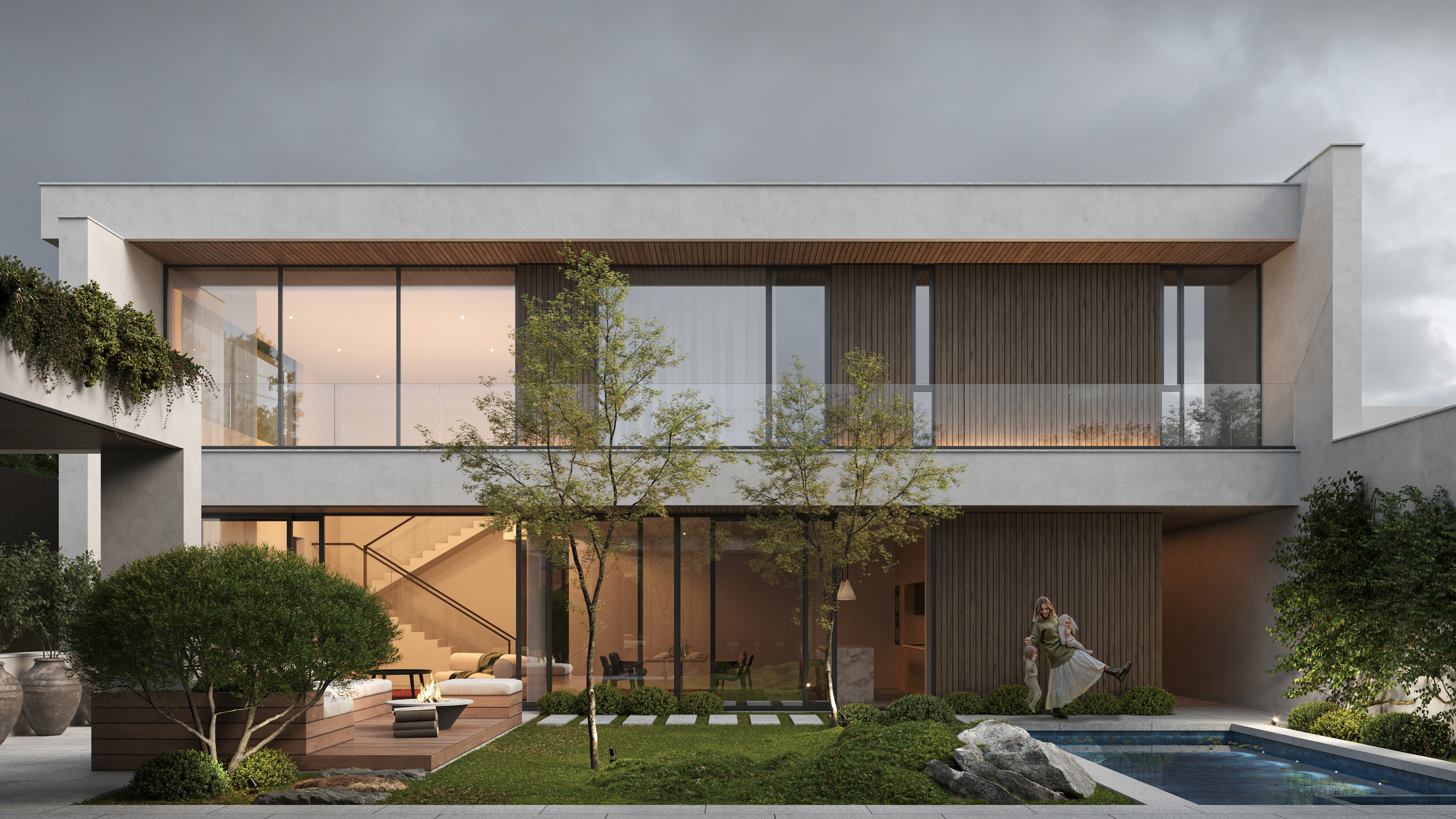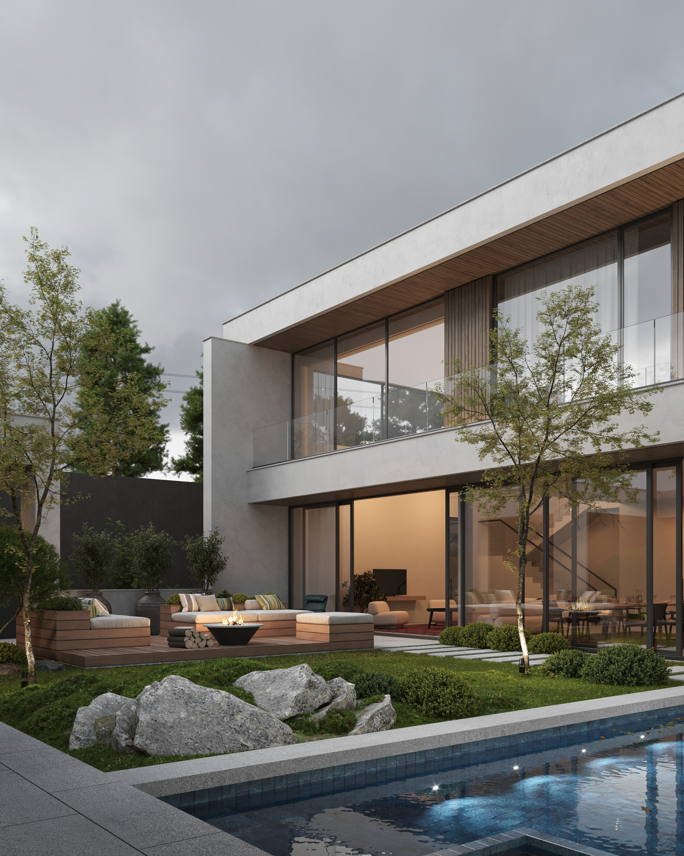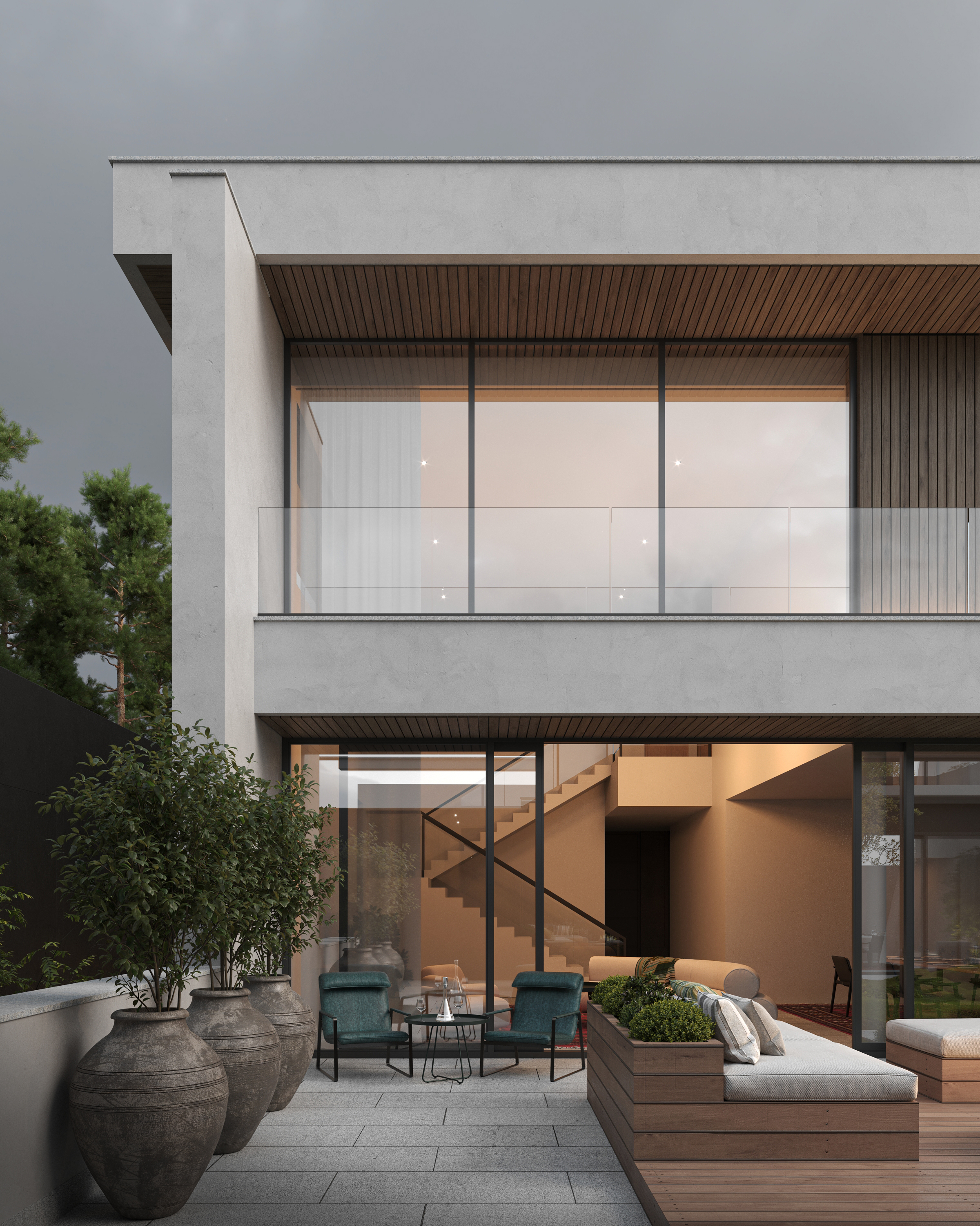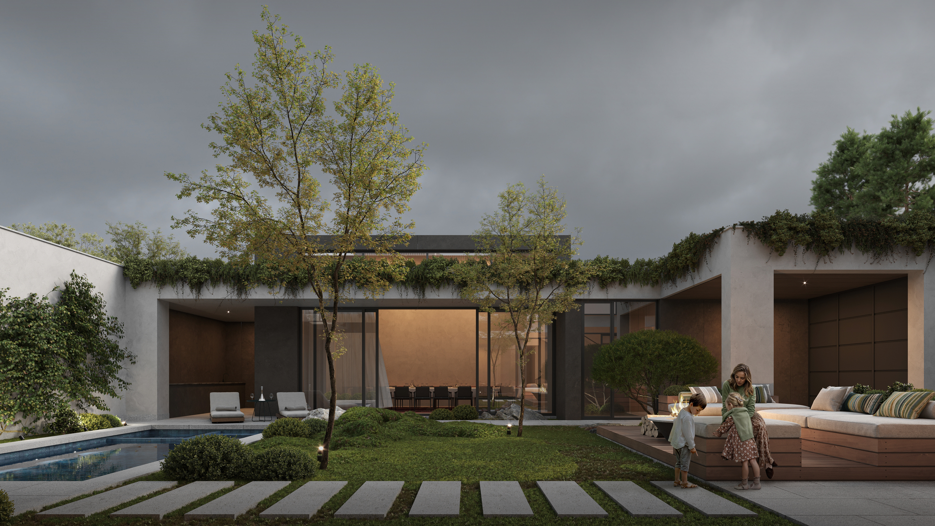 Проект создаёт комфортный баланс между открытым двором и внутренними пространствами.