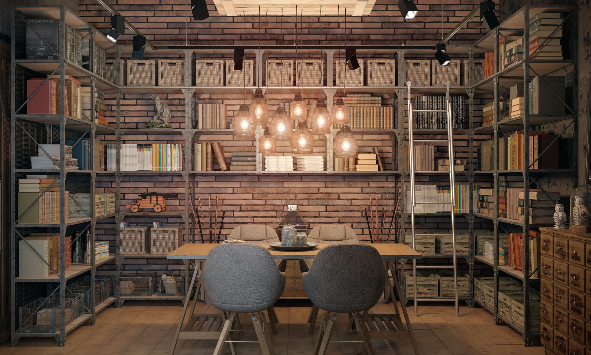 Что то я запутался, подписано "Библиотек мастерская", в коменте "Офис"??? мастерская подразумевает пыль и грязь, как это сочетается с библиотекой.... незнаю.... А в общем мрачно но симпатично