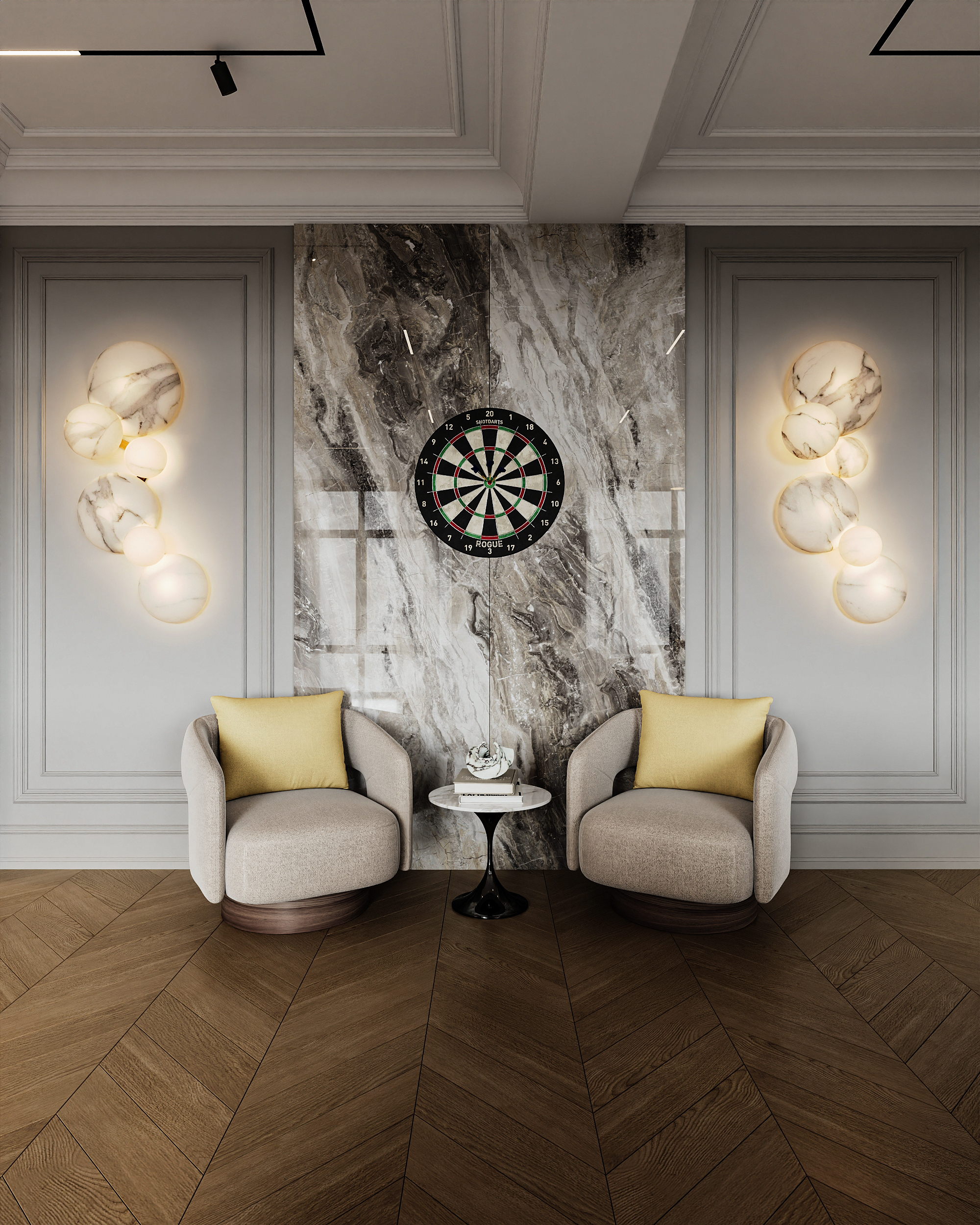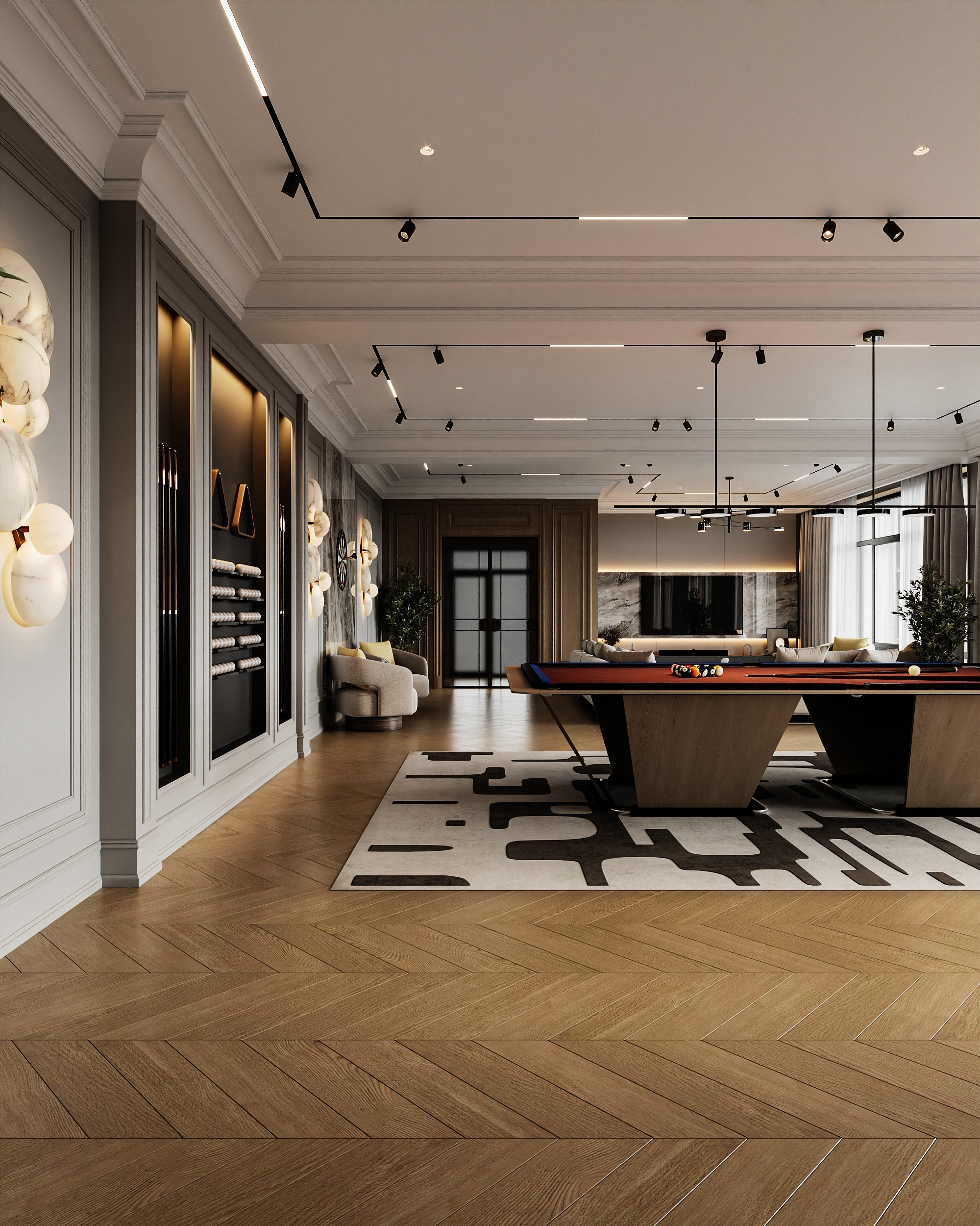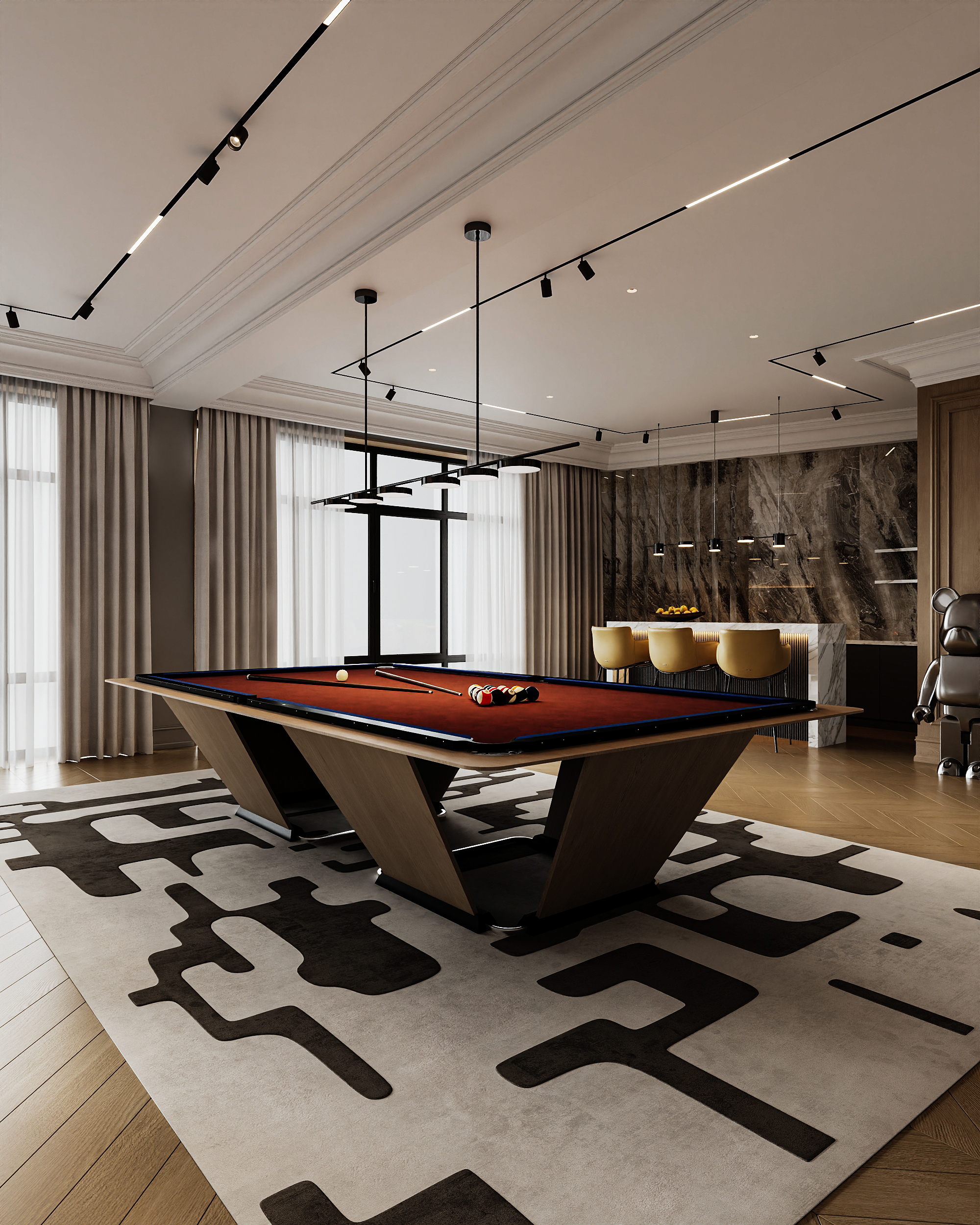 Шары прямо на пол падают? Где скаты или сетка. У хороших столов бильярдных столешница из сланца 40 см. А тут ДСП судя по толщине. Если бильярд убрать, то неплохо. Но то как отрендерен стол кровь из глаз льется.
