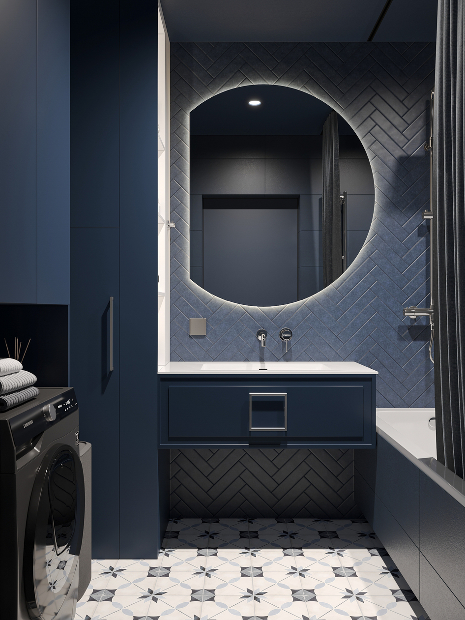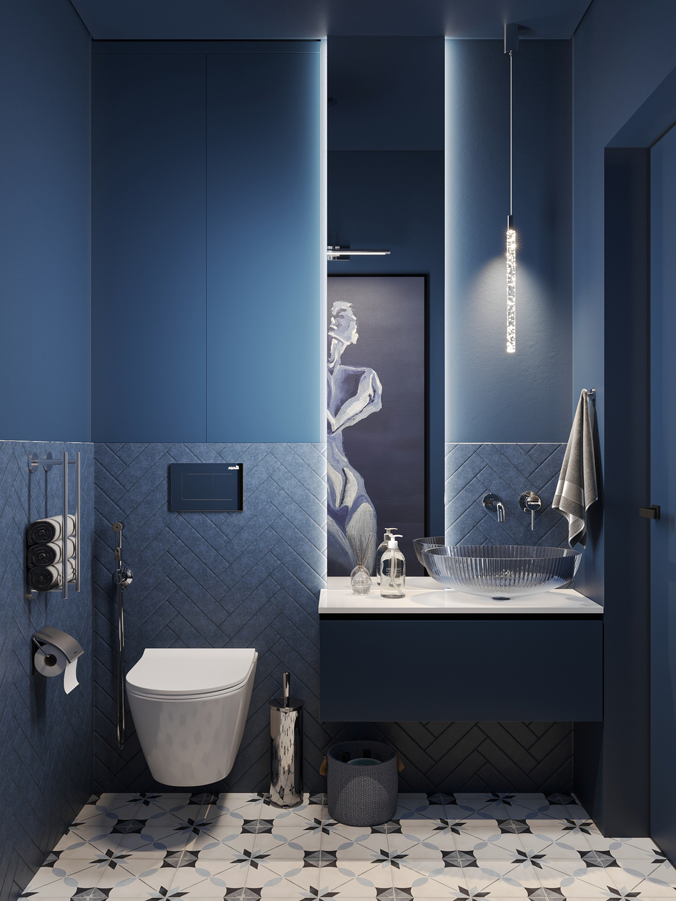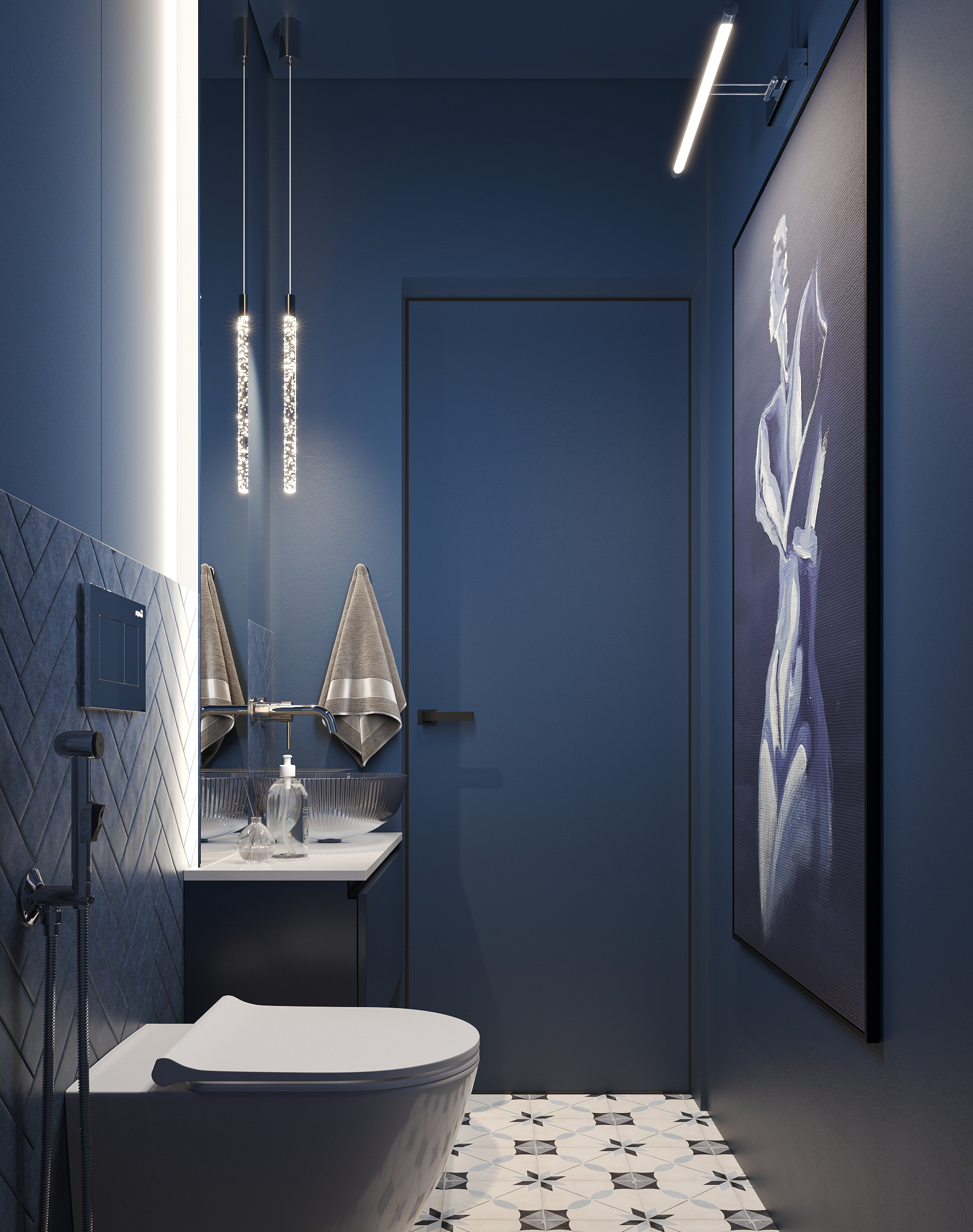 В туалете не стали включать верхний свет, всё освещение на визуализации от зеркала и подвесных светильников.