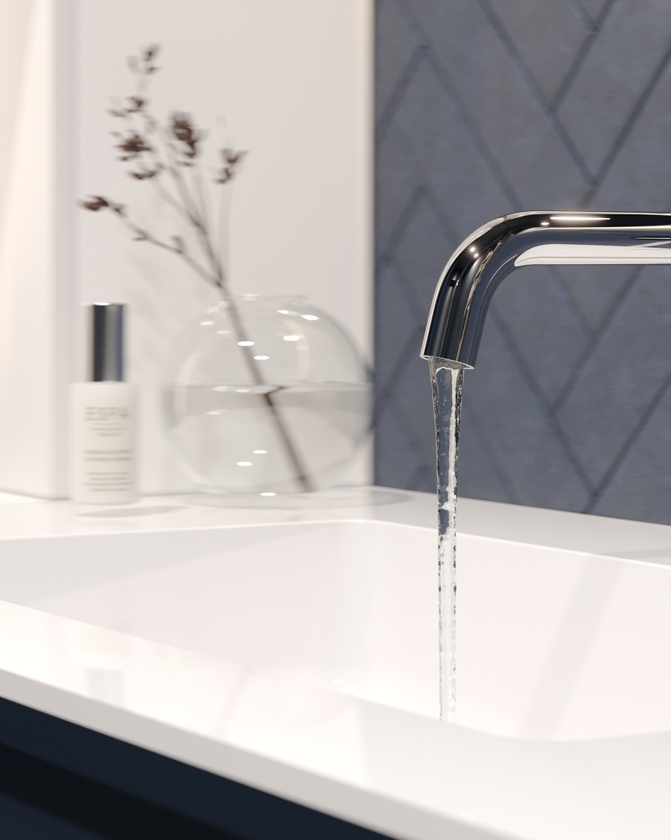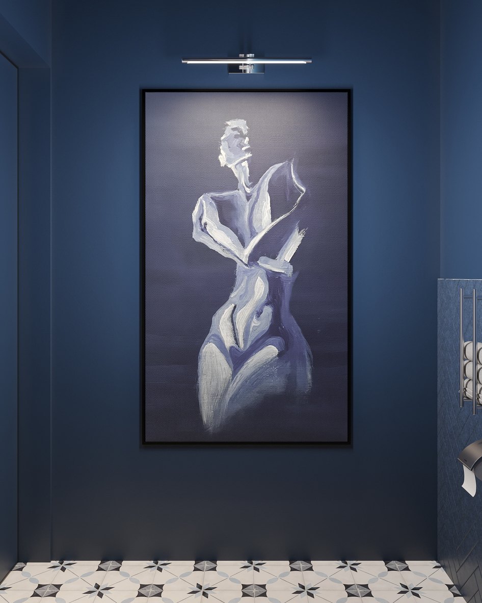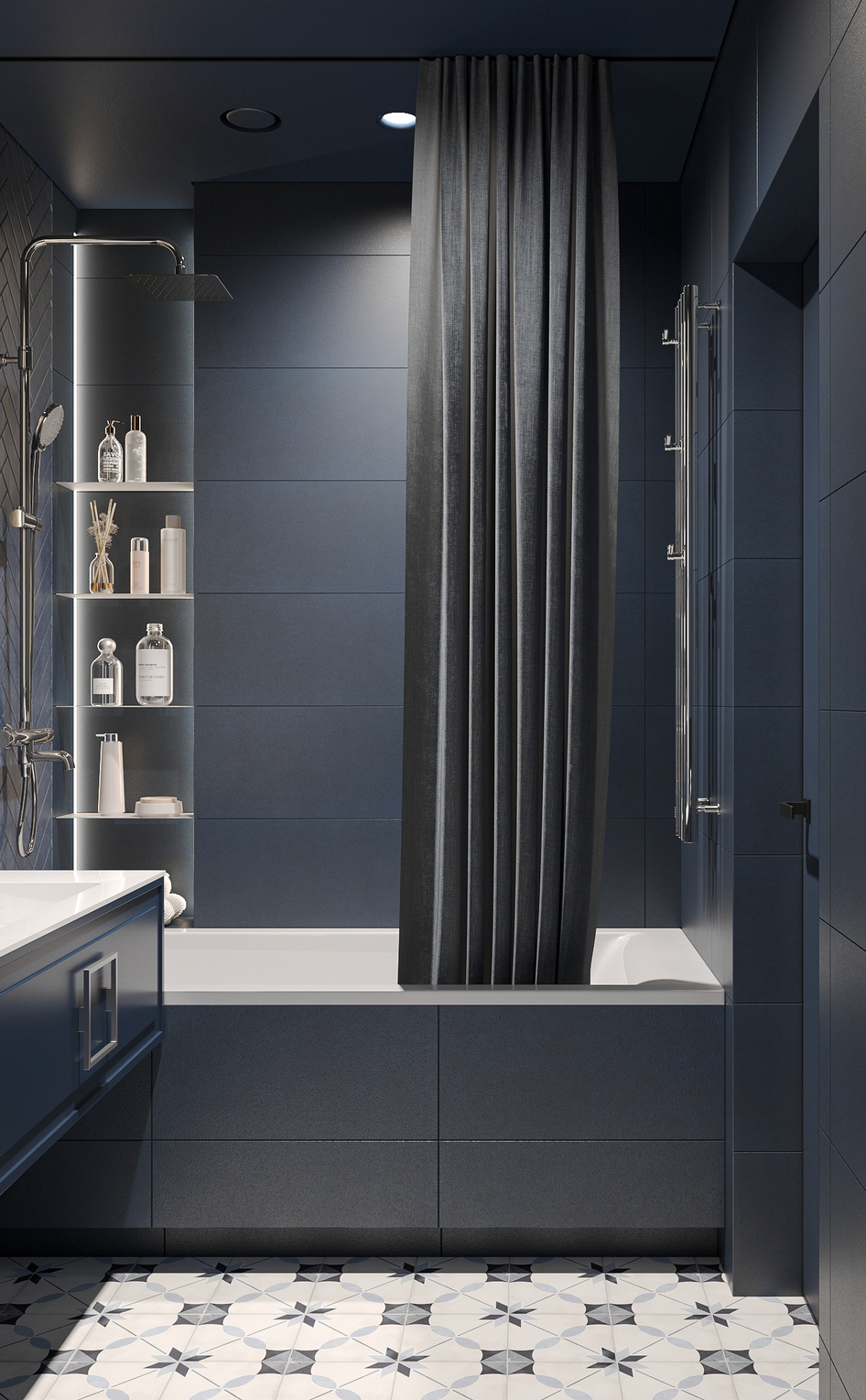 В туалете не стали включать верхний свет, всё освещение на визуализации от зеркала и подвесных светильников.
