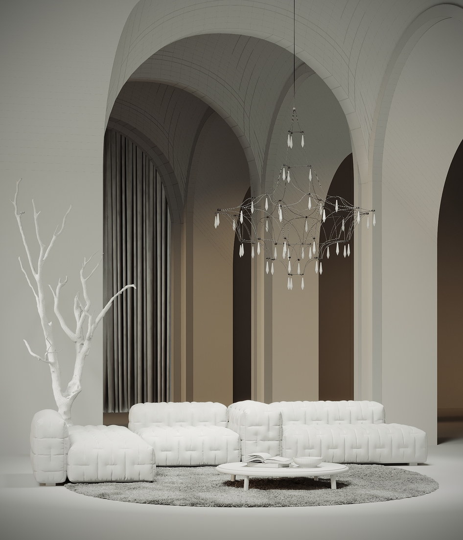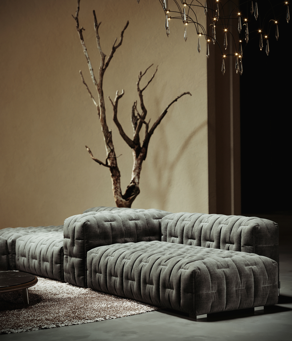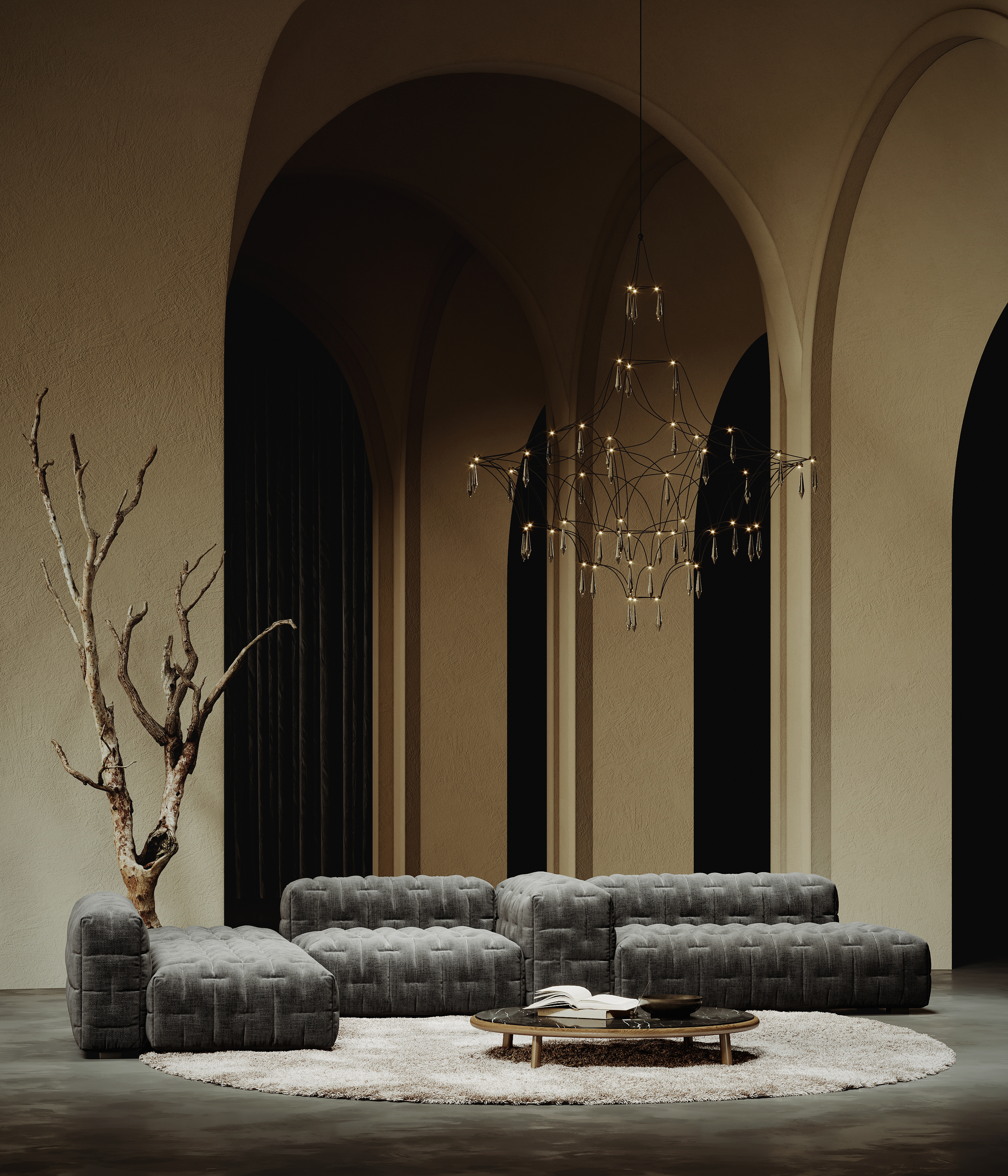Эта визуализация подчеркивает диван BOCA NAVI как центральный элемент сдержанного минималистичного интерьера. Теплая терракотовая обивка мягко контрастирует с серыми тонами помещения, создавая спокойную и сбалансированную атмосферу. Естественный свет, проходящий через легкие шторы, акцентирует внимание на текстурах материалов и композиции пространства.