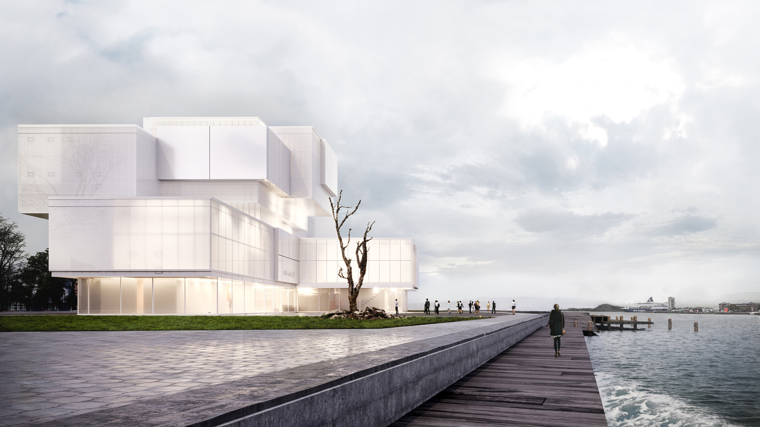 visualization concept idea of modern architecture building with translucent insulation glass blocks located in Denmark it includes 4 floors with art exhibitions and installation inside