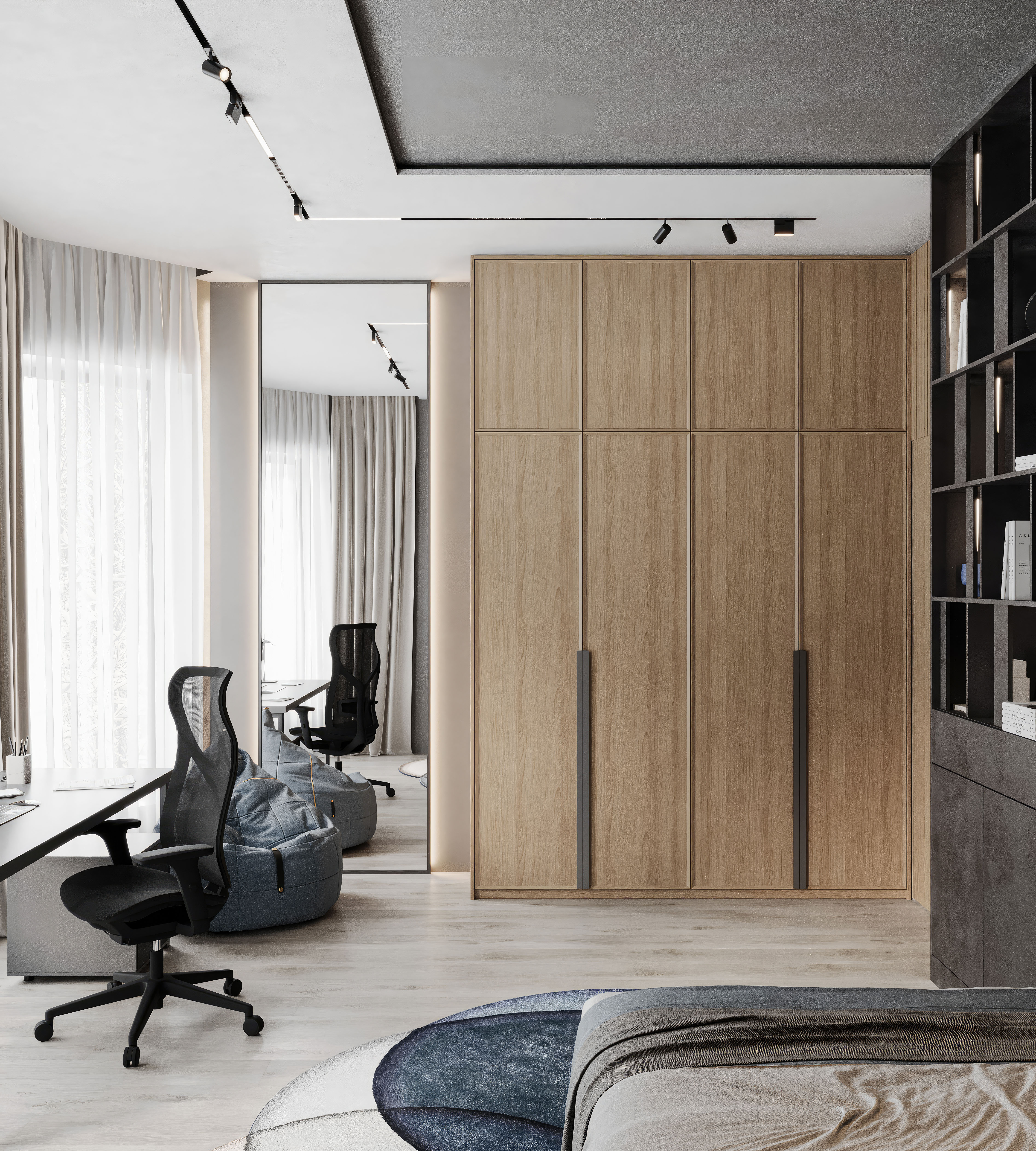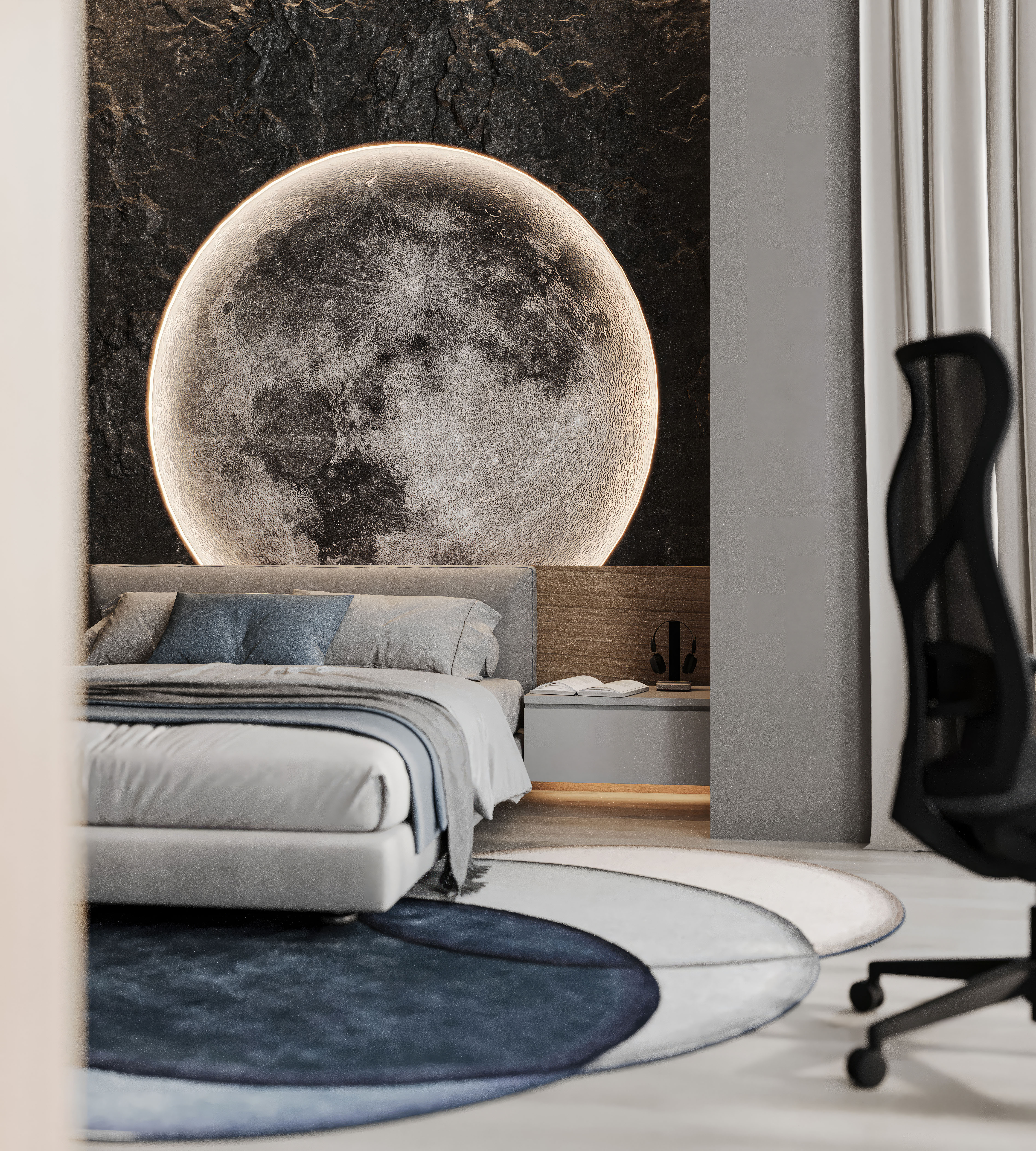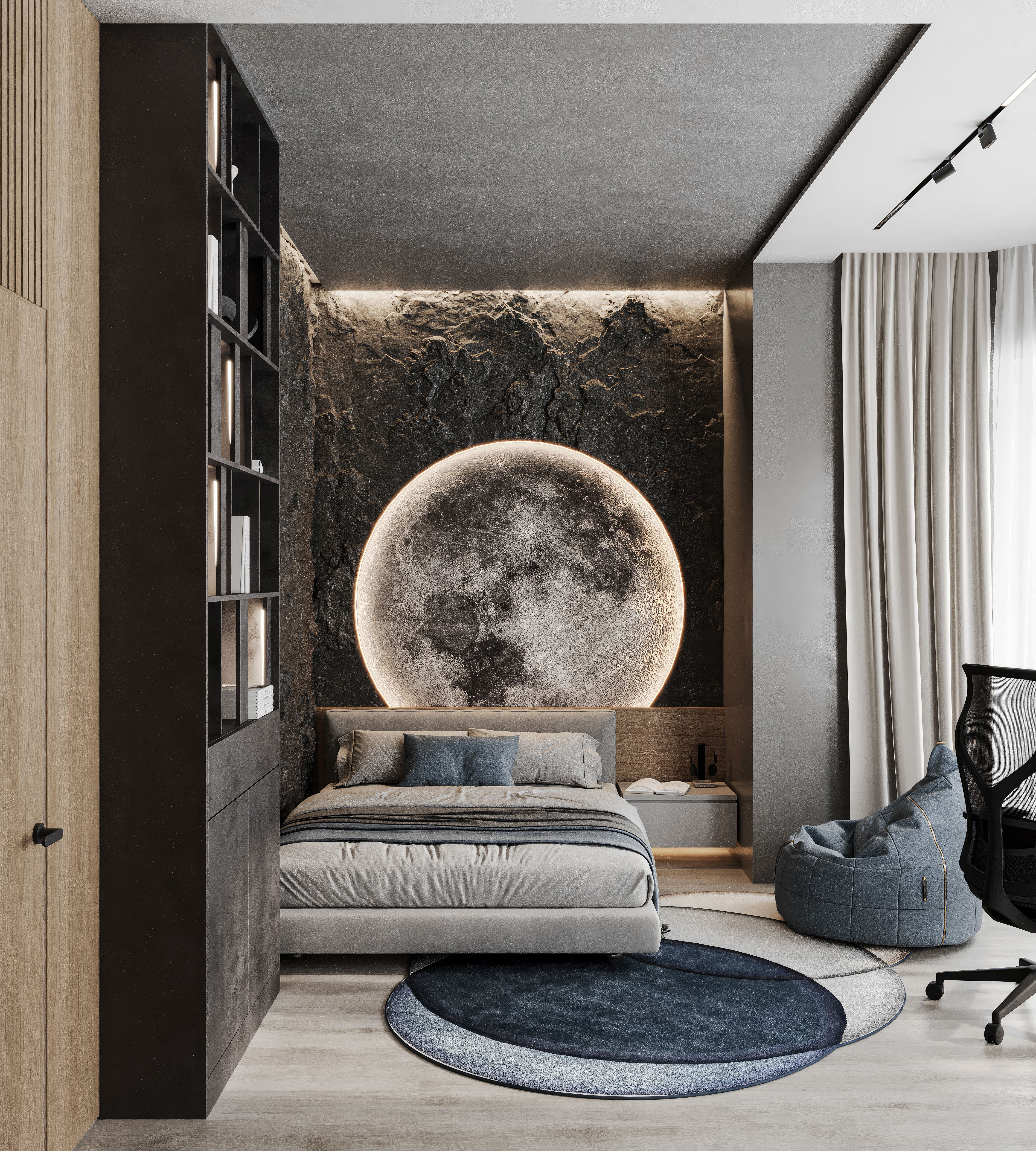 Эта комната создана для мальчика-подростка в индивидуальном доме и сочетает в себе стиль и функциональность. Стеновые панели, имитирующие скальную породу, придают интерьеру брутальности и глубины, а подсвеченная Луна на стене добавляет атмосферу космоса и мечтательности, делая комнату по-настоящему уникальной. Большой рабочий стол у окна обеспечивает комфортное пространство как для учёбы, так и для творчества или игр. Мягкое кресло-мешок и уютная цветовая гамма дополняют образ современной и продуманной до деталей подростковой комнаты.