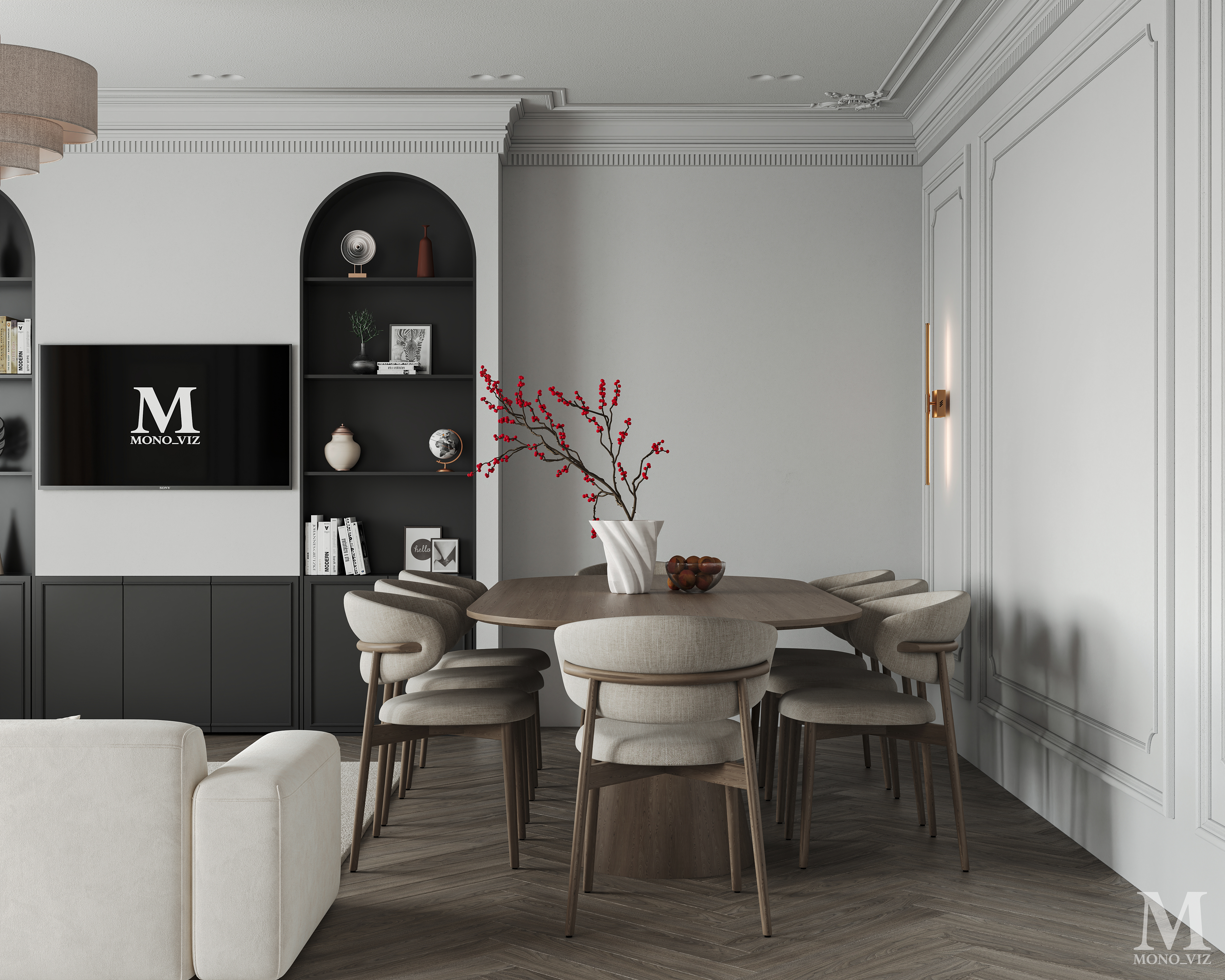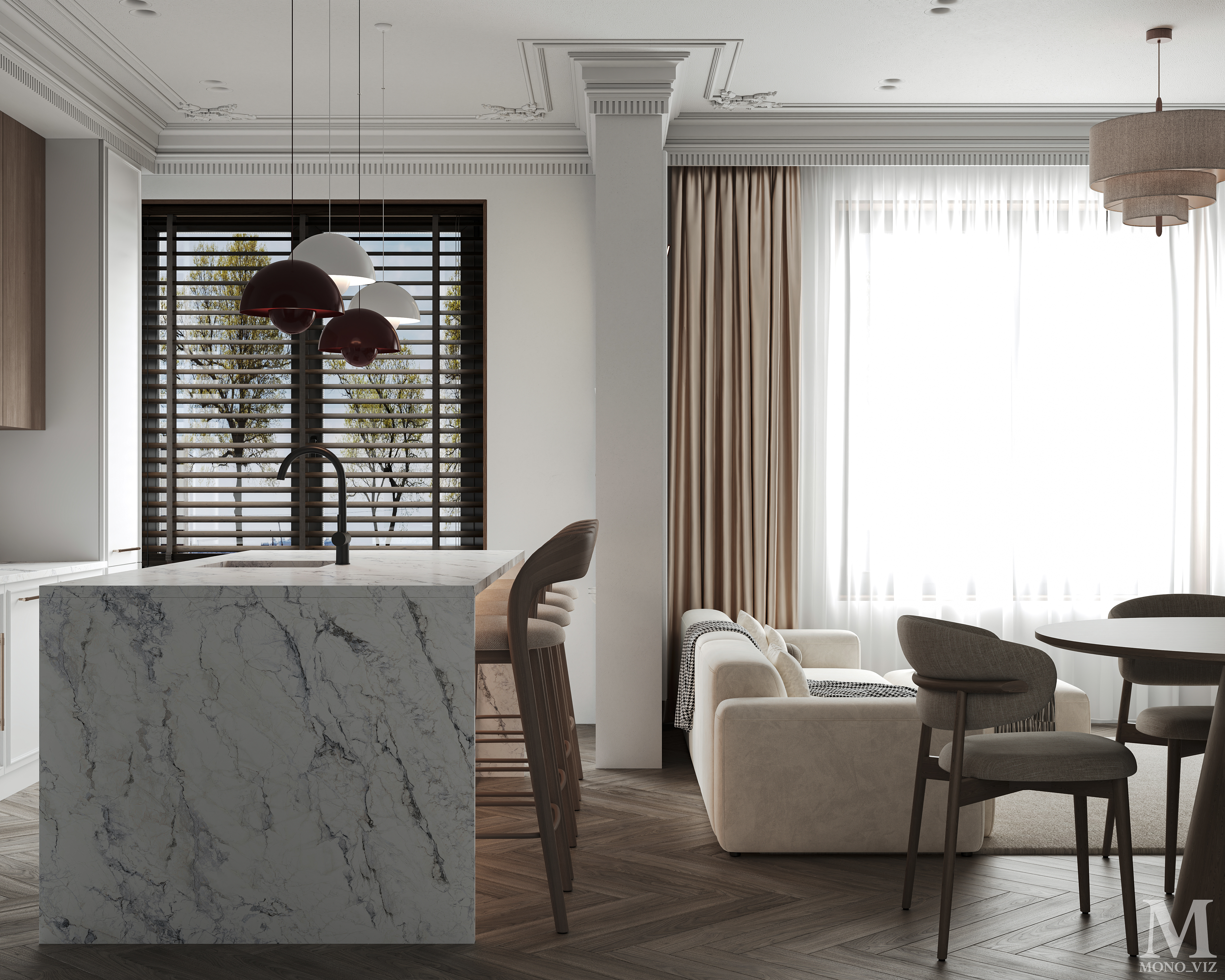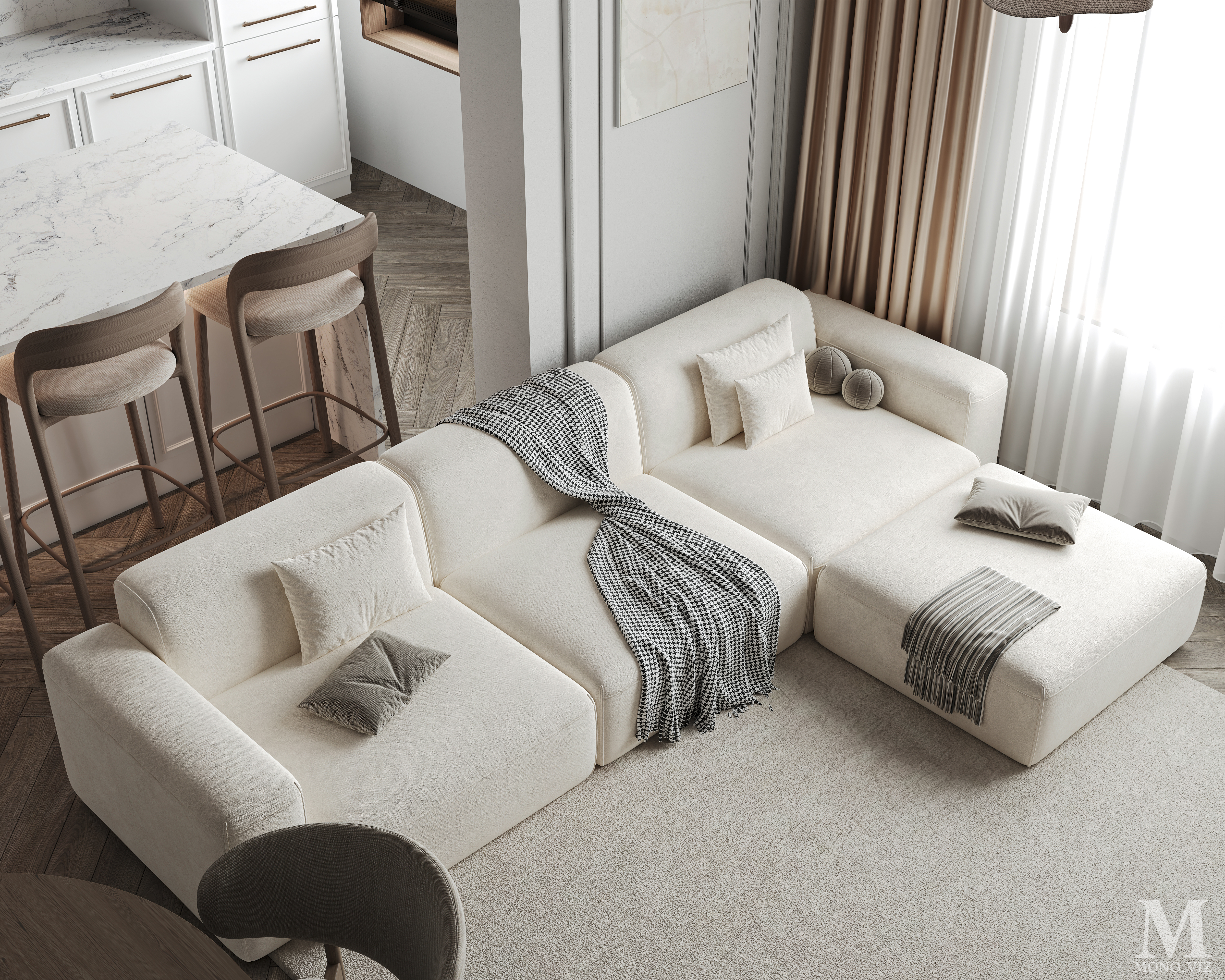 Bright open-plan living room and kitchen in a modern style, featuring a cream sofa, wooden cabinetry, a marble backsplash, and soft natural daylight creating a warm, elegant atmosphere.