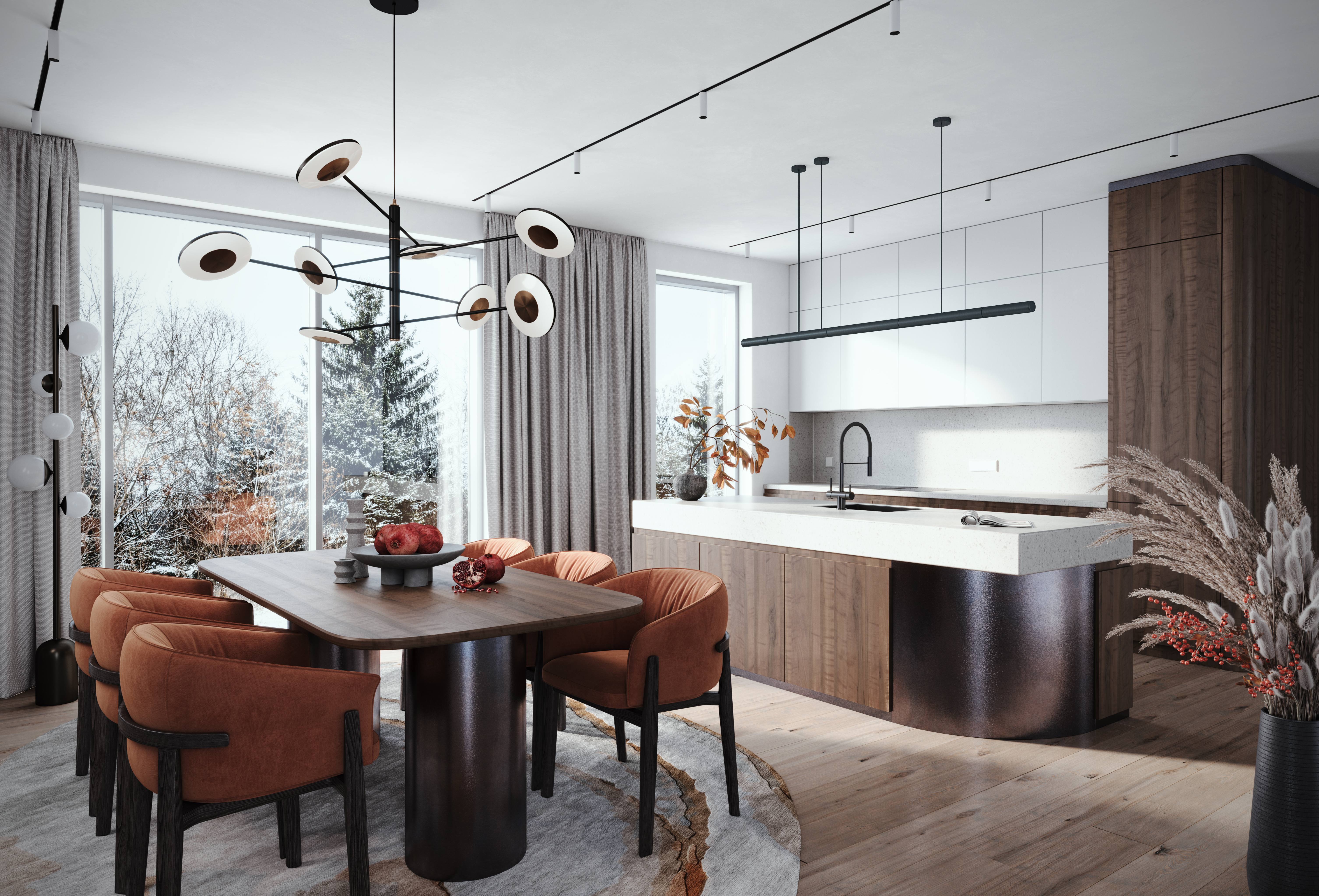 Discover Casa Invierno — where modern design meets cozy warmth. Sleek lines, terracotta tones, and natural wood create a stylish contrast against the snowy backdrop, making this kitchen and dining space the perfect winter retreat..