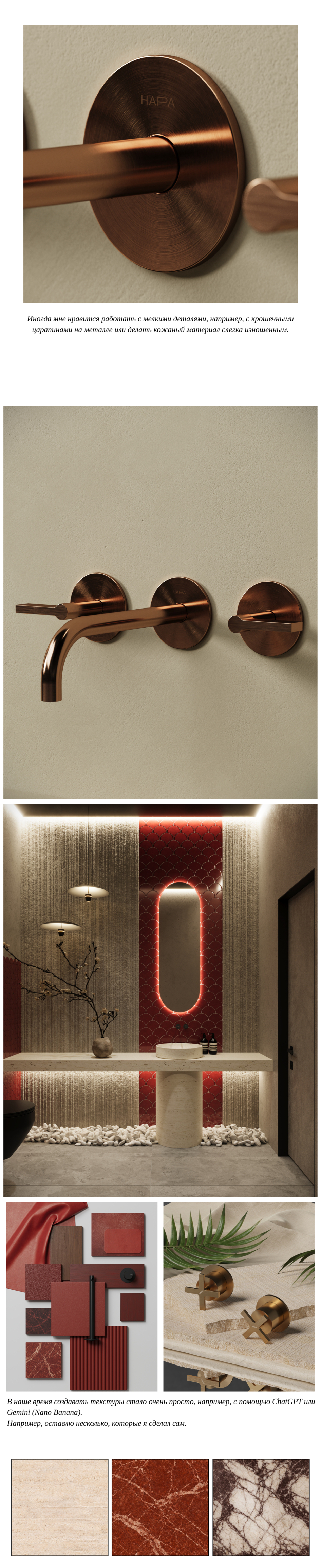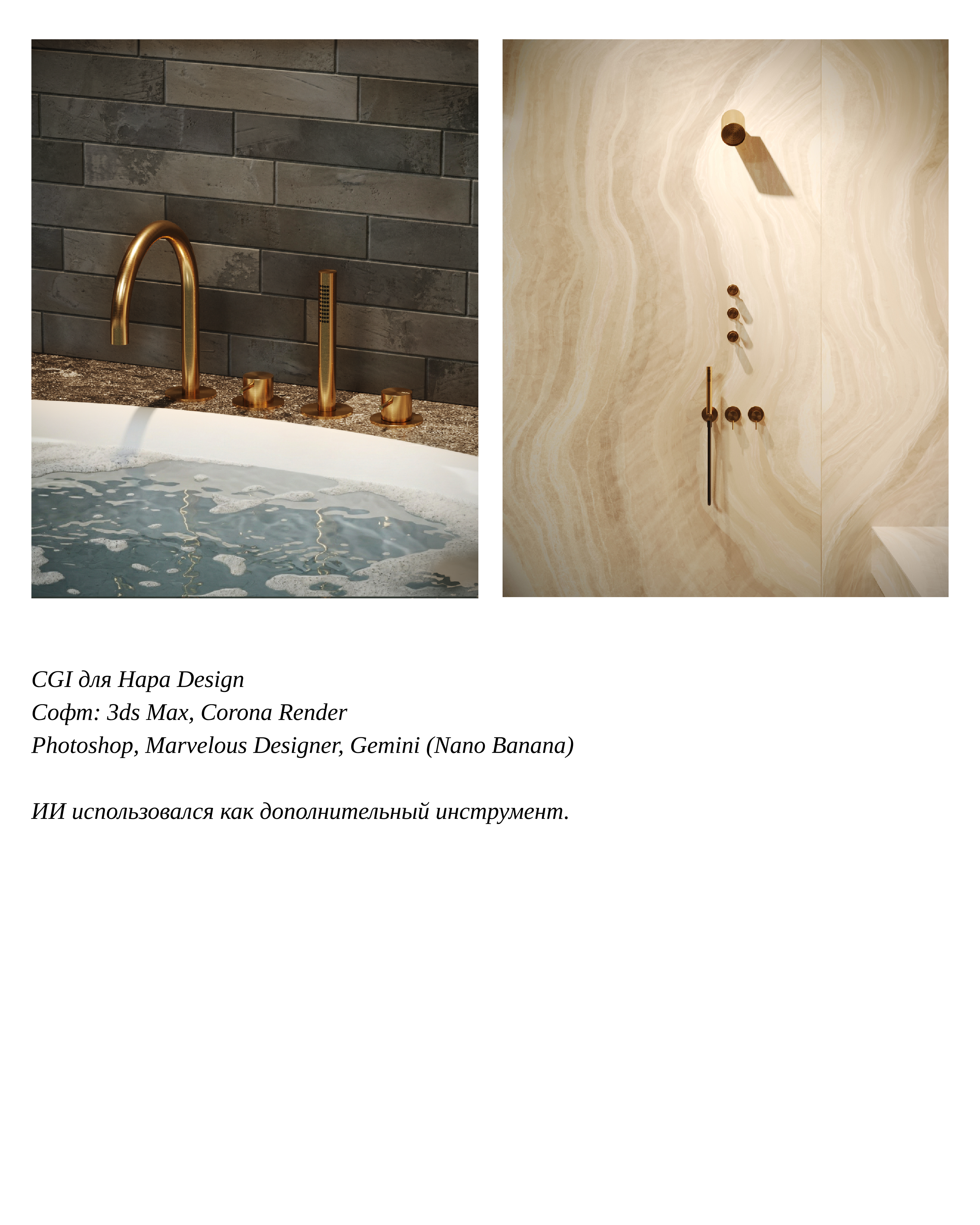 Используемые программы: 3ds Max, Corona Renderer, Marvelous Designer, Photoshop В работе также использовались нейросети ChatGPT и Gemini (Nano Banana) для генерации текстур и оптимизации процесса.